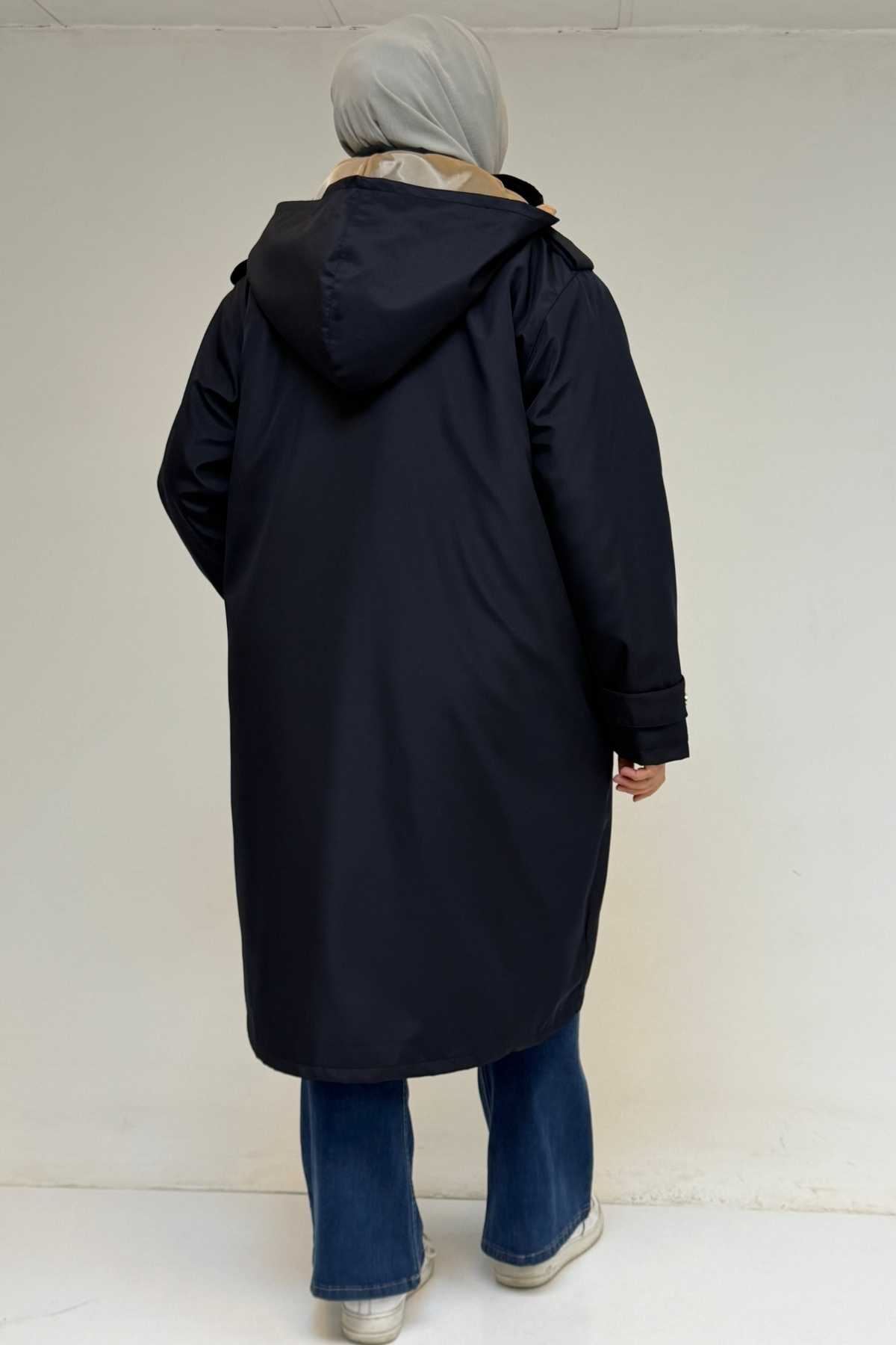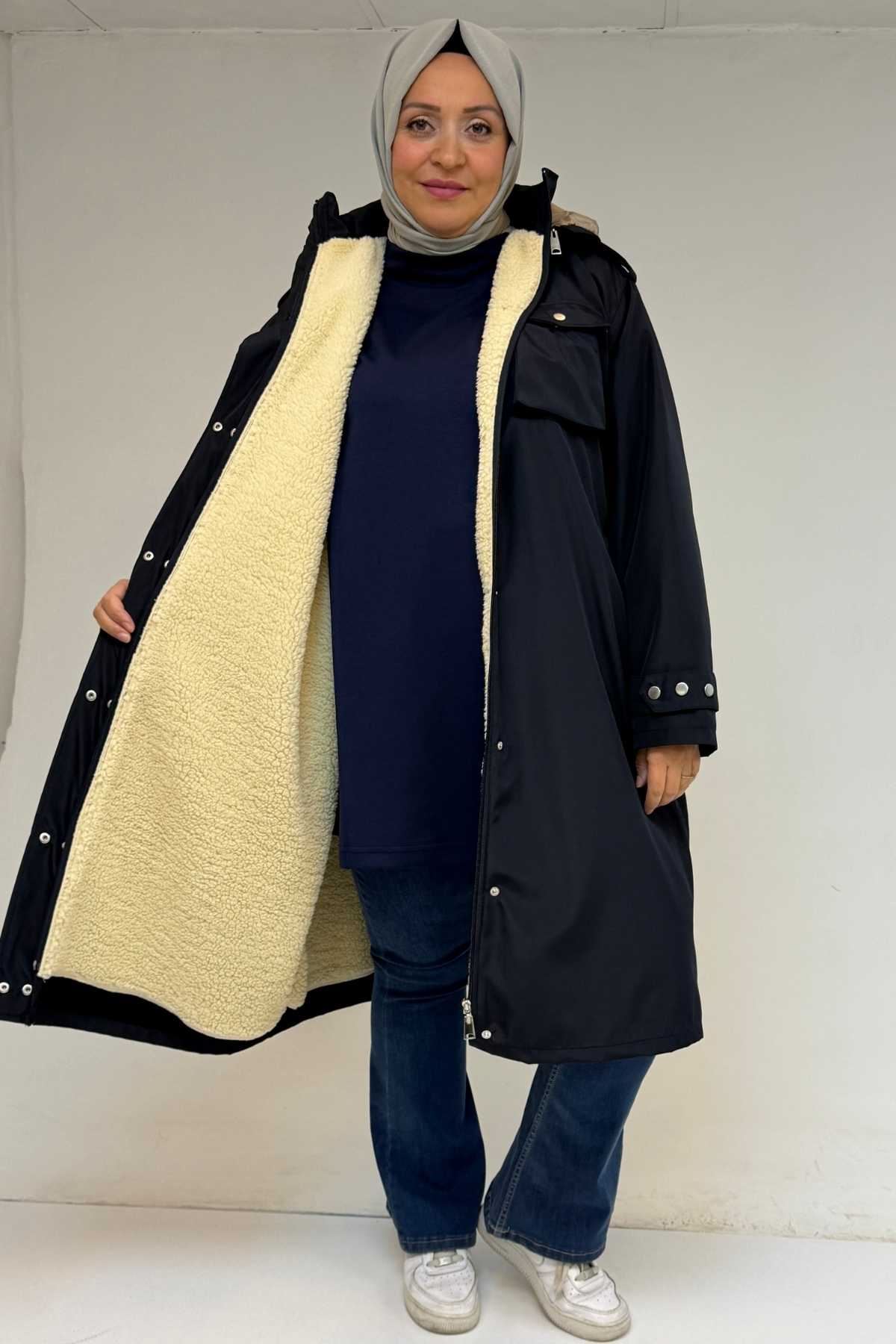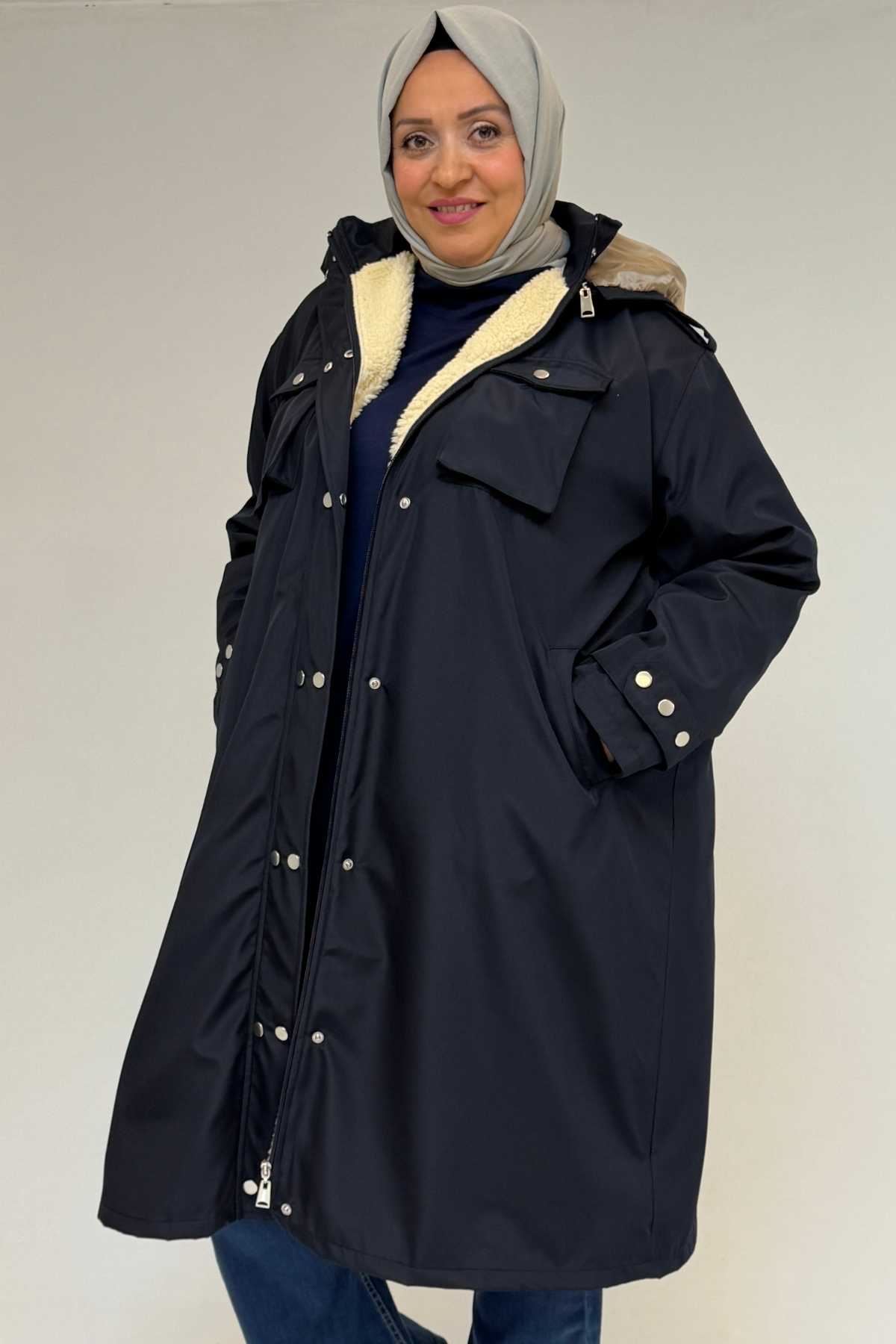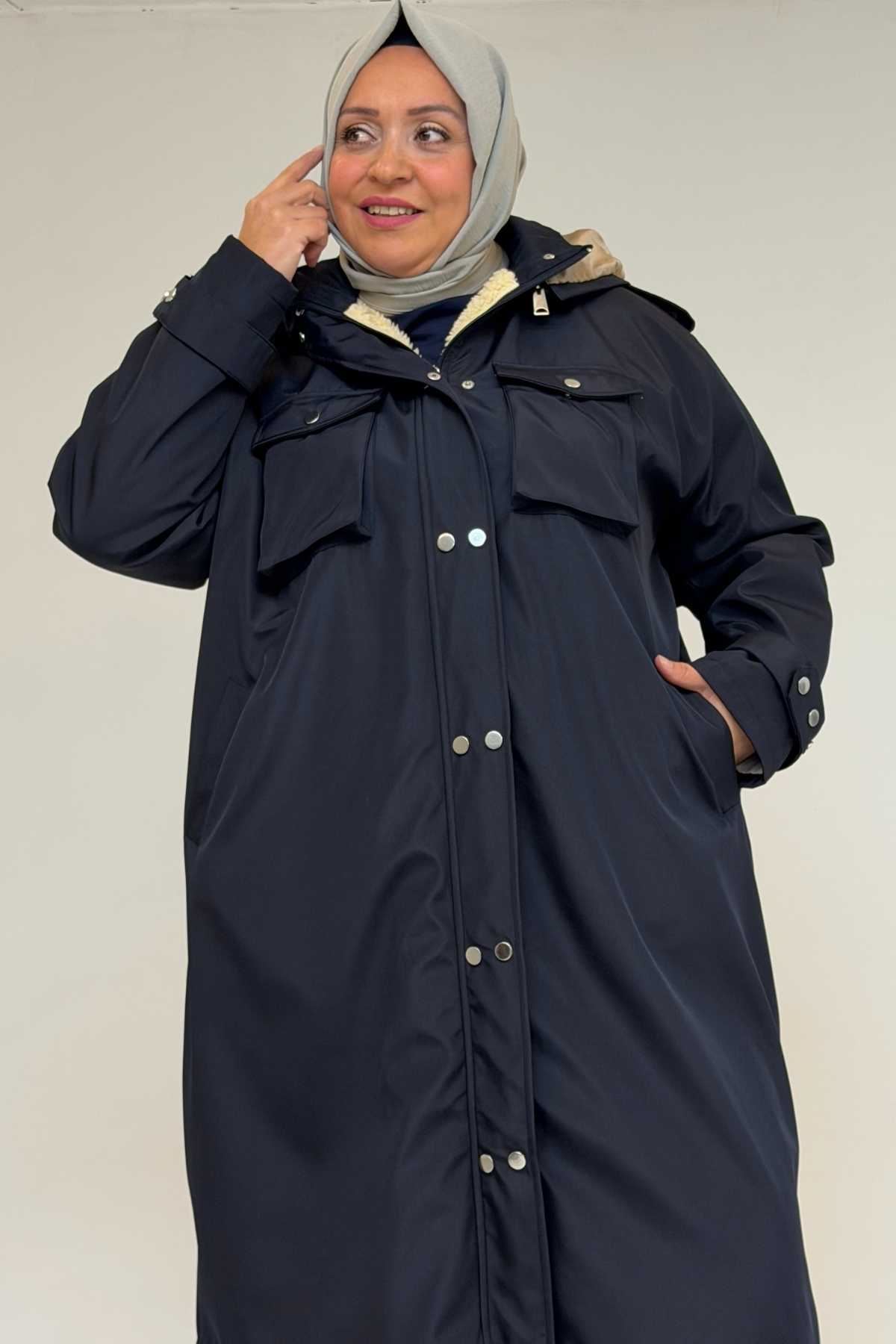 43061 Büyük Beden Kapaklı Cepli Fermuarlı Bondit Kap - Lacivert