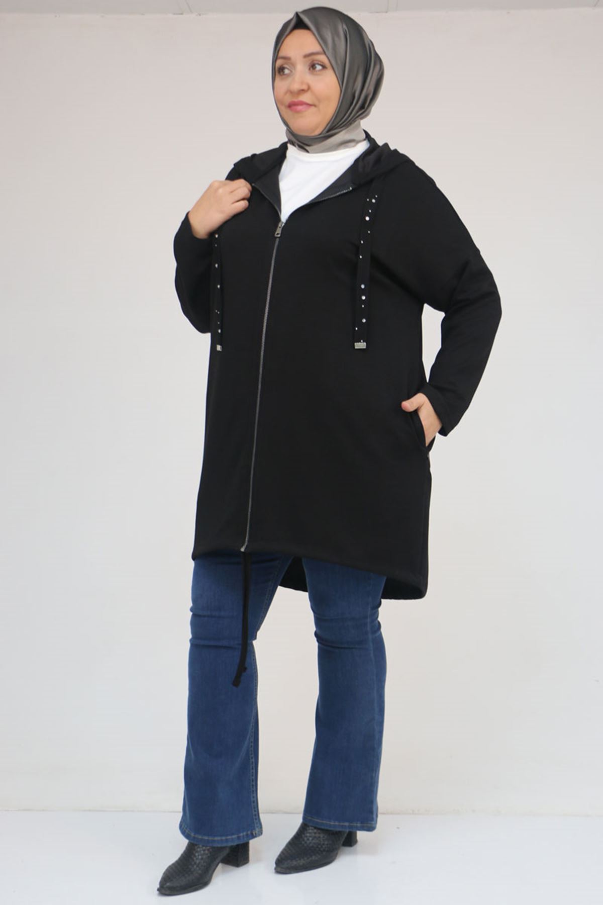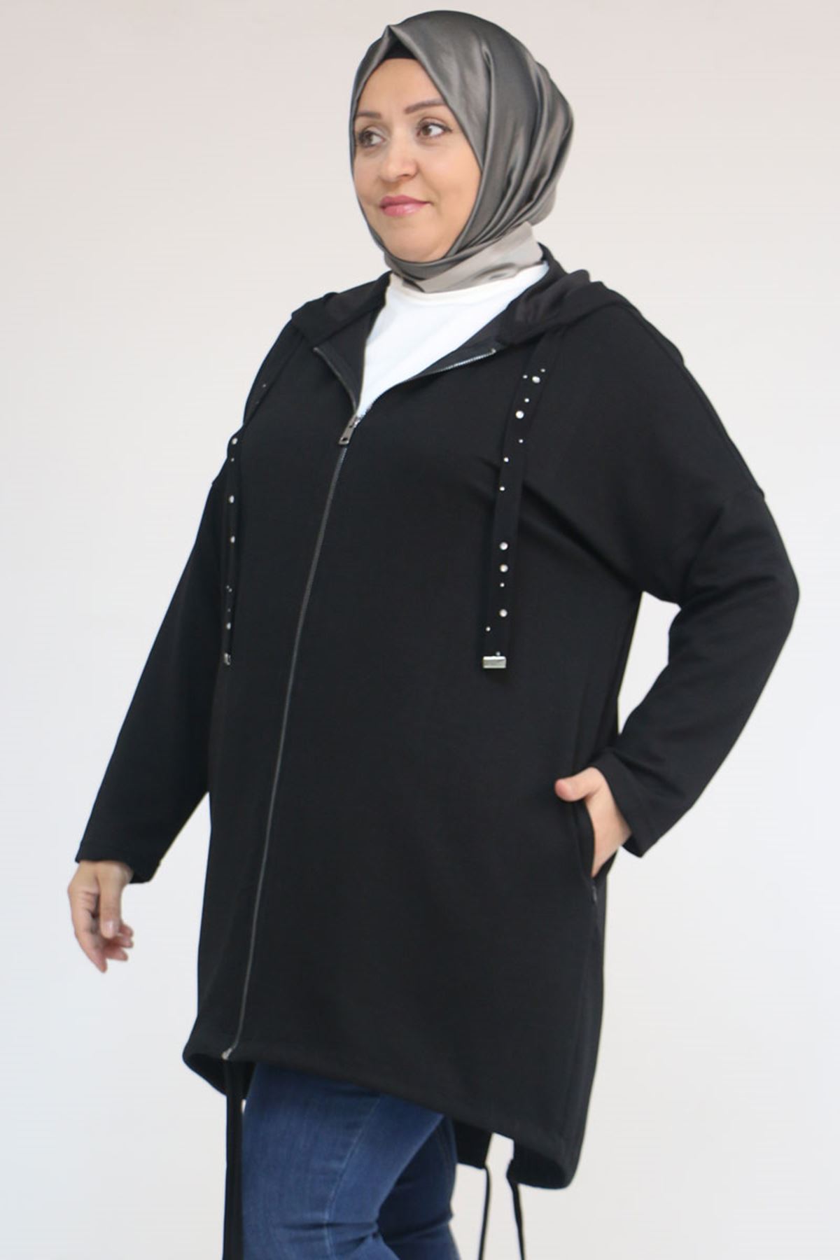 43068 Büyük Beden Eteği Oval Kesim Modal Ceket - Siyah