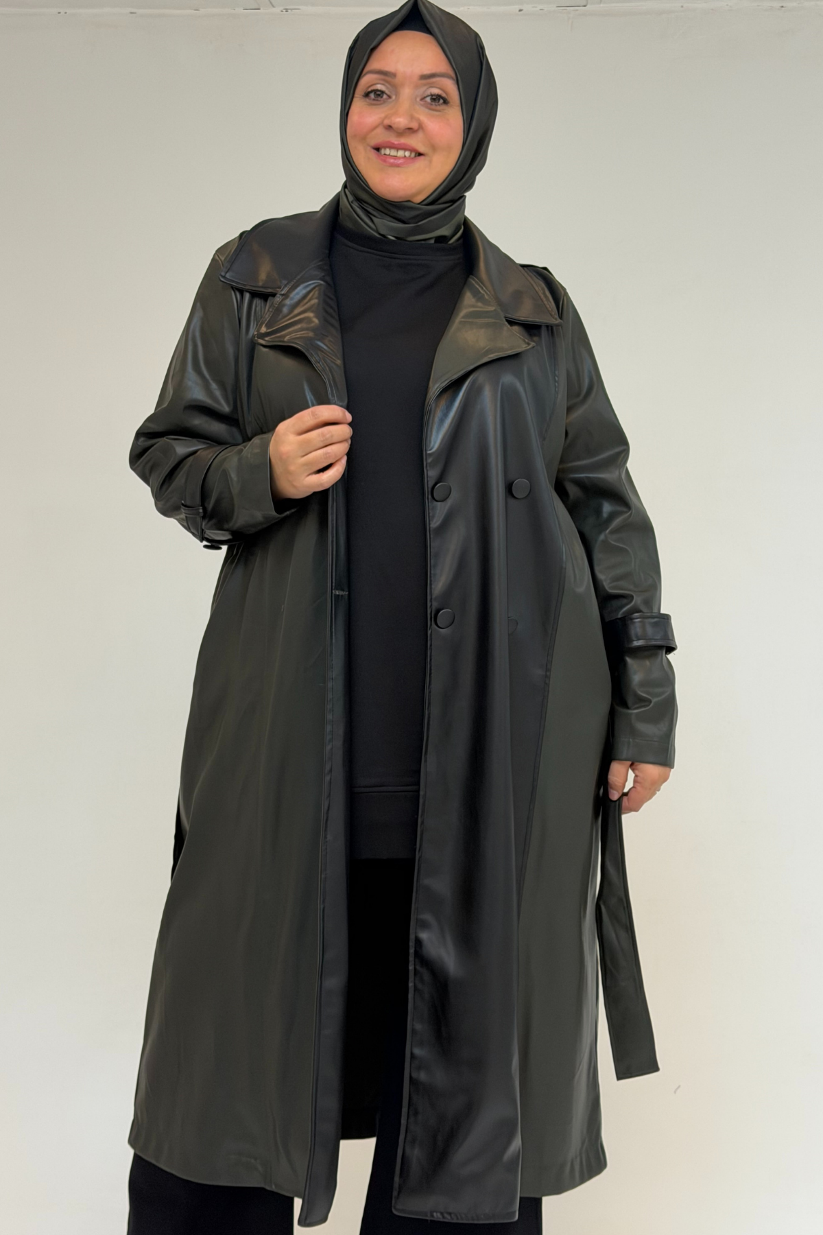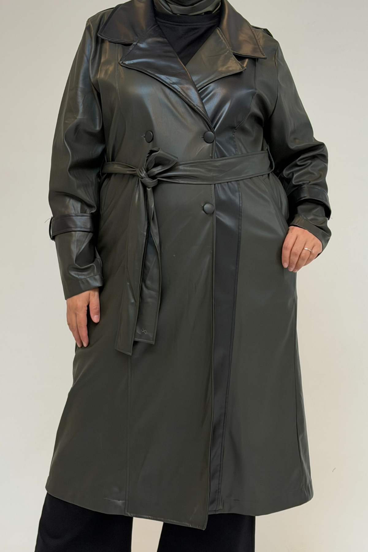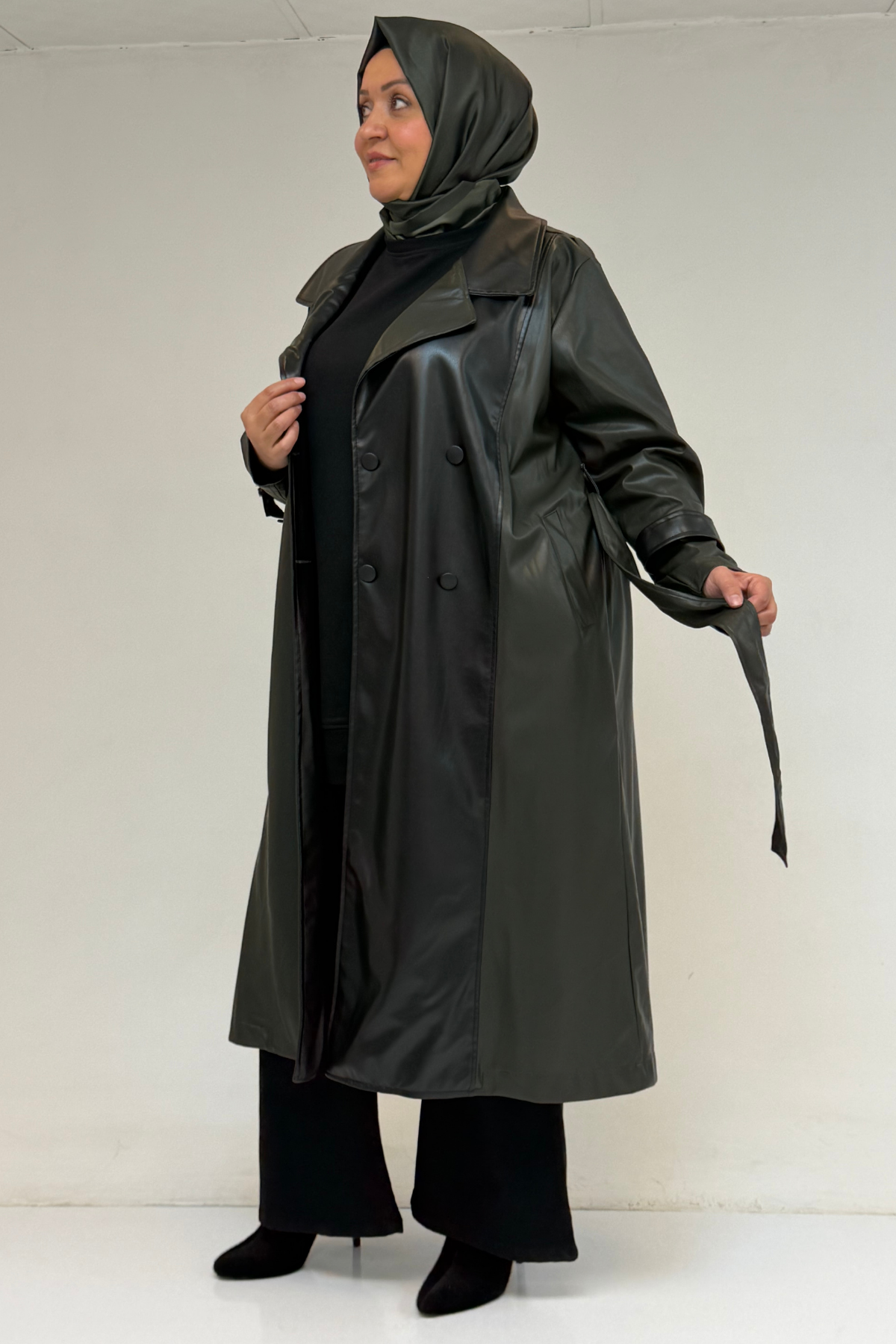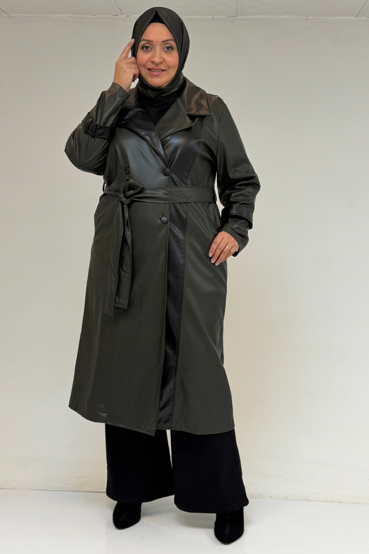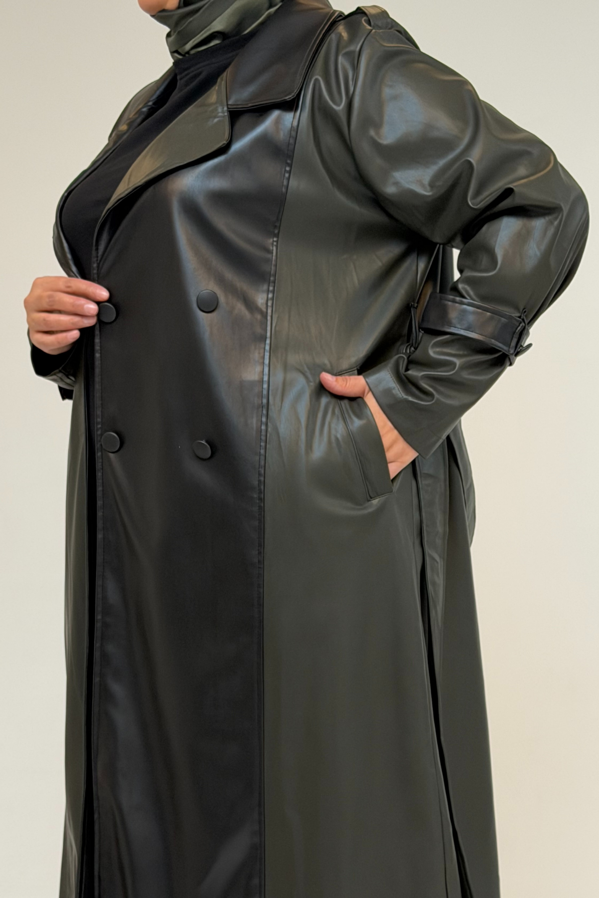 43099 Büyük Beden Deri Kombinli Düğmeli Kap - Haki