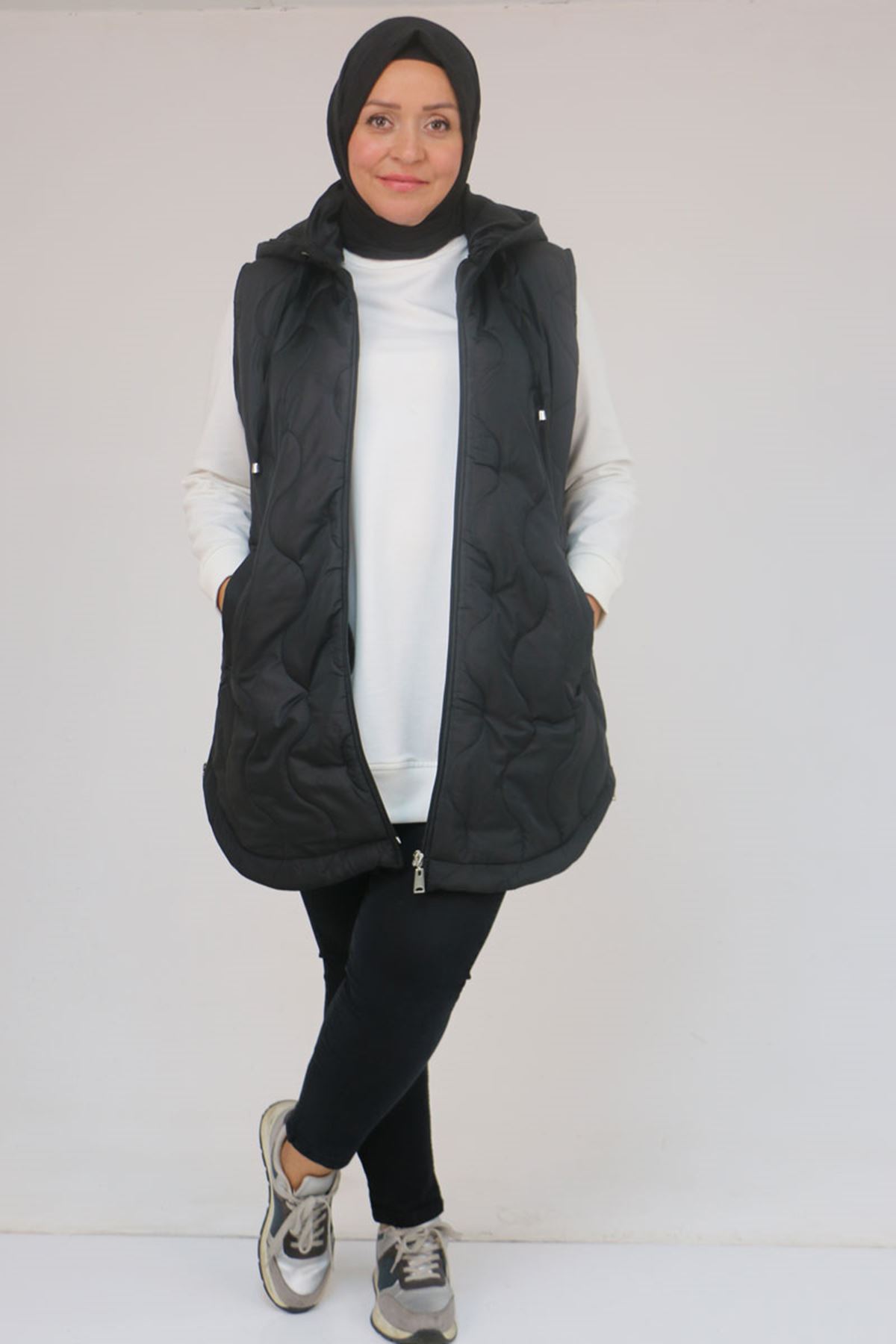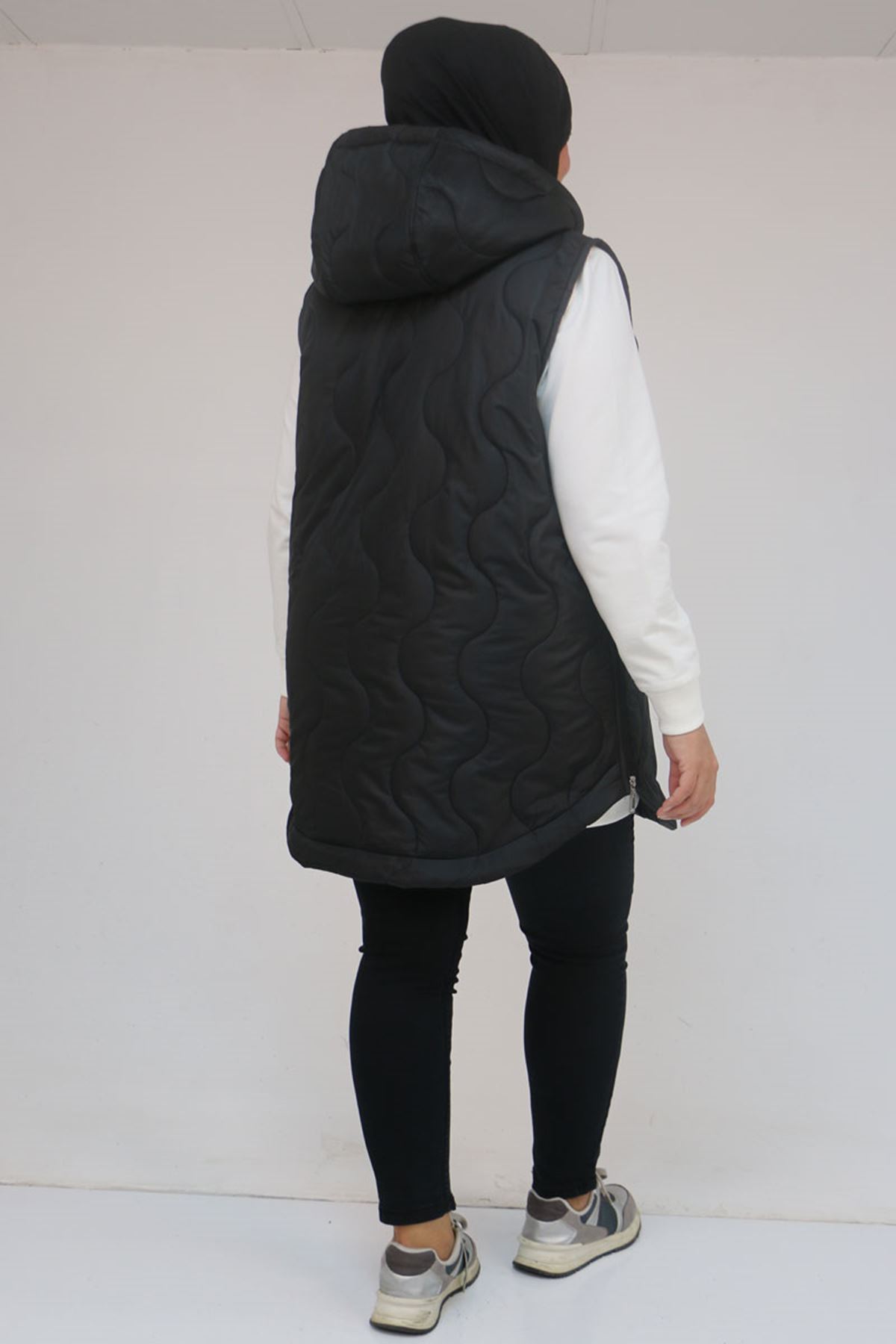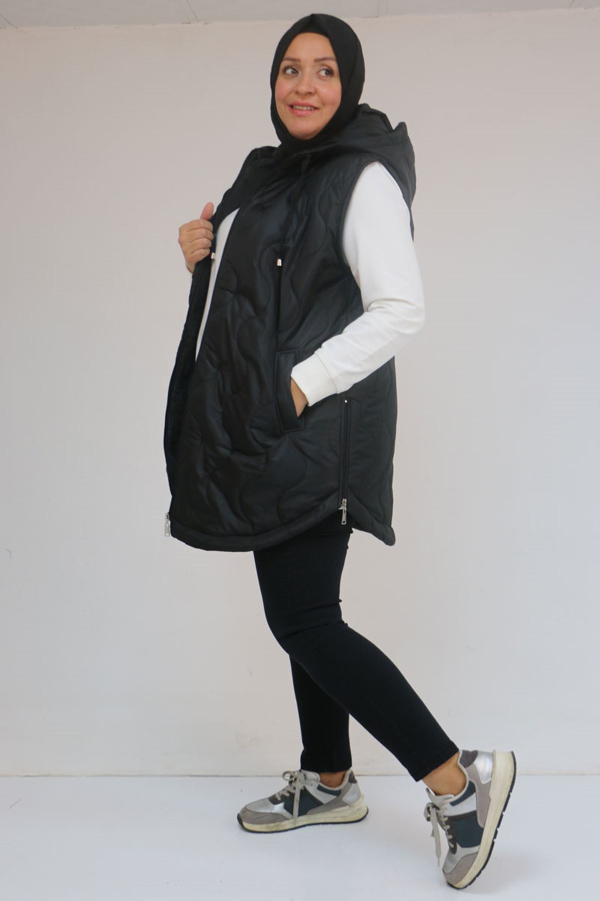 44007 Büyük Beden Yanı Yırtaçlı Oval Kesim Kapitone Yelek - Siyah
