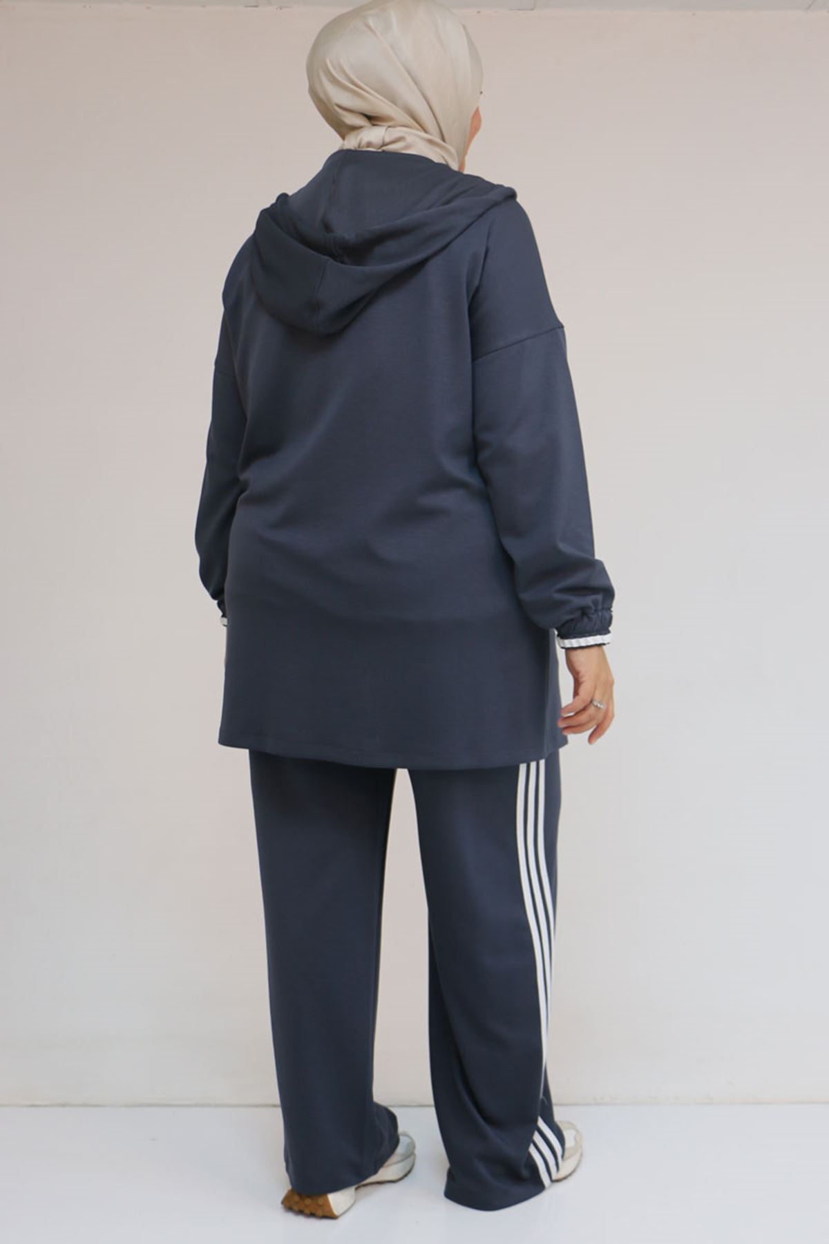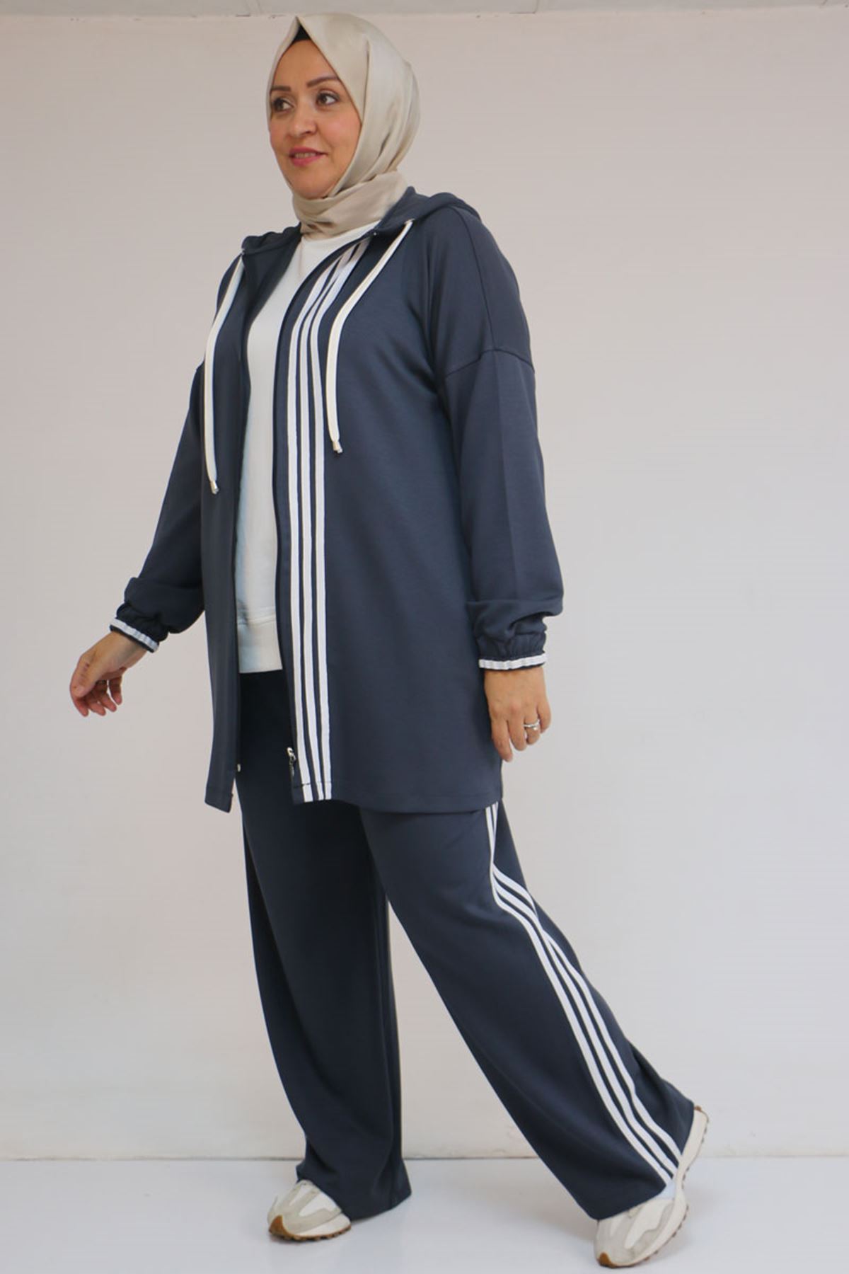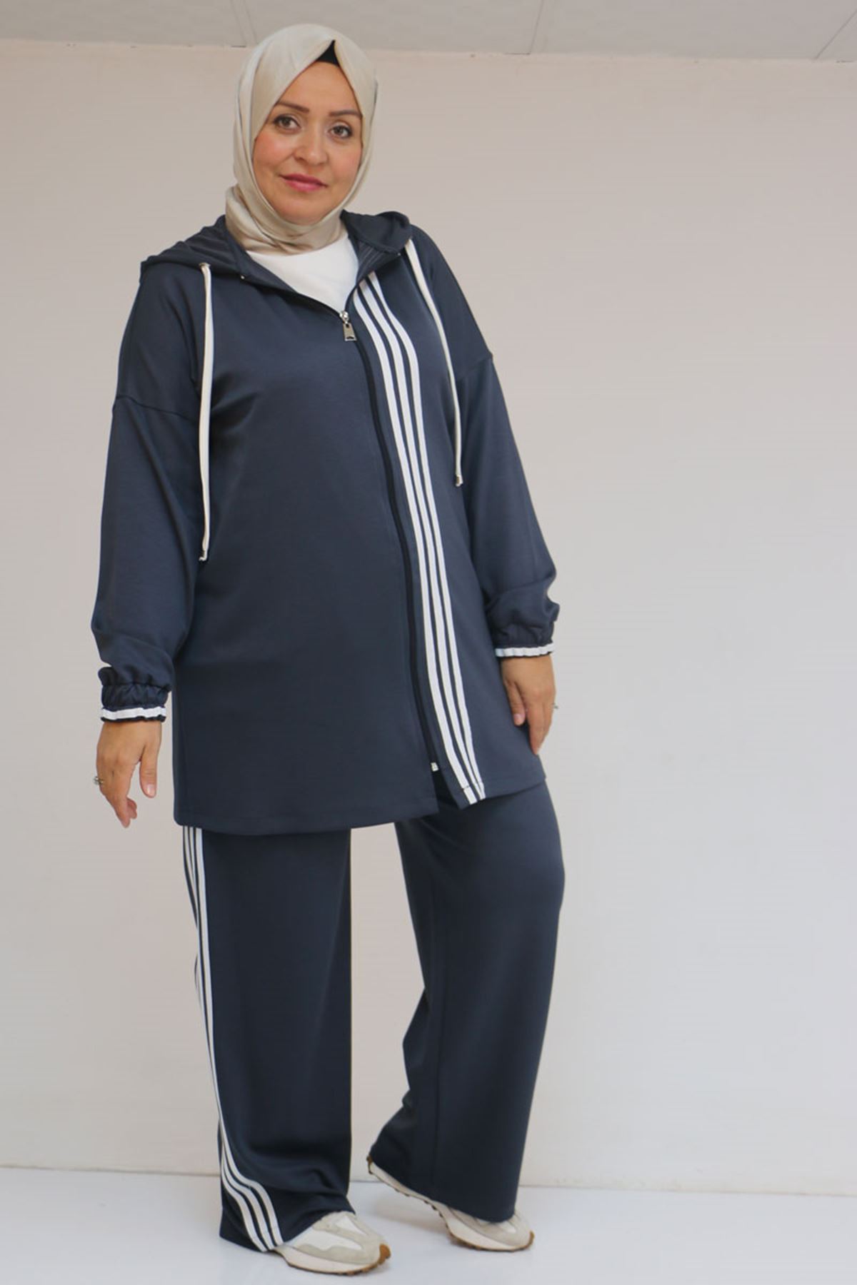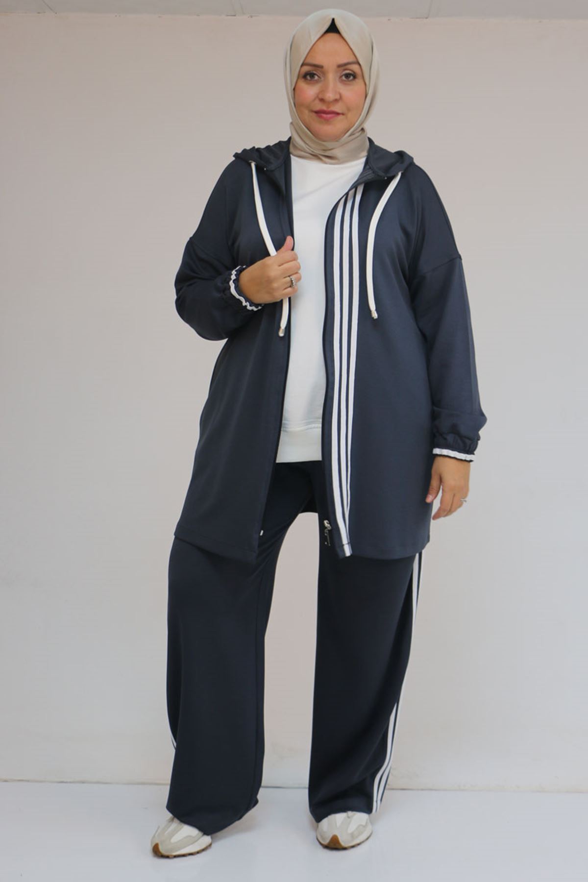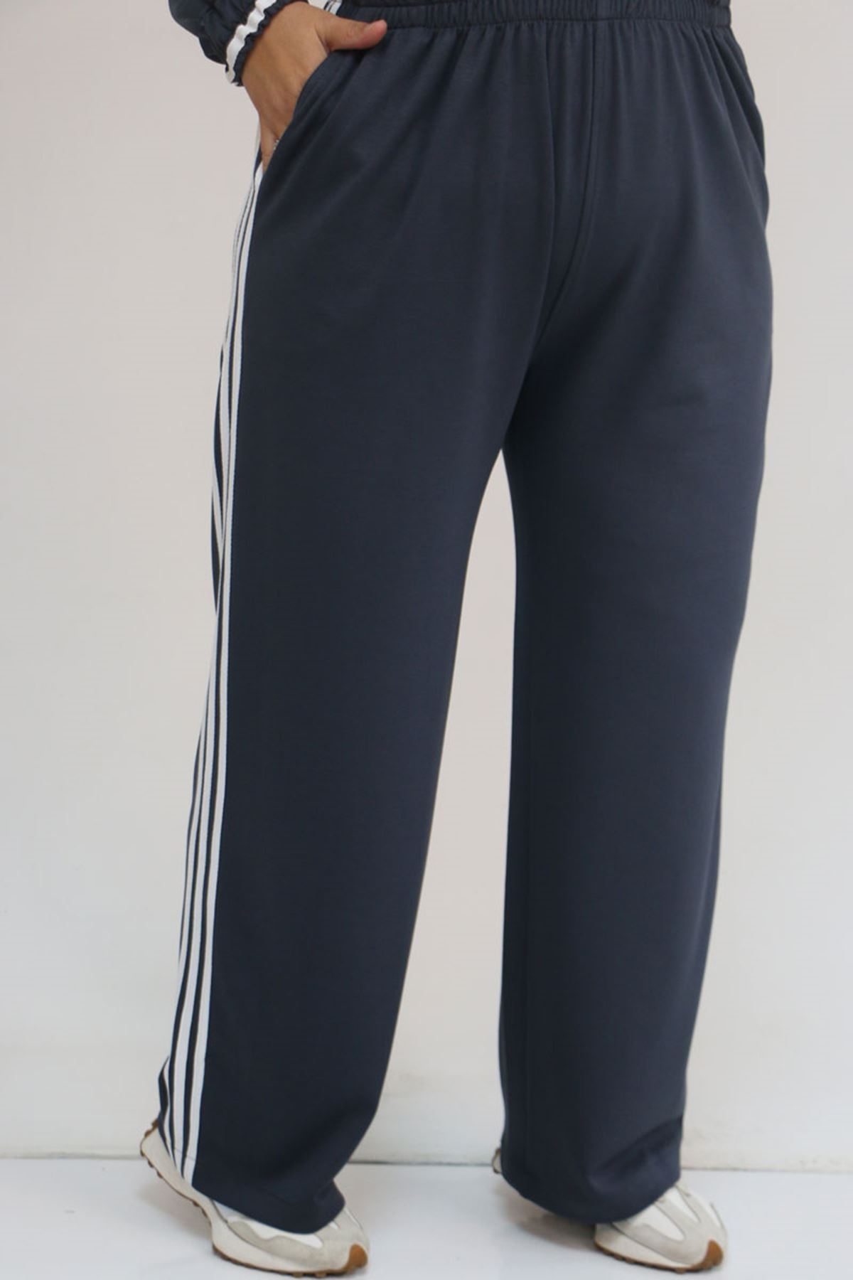 47058 Büyük Beden Şerit Detaylı Modal Pantolonlu Takım - Antrasit