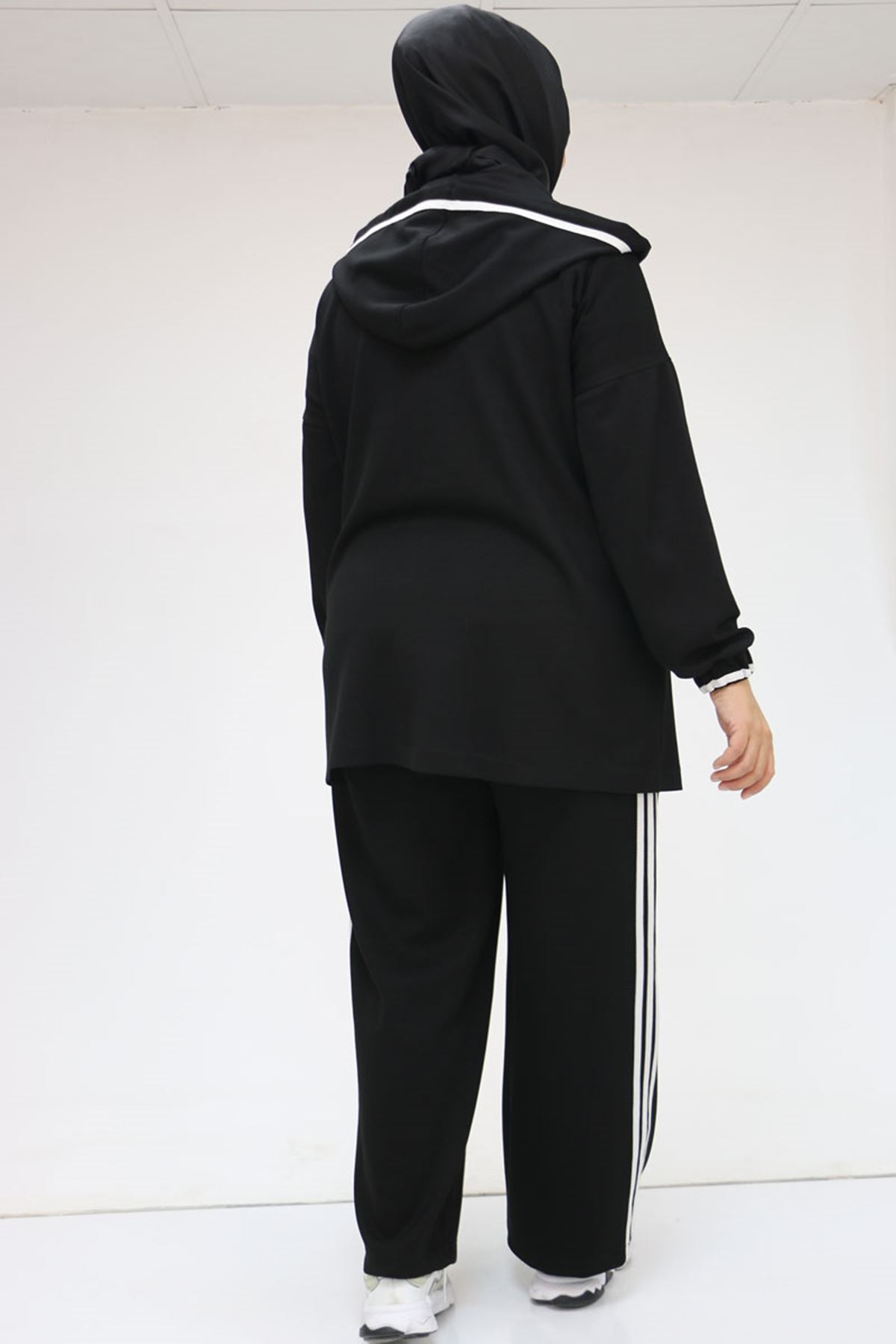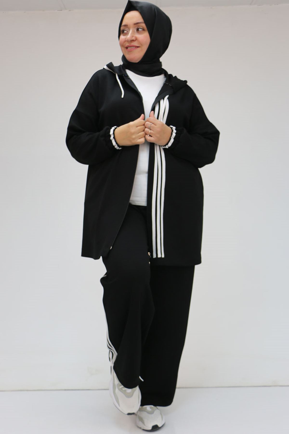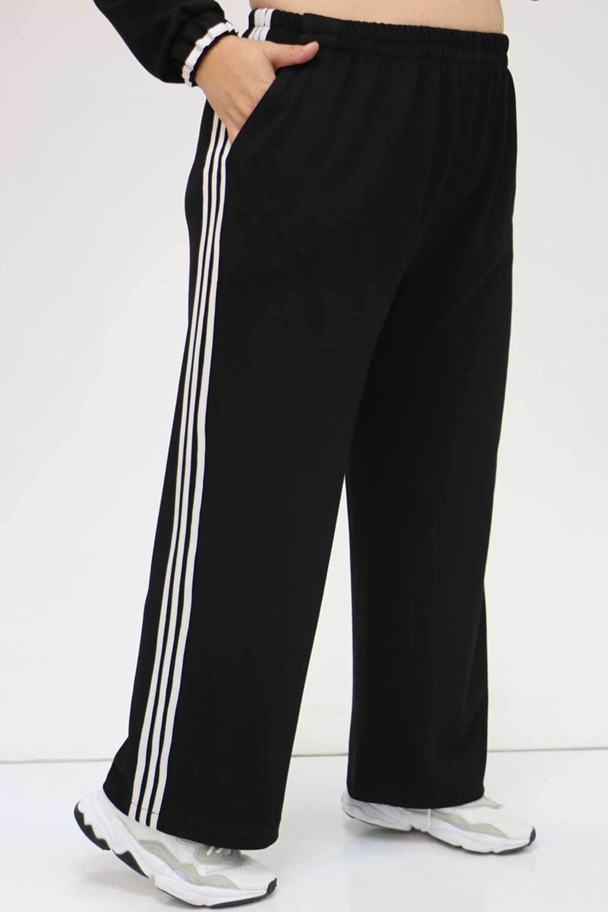 47058 Büyük Beden Şerit Detaylı Modal Pantolonlu Takım - Siyah