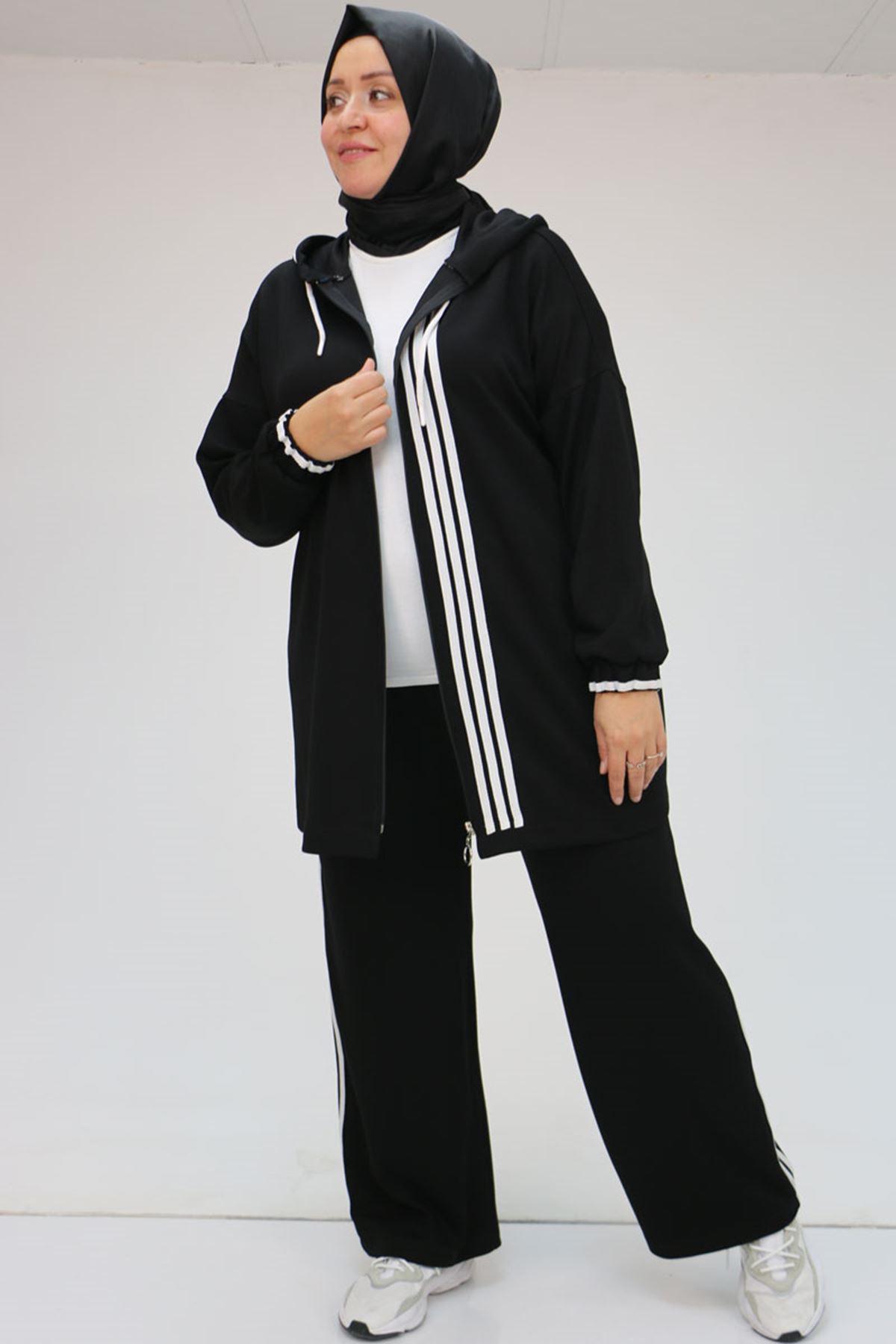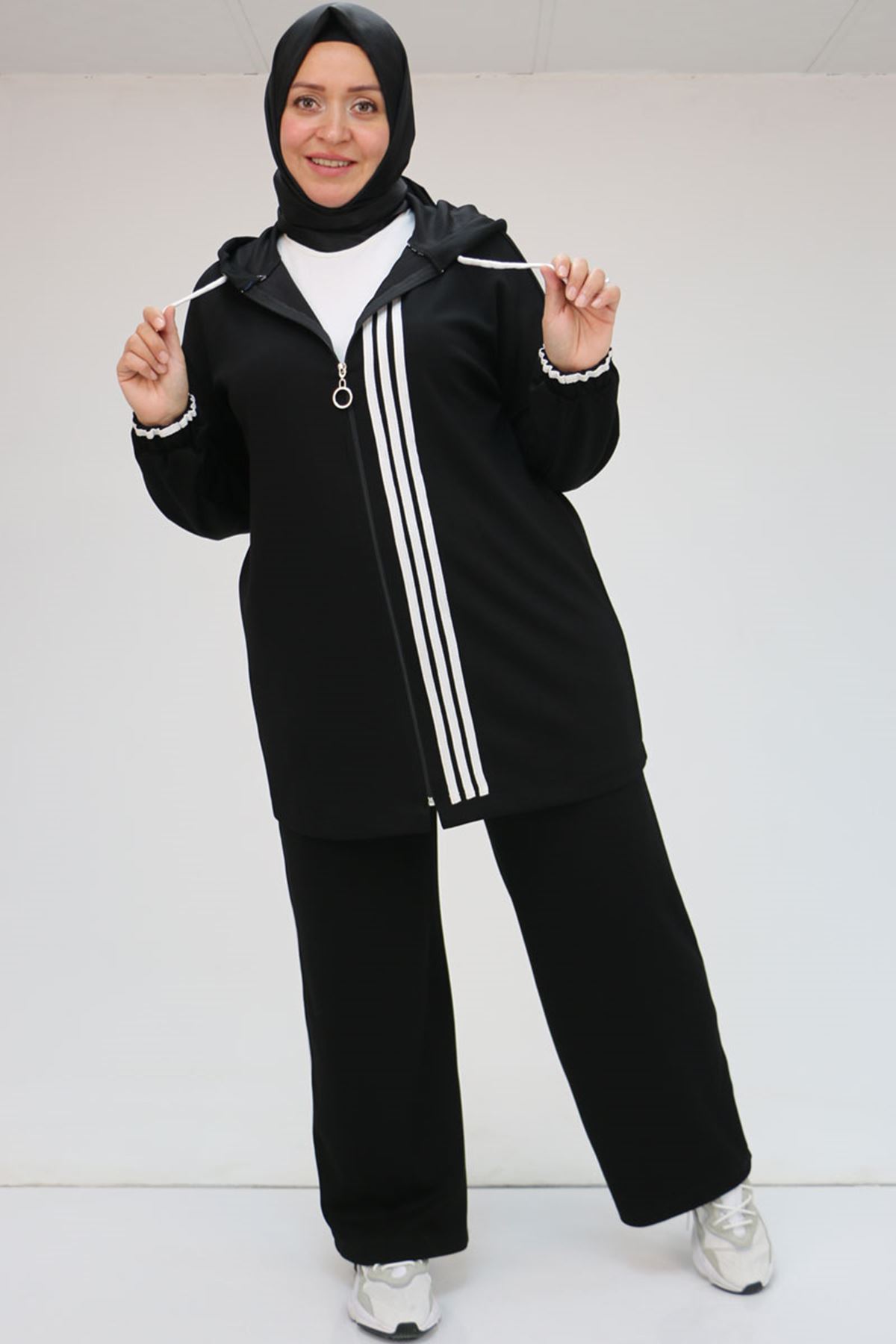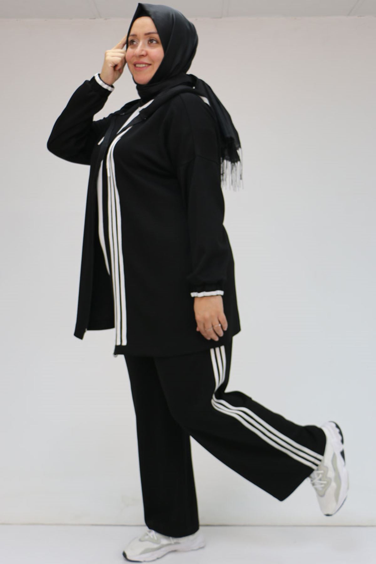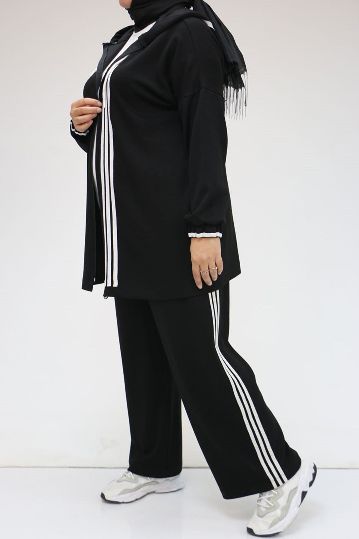 47058 Büyük Beden Şerit Detaylı Modal Pantolonlu Takım - Siyah
