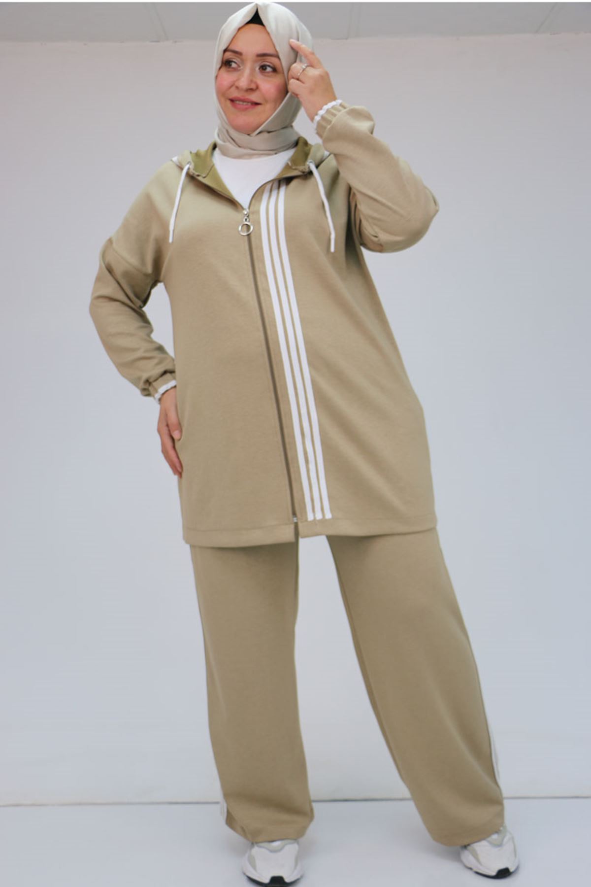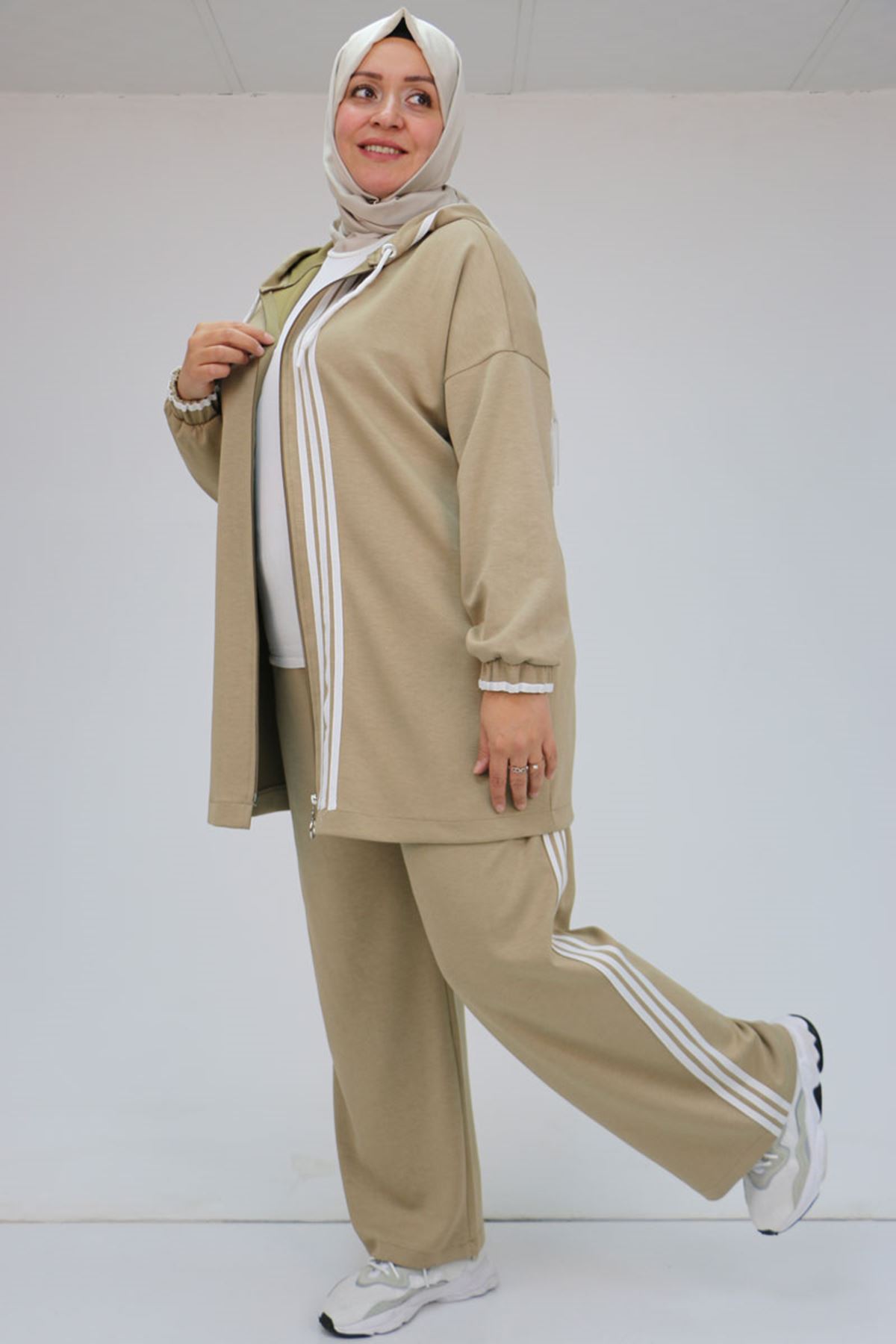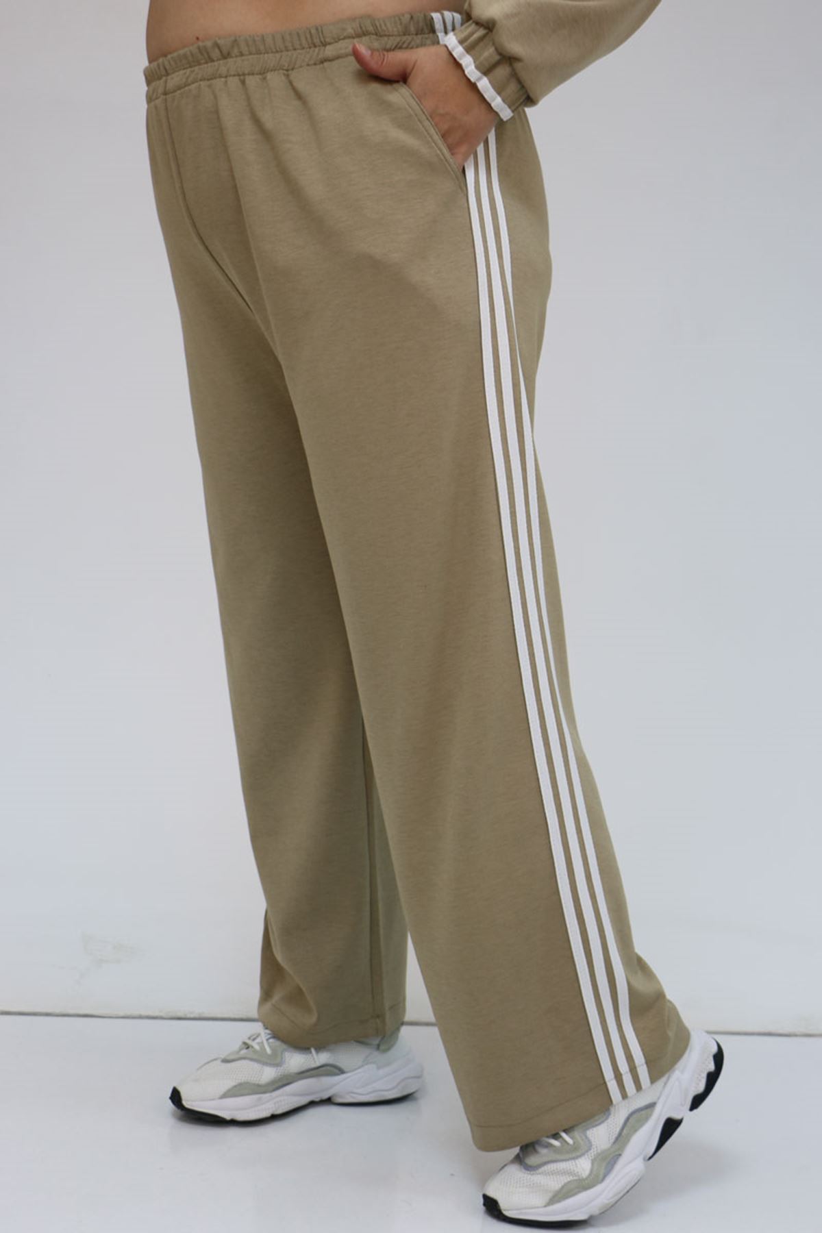 47058 Büyük Beden Şerit Detaylı Modal Pantolonlu Takım - BEJ