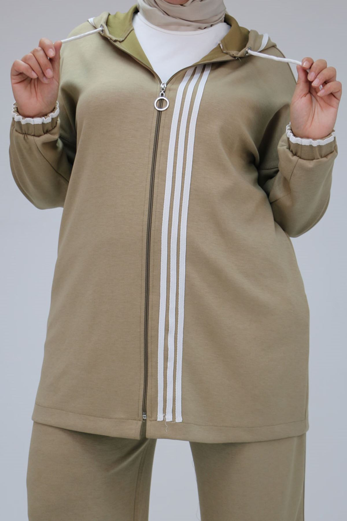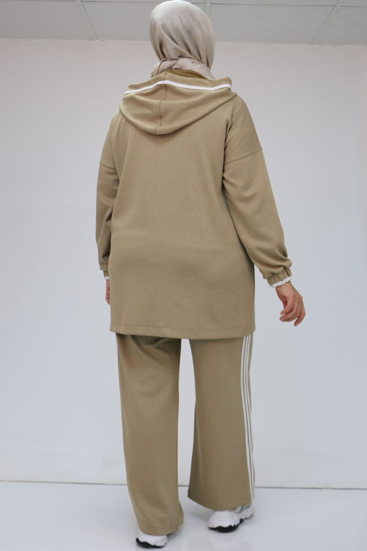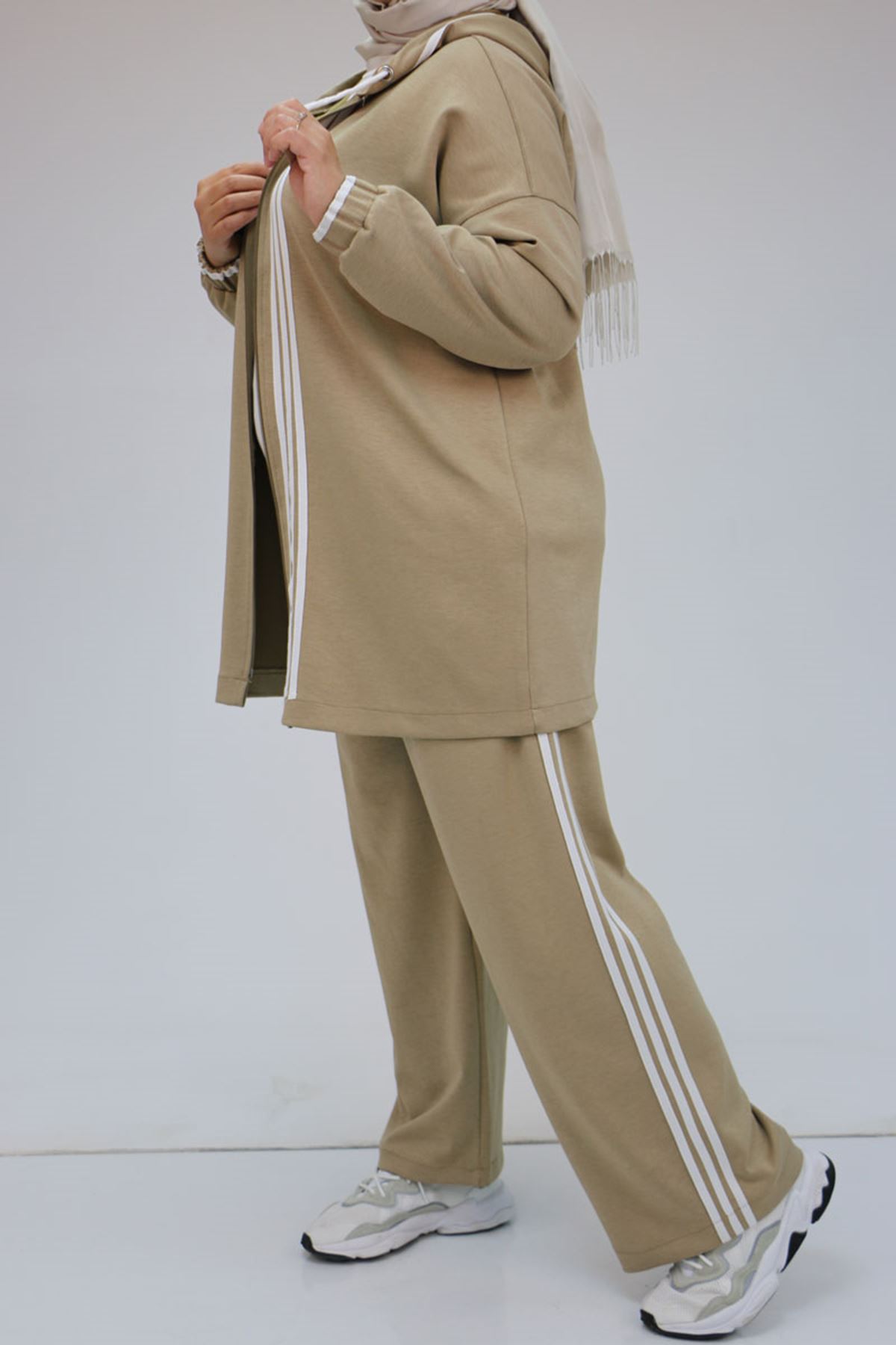 47058 Büyük Beden Şerit Detaylı Modal Pantolonlu Takım - BEJ