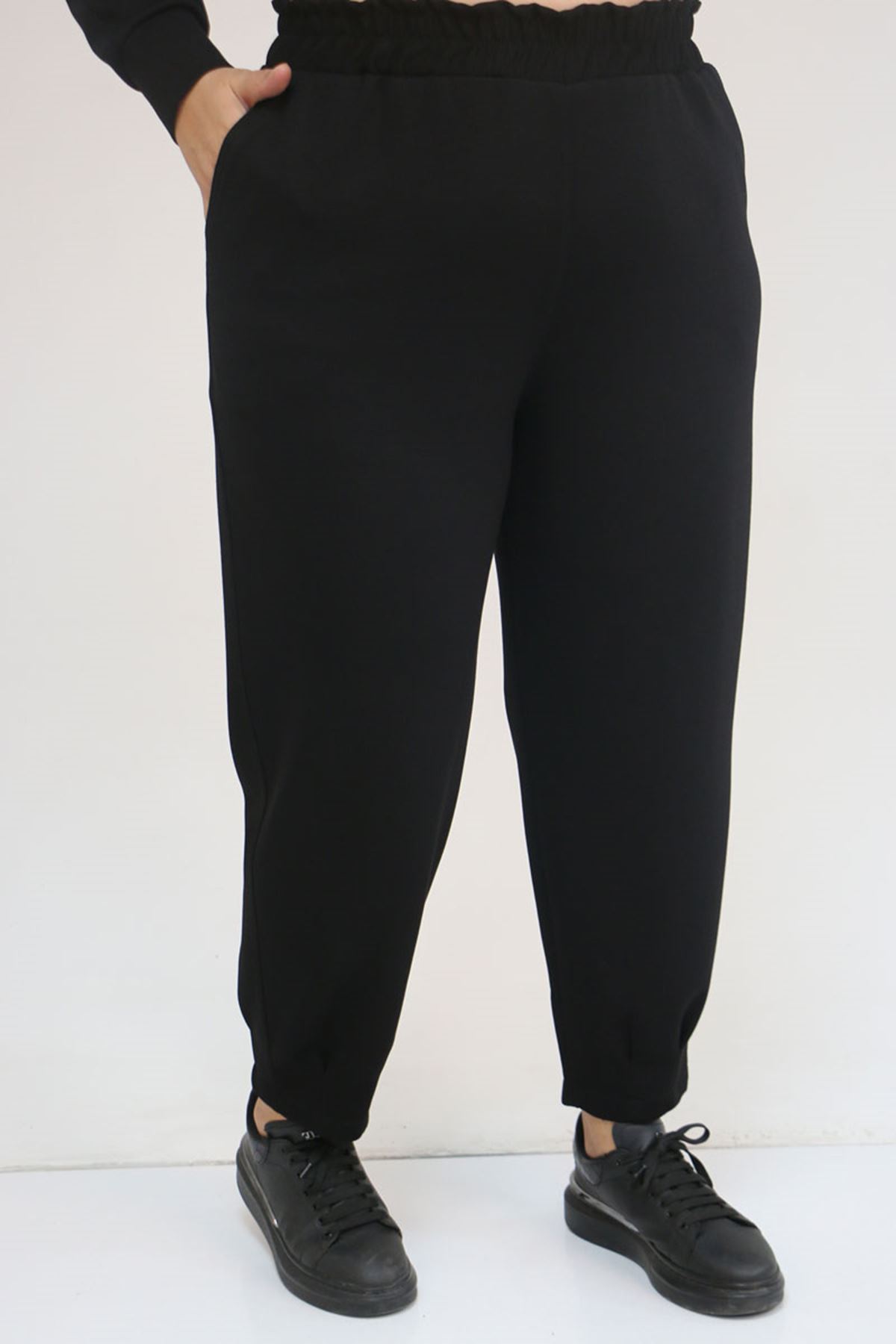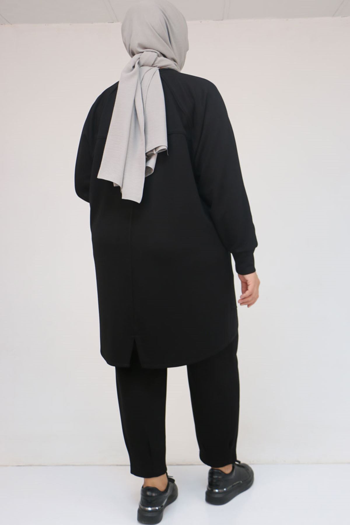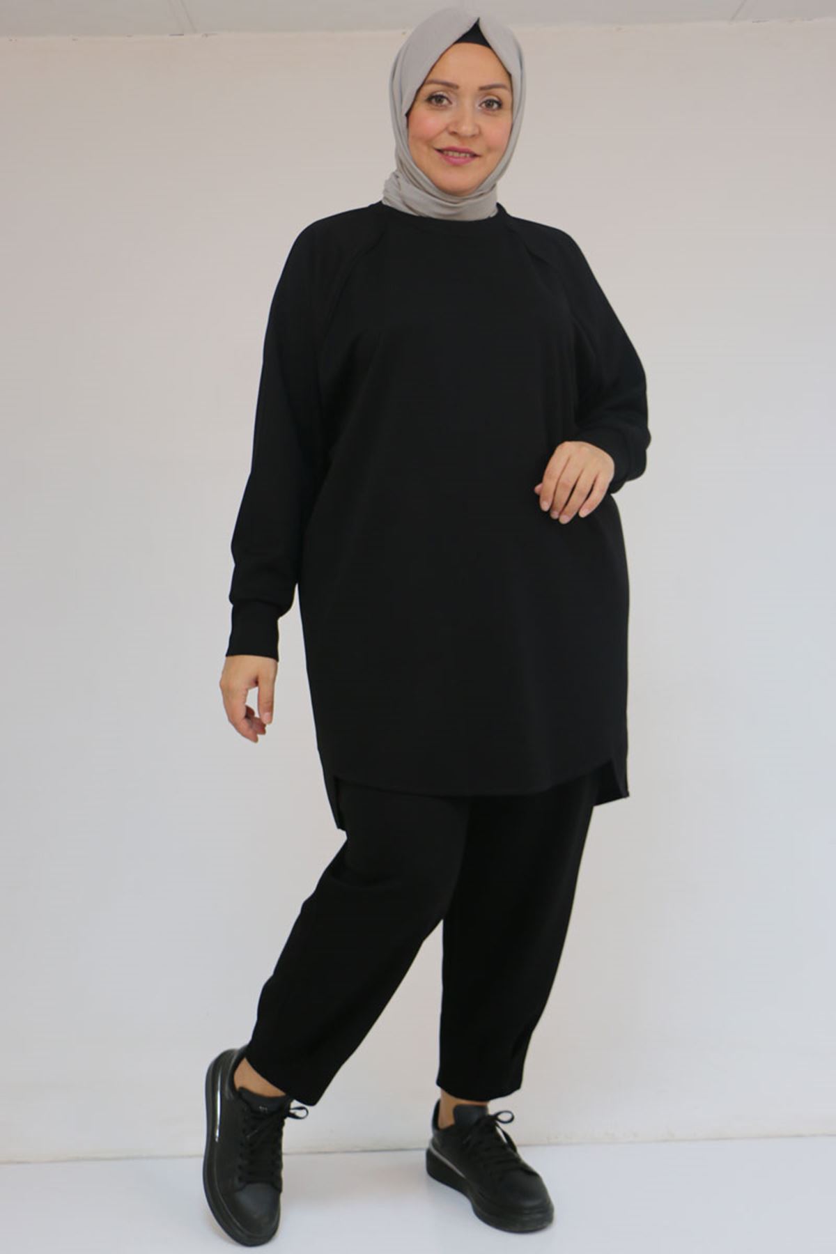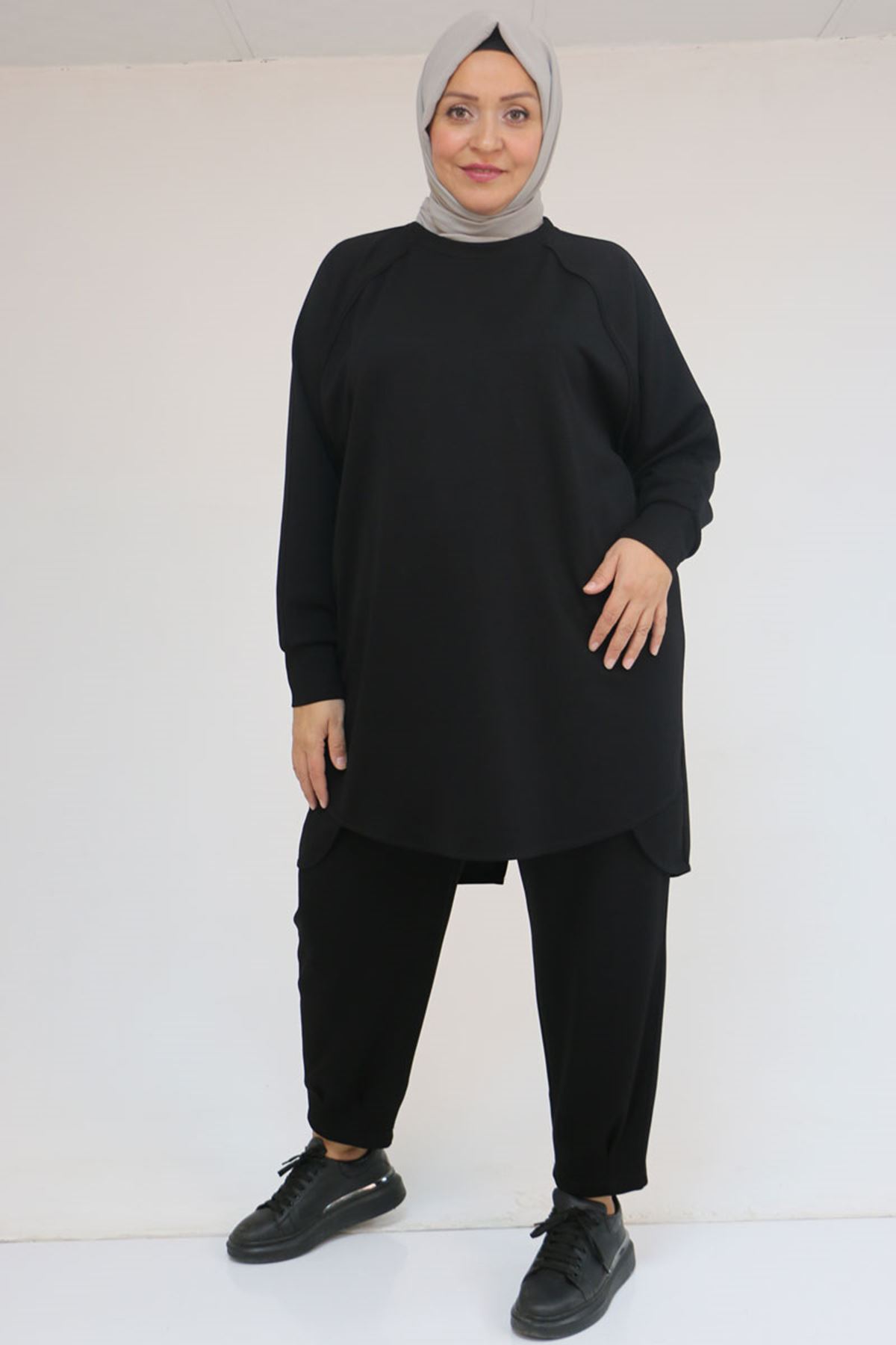 47093 Büyük Beden Eteği Parça Detaylı Pantolonlu Modal Takım - Siyah