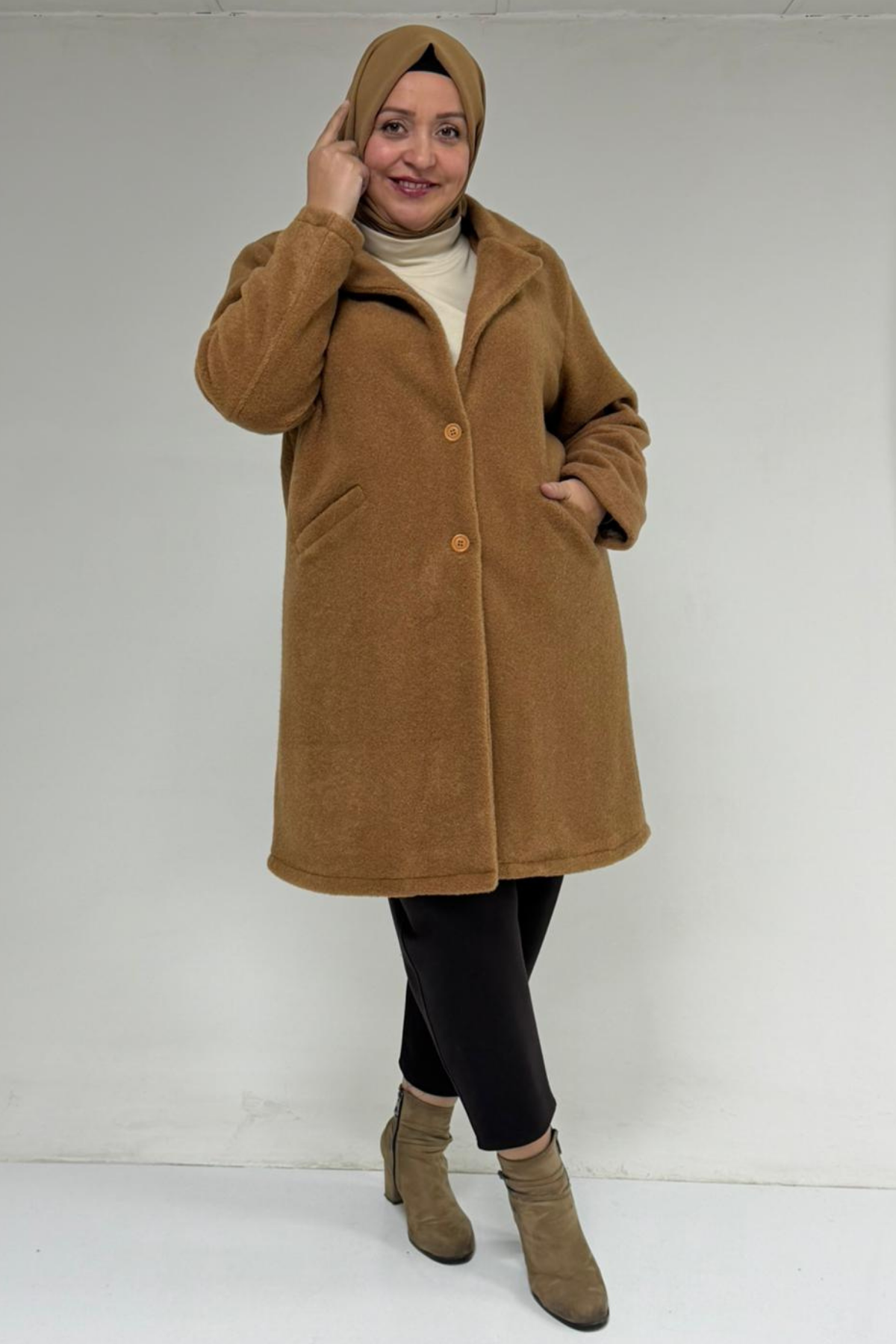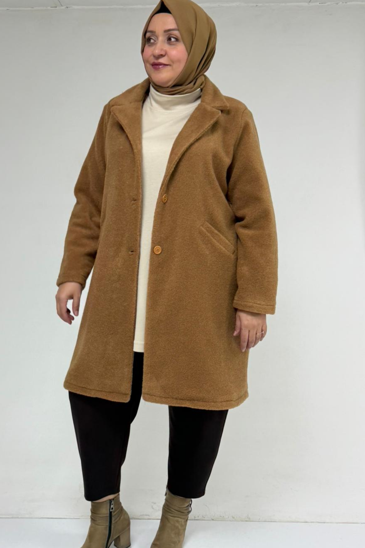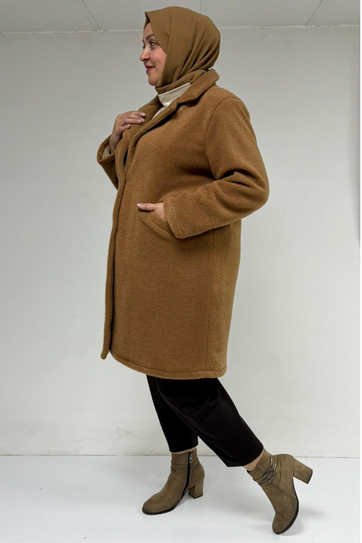 53051 Büyük Beden Keçe Kaban - Taba