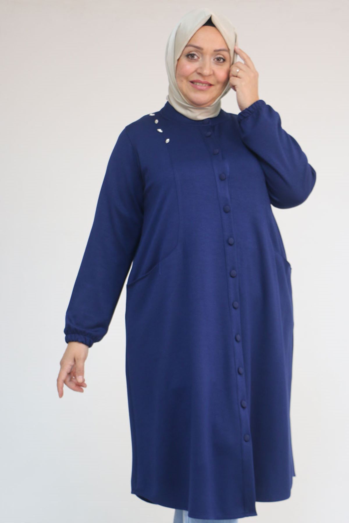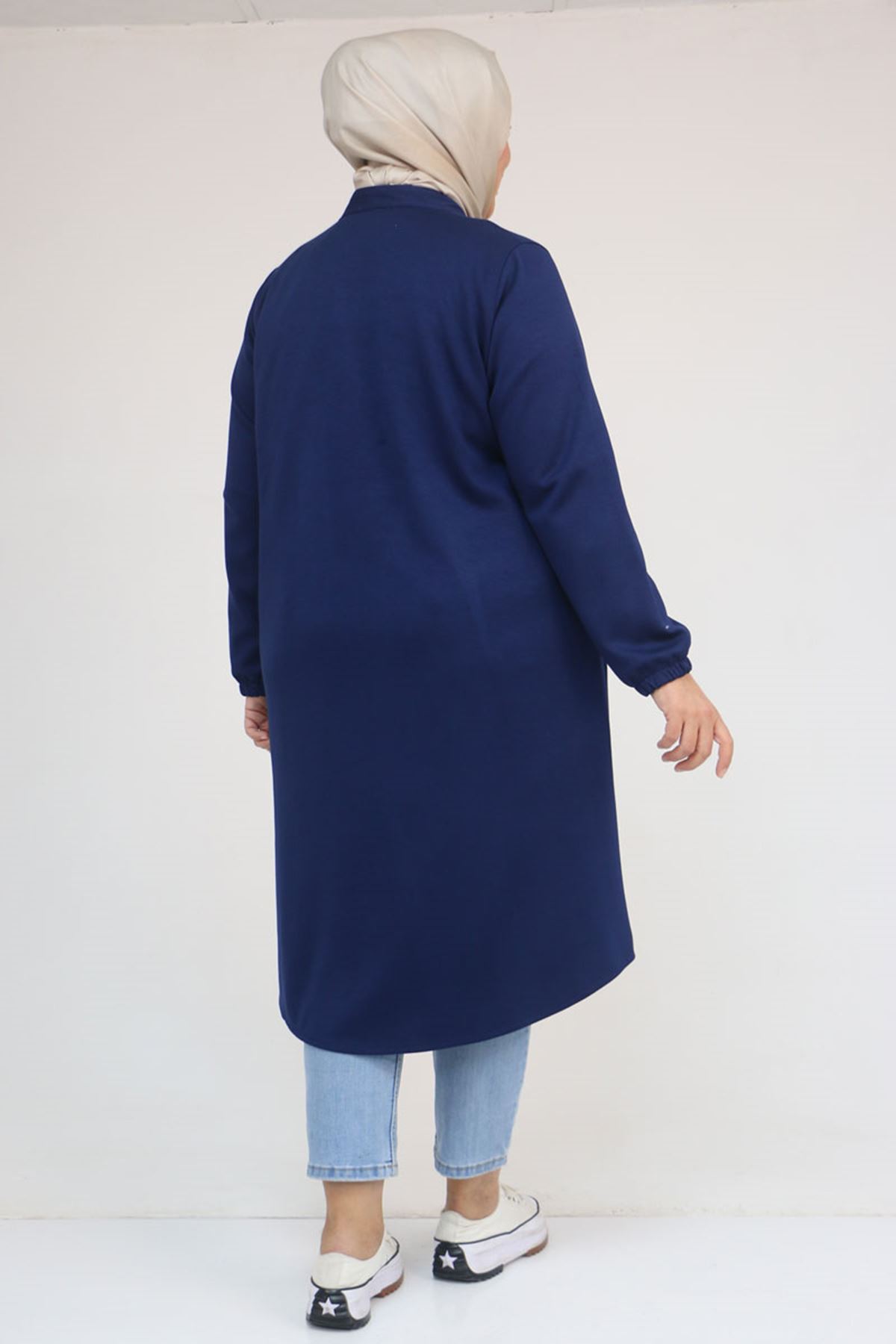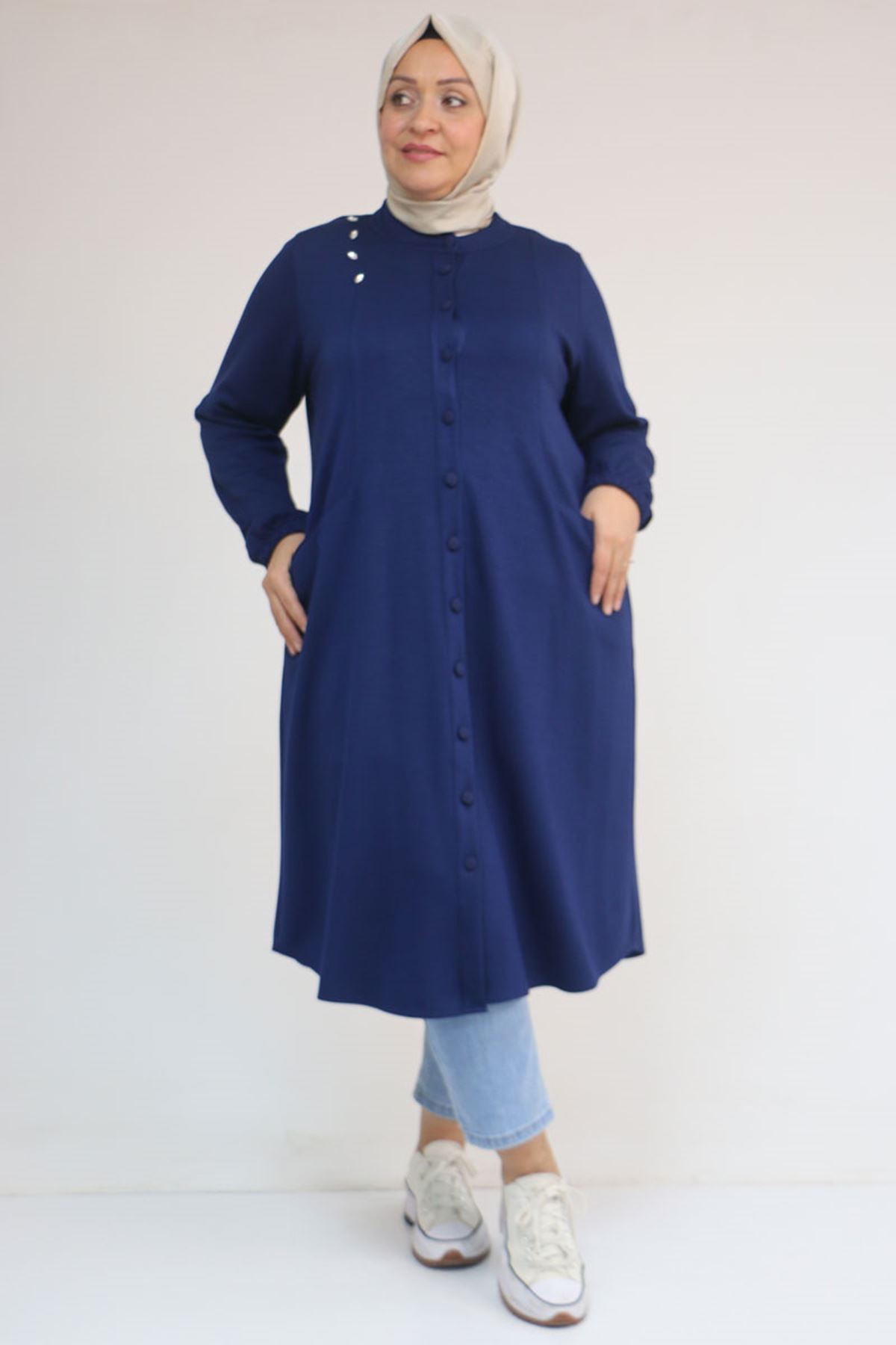 53054 Büyük Beden Boydan Düğmeli Modal Ceket - İndigo