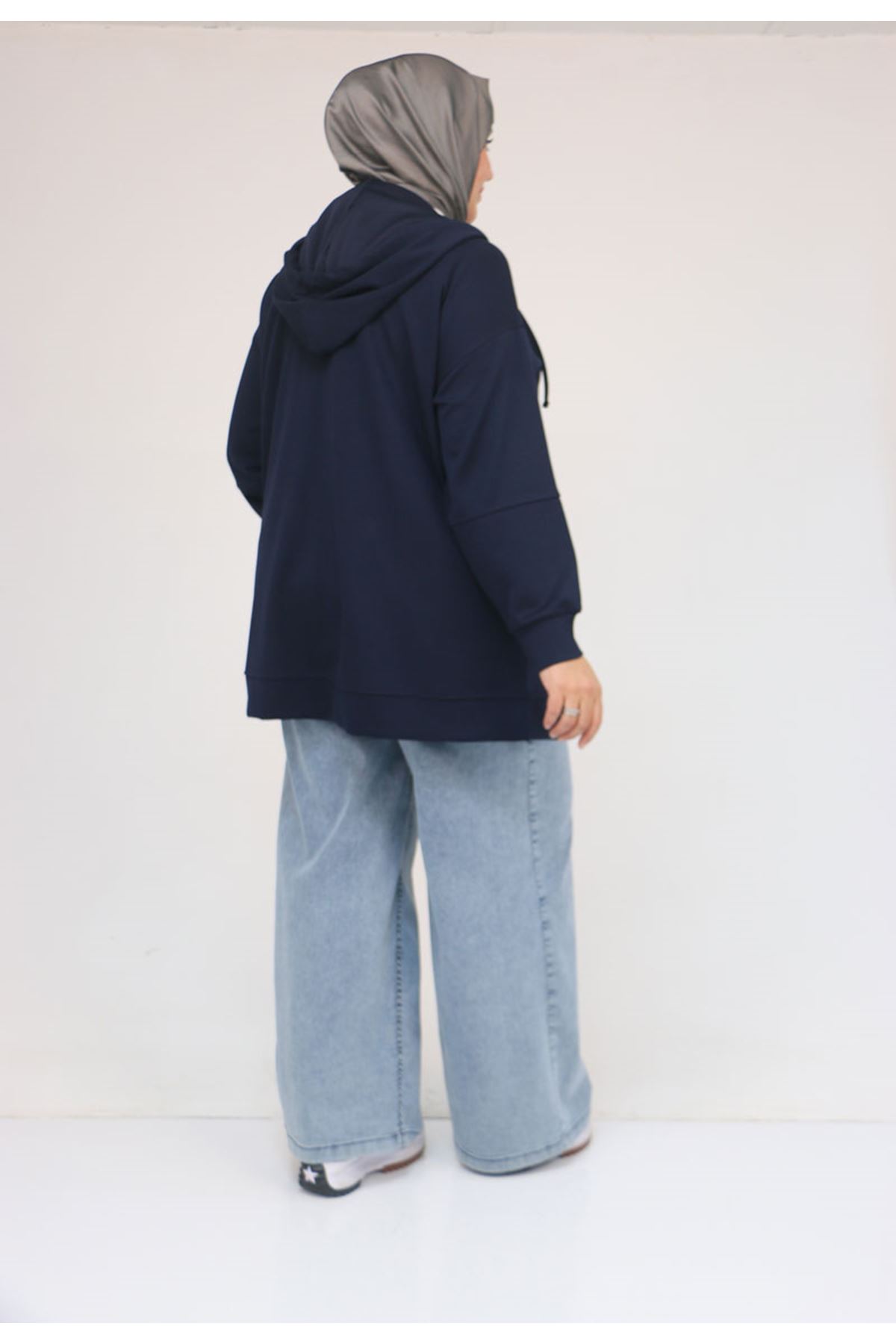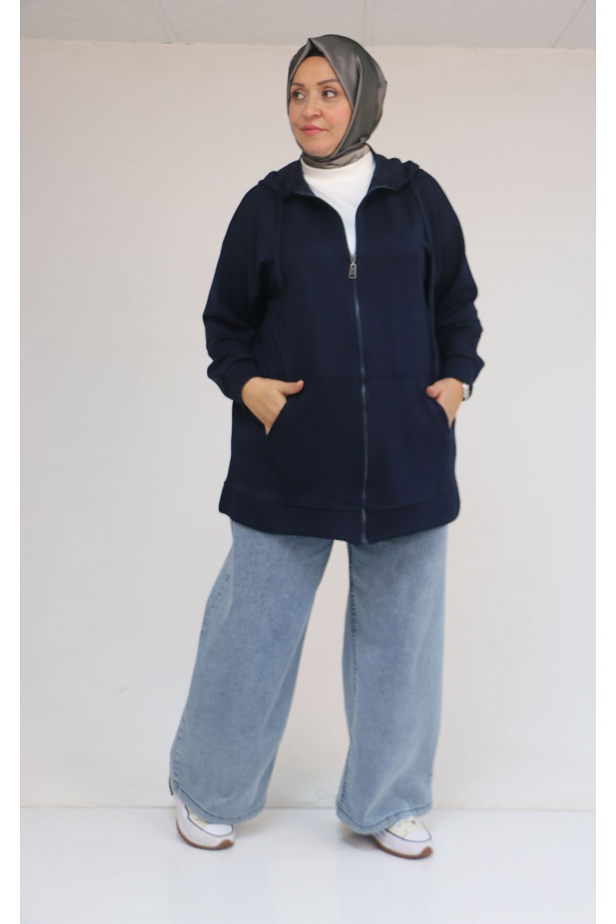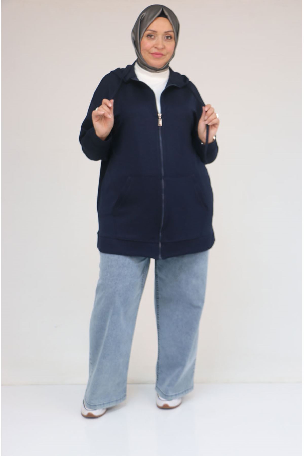53057 Büyük Beden Kapüşonlu Fermuarlı Modal Ceket - Lacivert