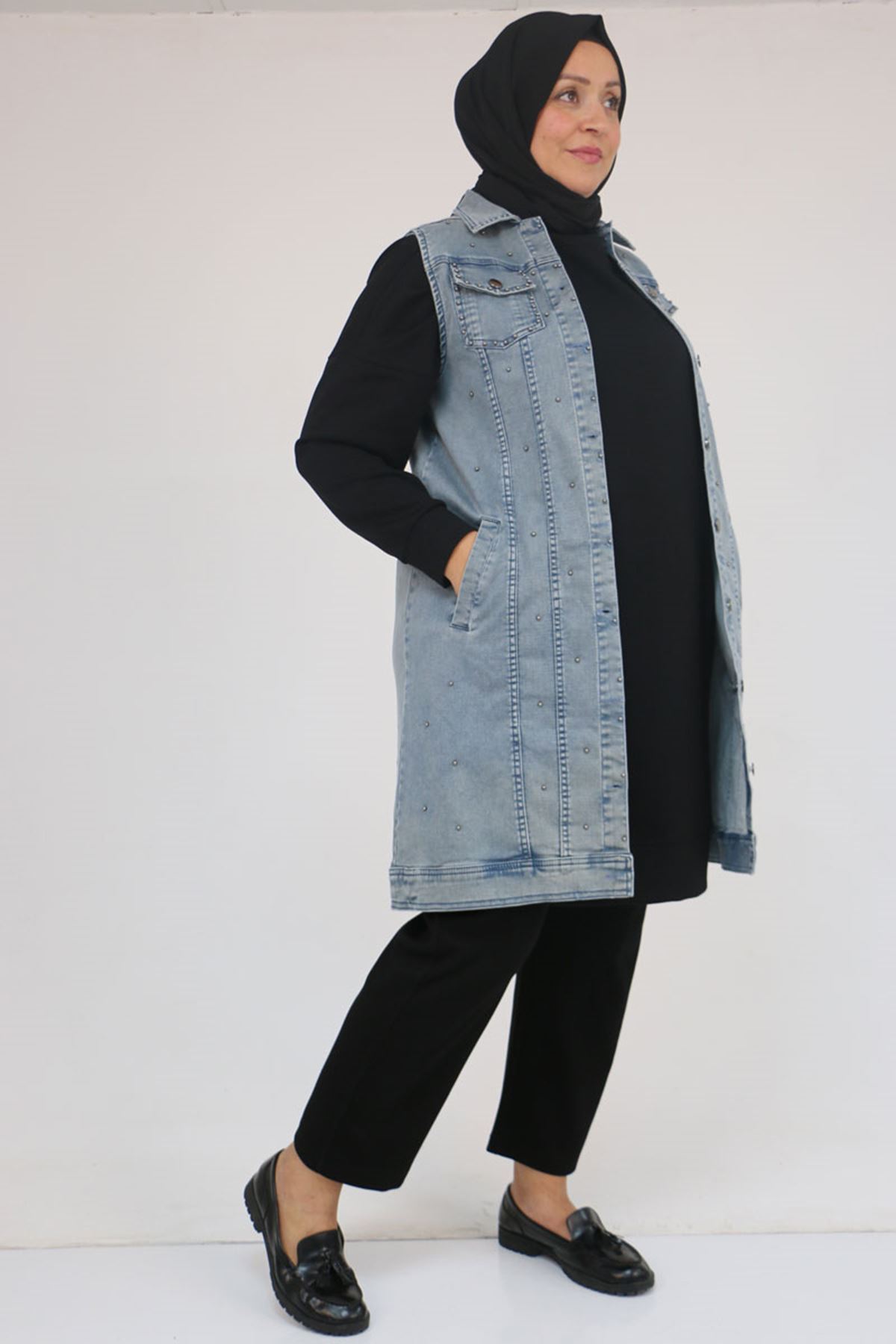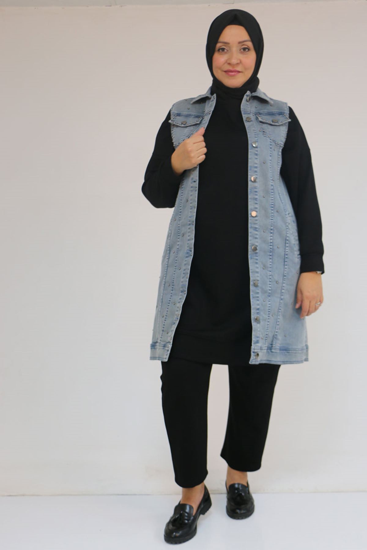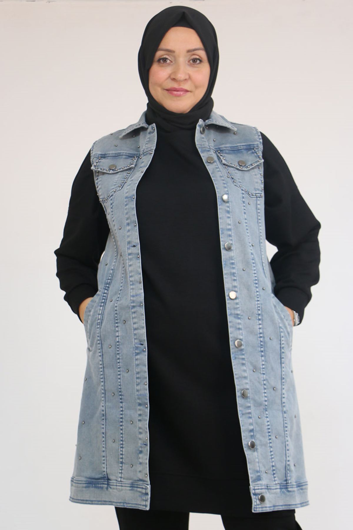 54007 Büyük Beden Çift Cepli İnci Çakmalı Kot Yelek - Kar Yıkama Duman