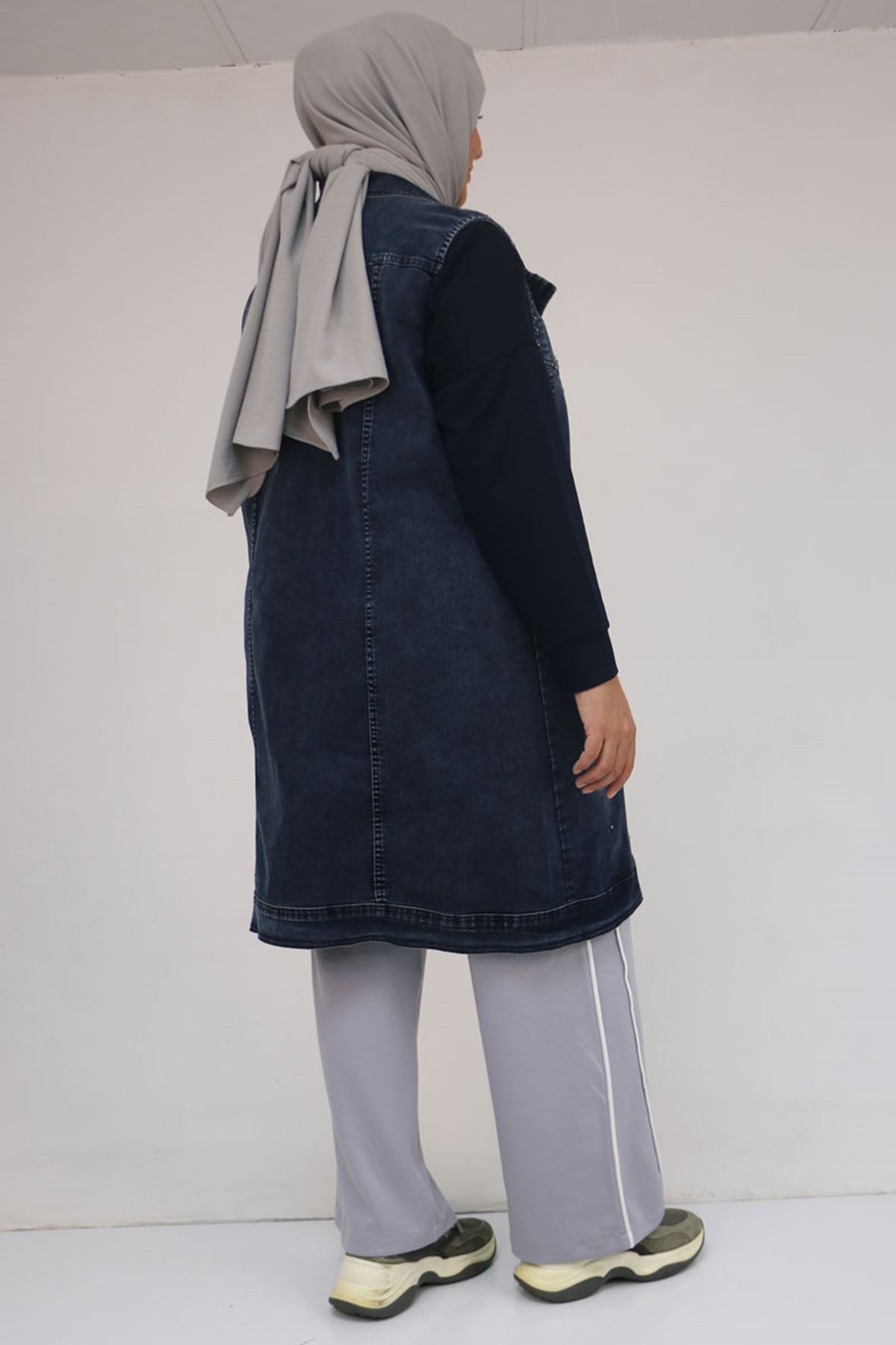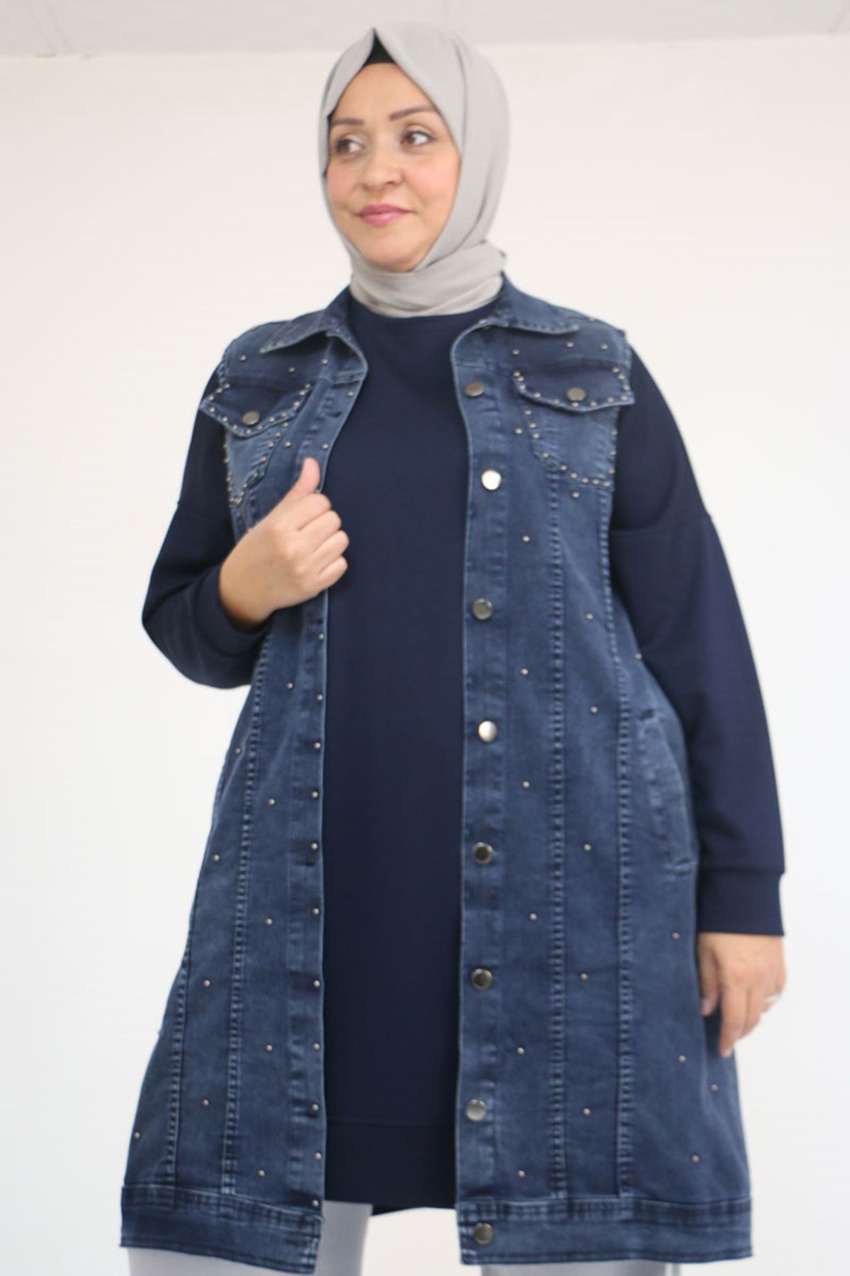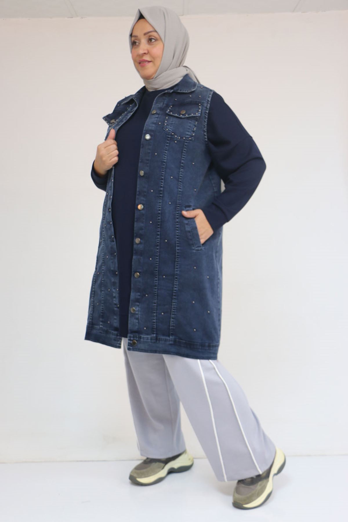 54007 Büyük Beden Çift Cepli İnci Çakmalı Kot Yelek - Kar Yıkama Lacivert