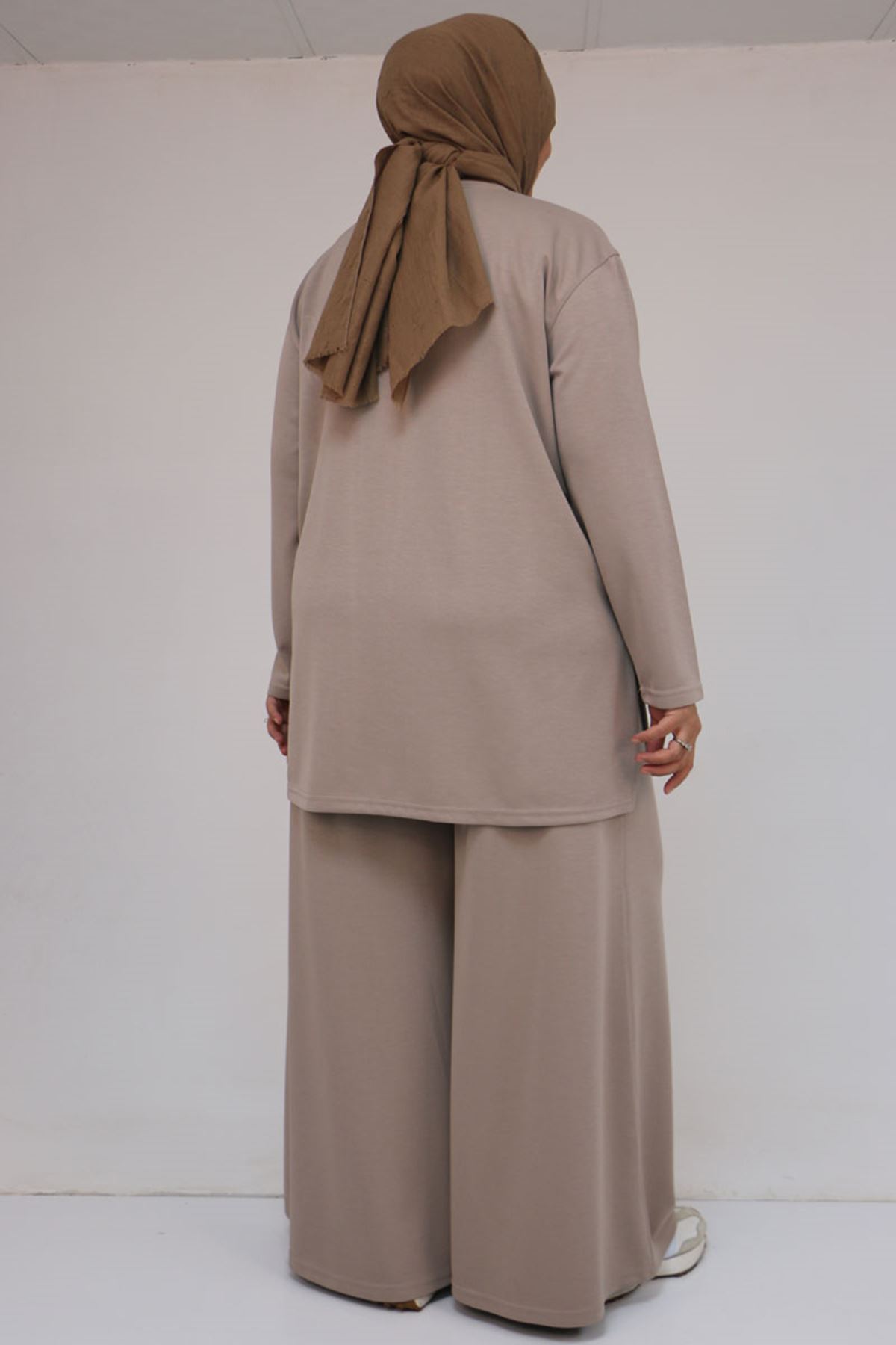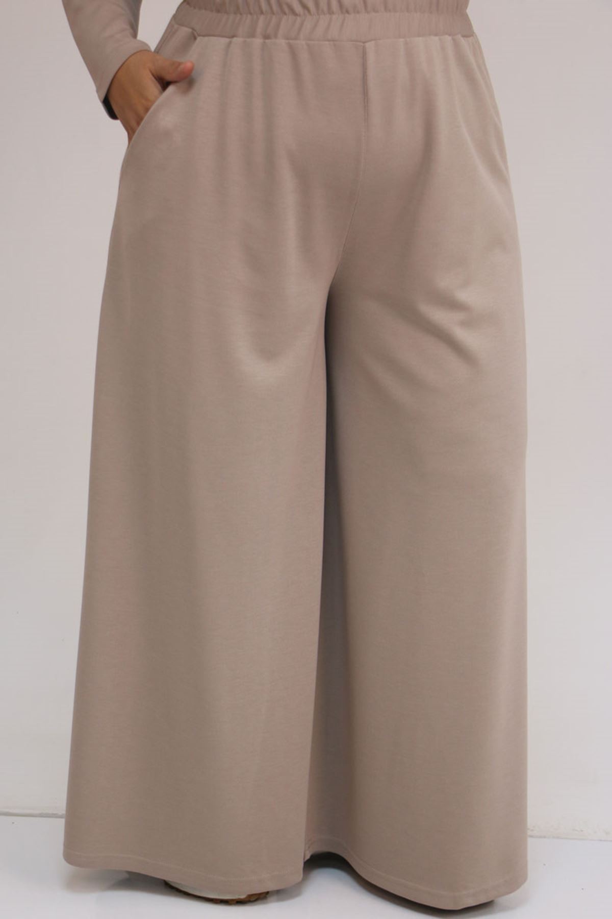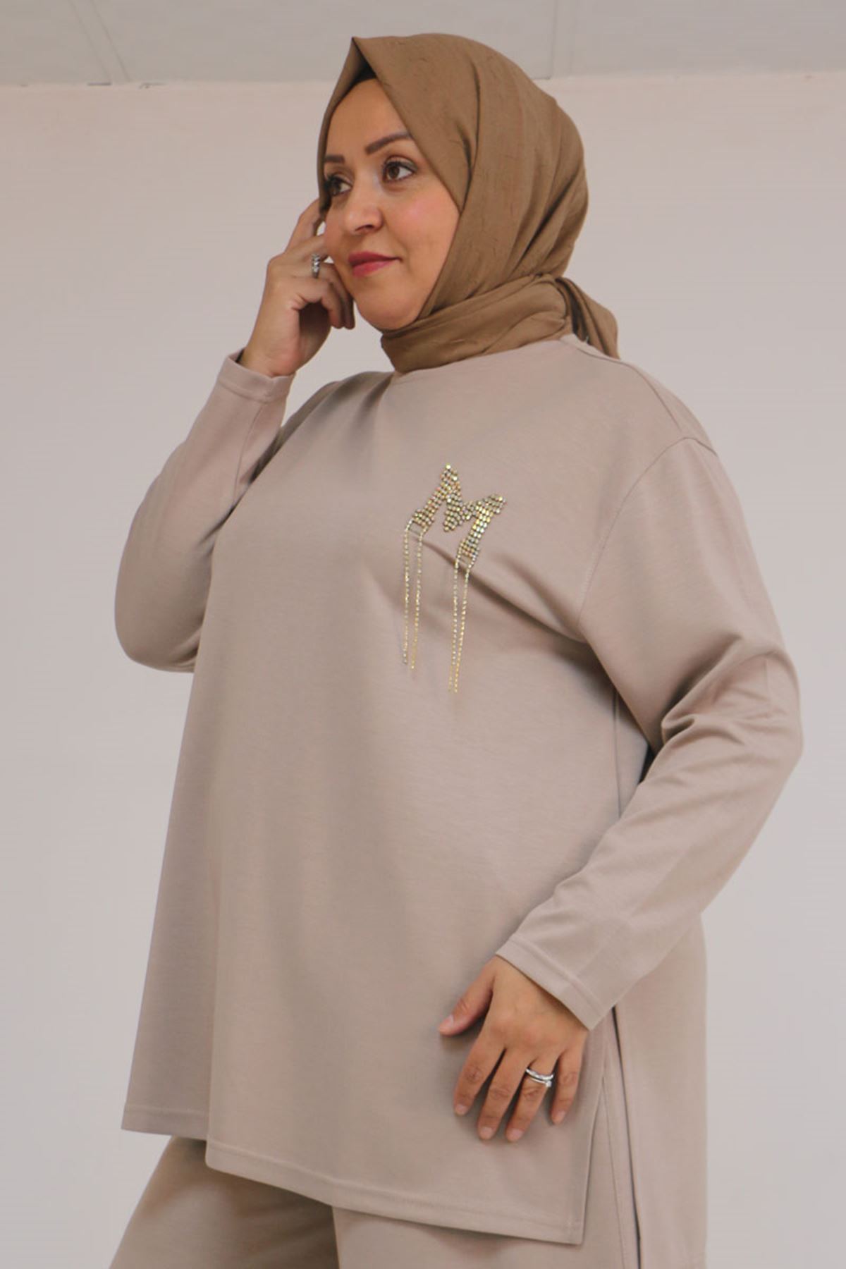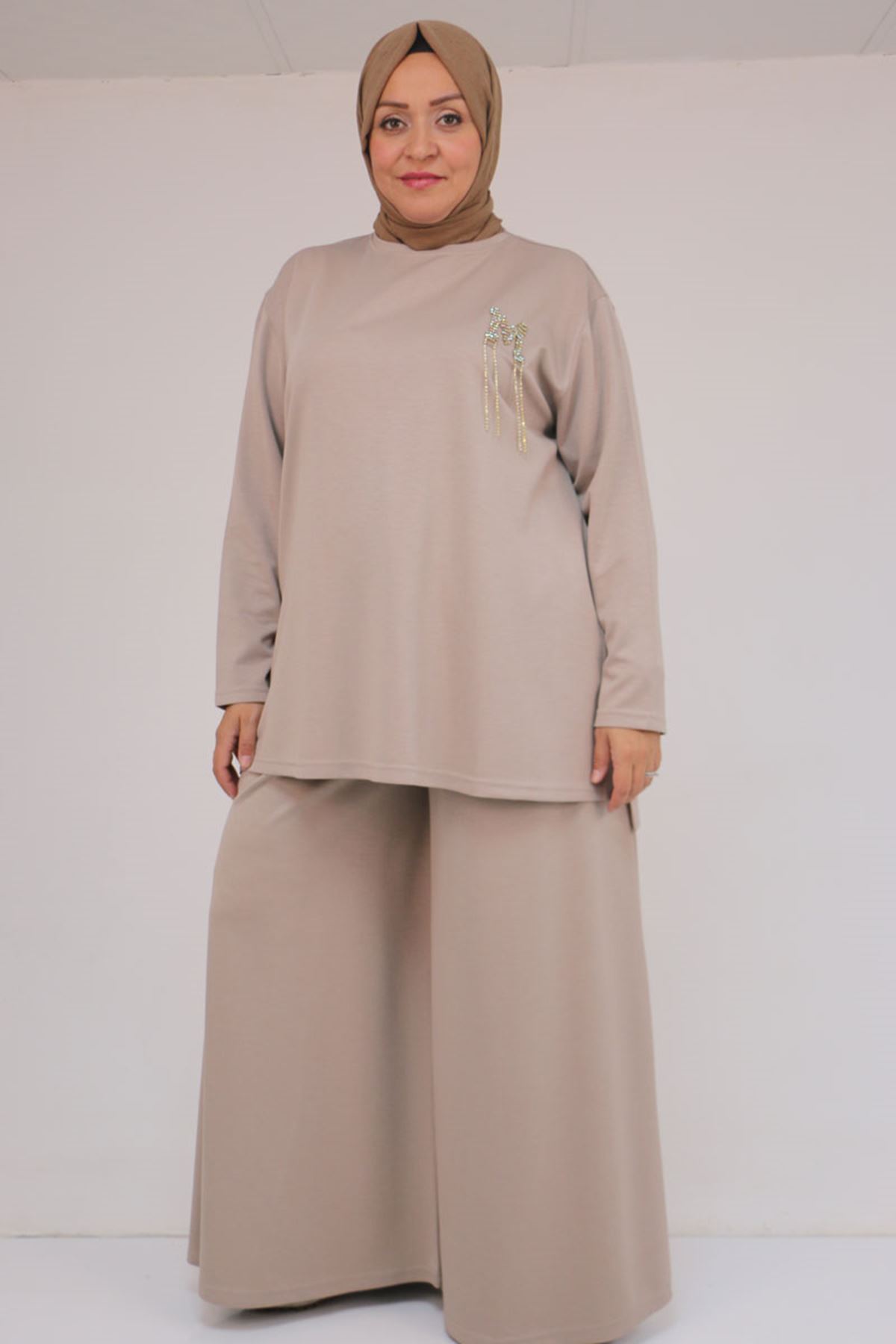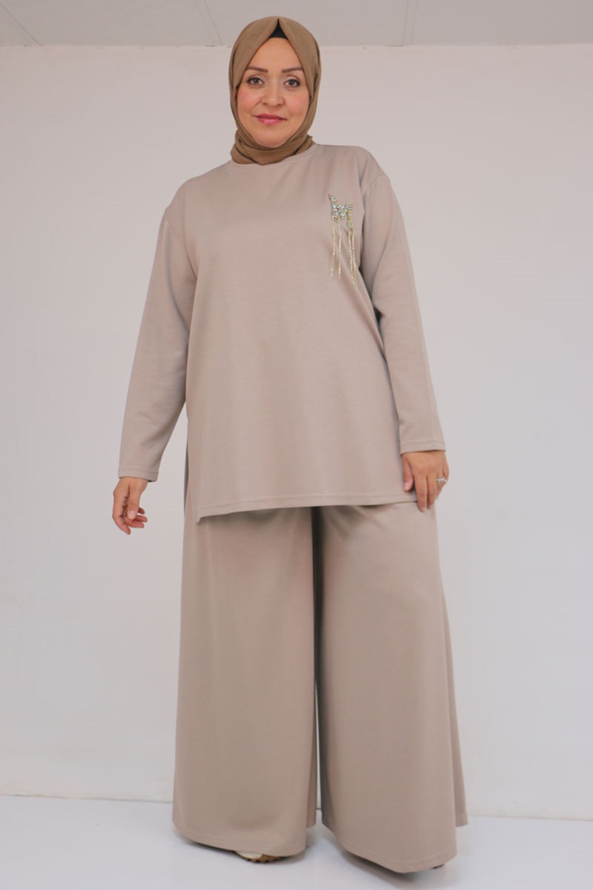 57043 Büyük Beden Yanı Yırtmaçlı Modal Pantolonlu Takım - Vizon