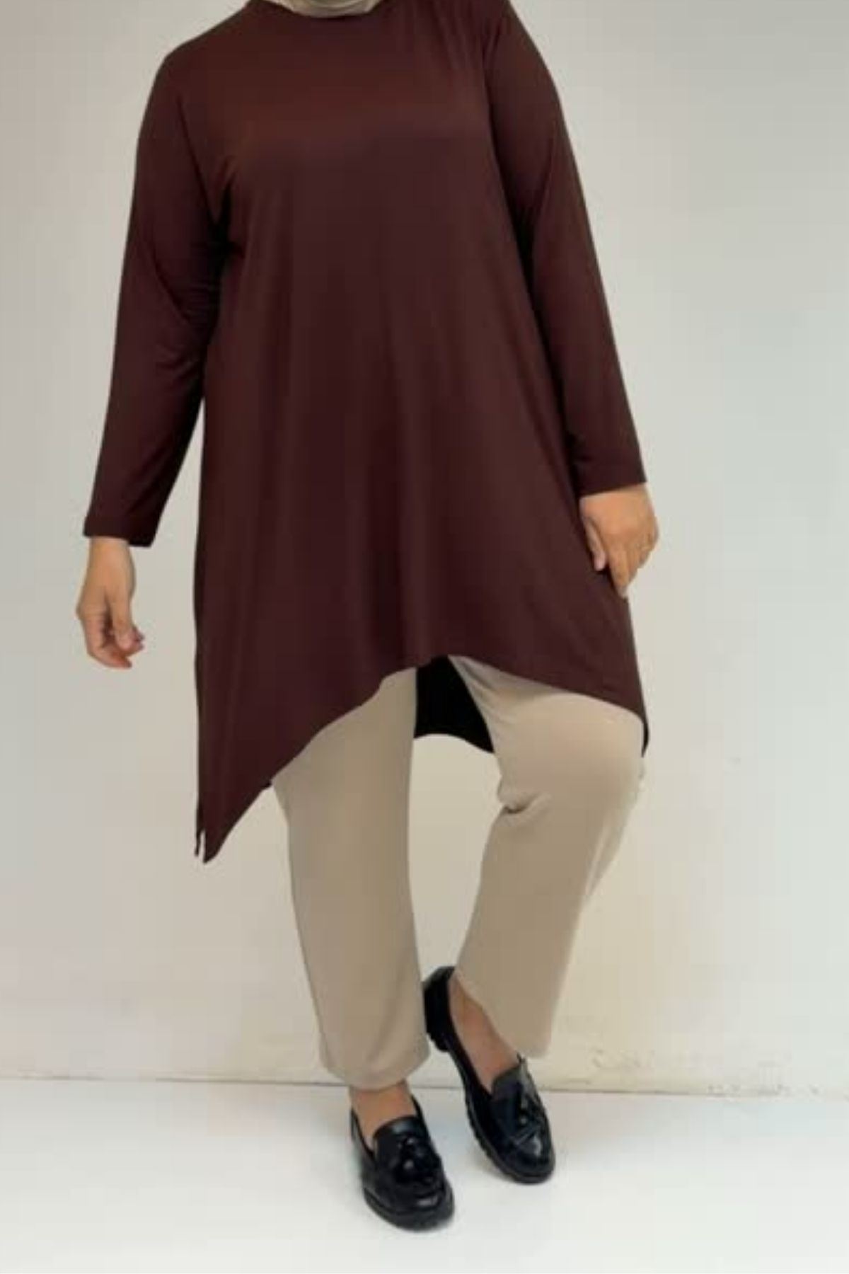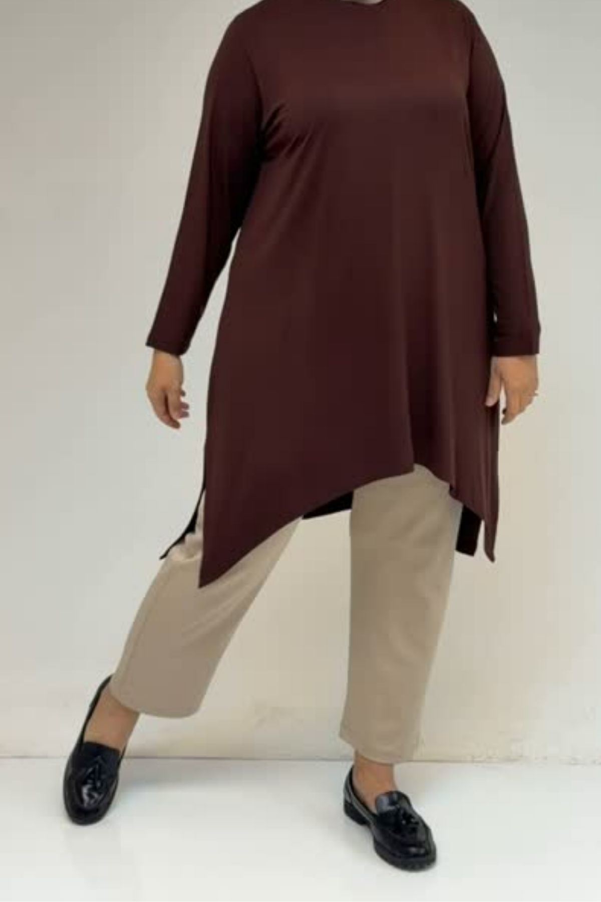 58070 Büyük Beden Asimetrik Kesim Penye Tunik - Kahve