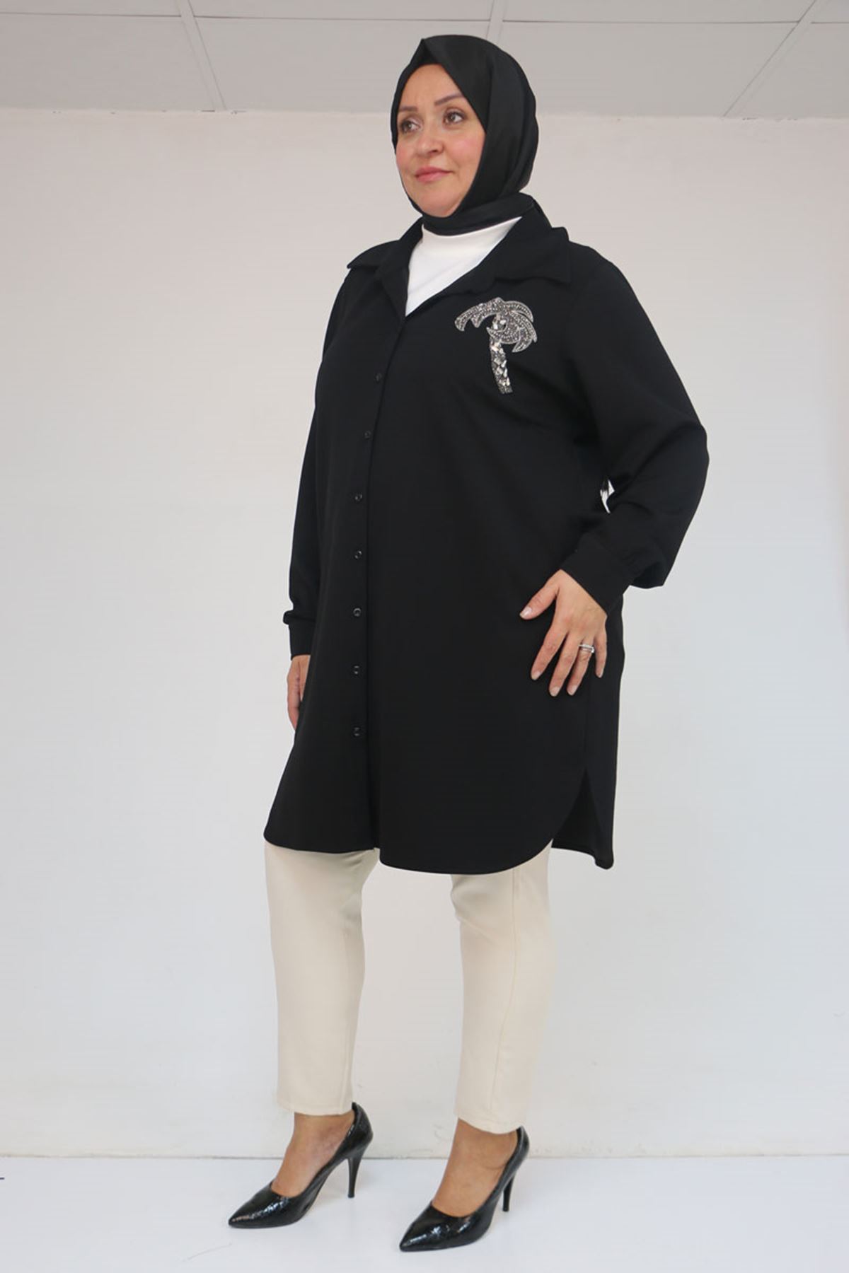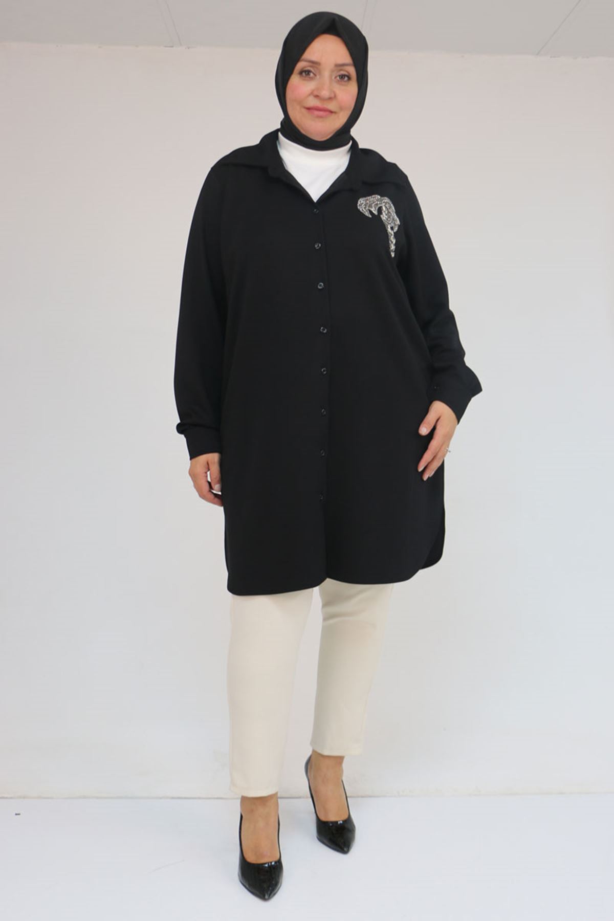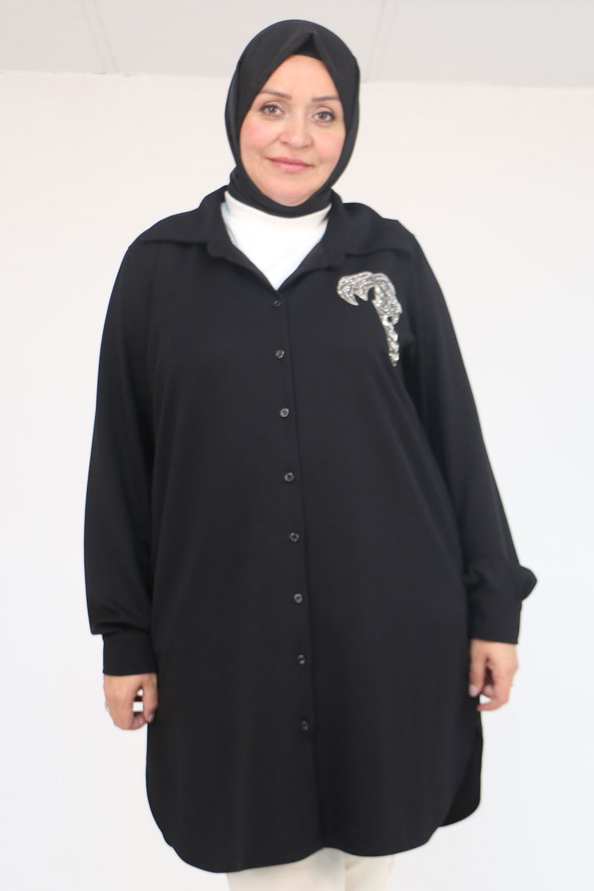 58126 Büyük Beden Düğmeli Aksesuar Detaylı Modal Tunik - Siyah
