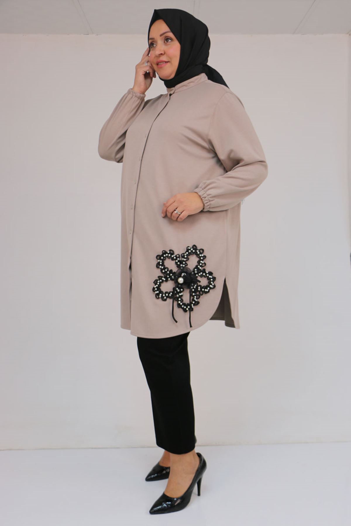 58127 Büyük Beden Hakim Yaka Aksesuar Detaylı Modal Tunik - Bej