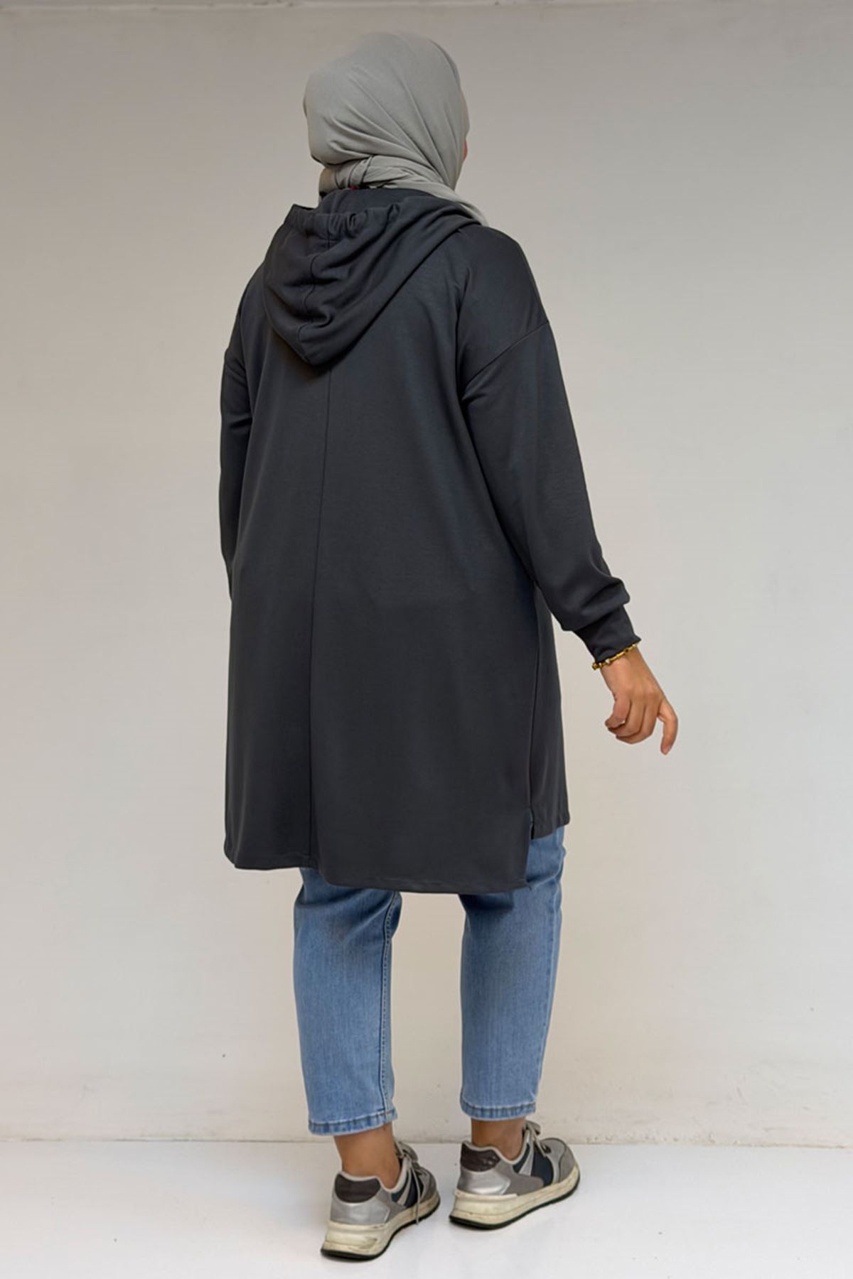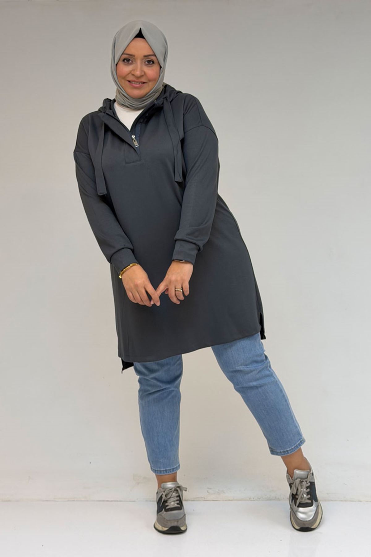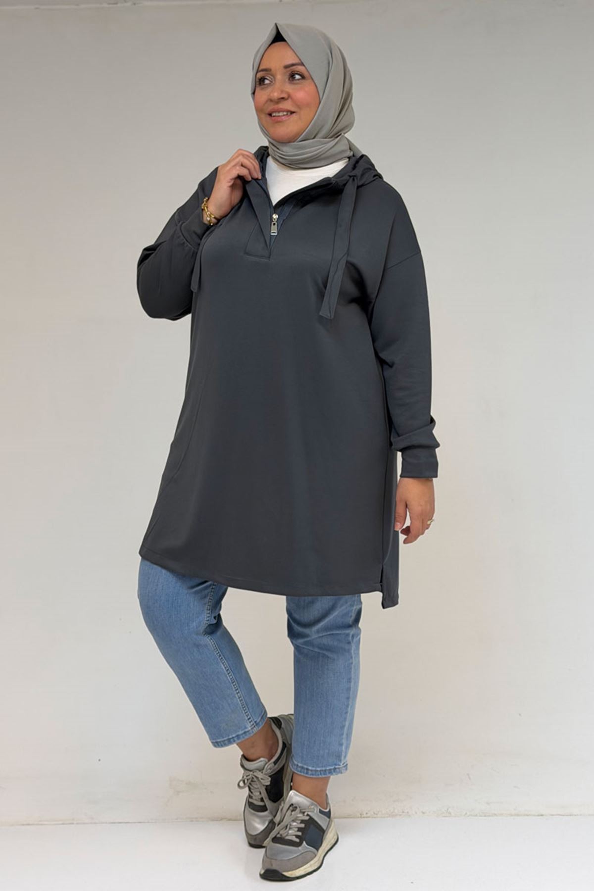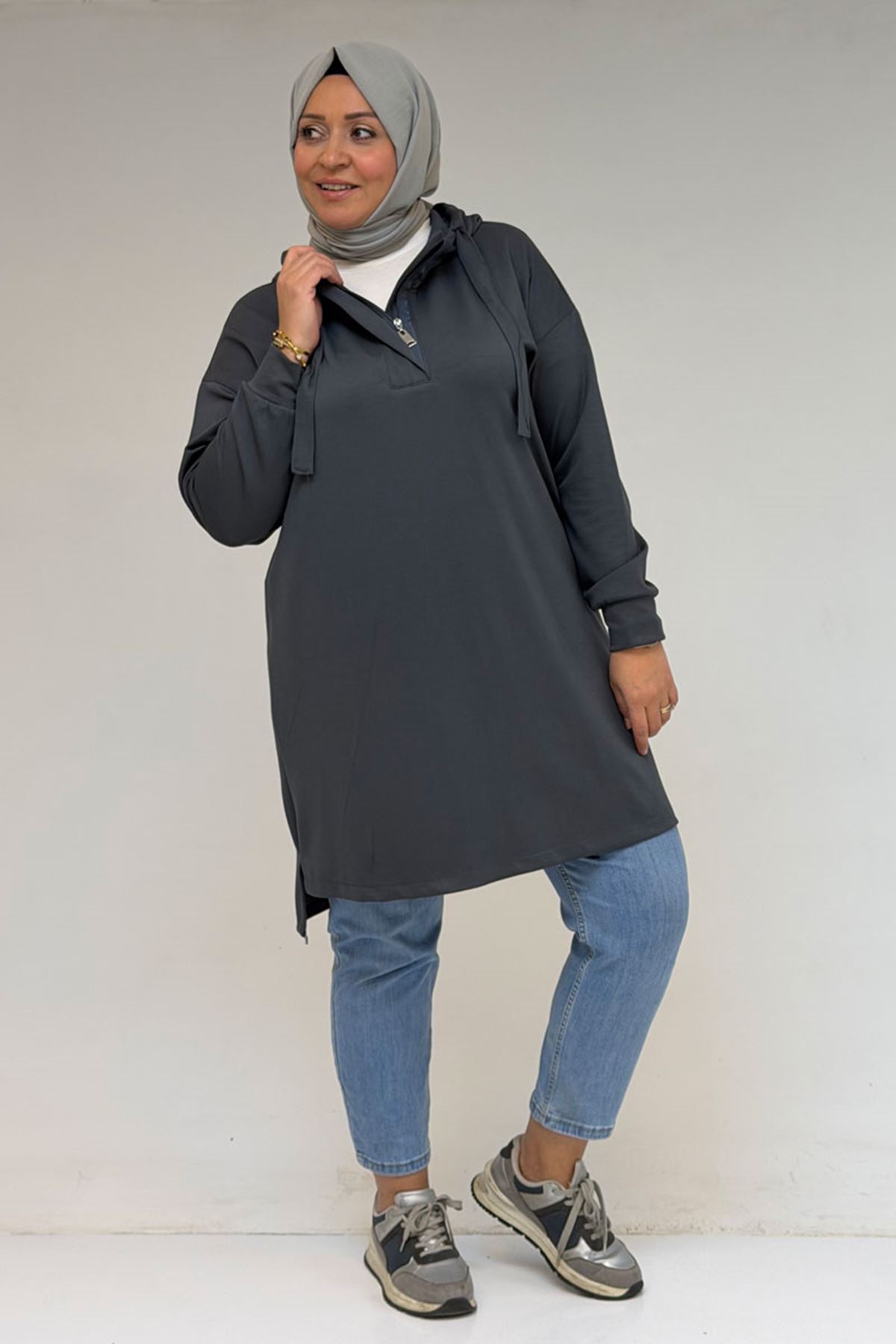 58135 Büyük Beden Kapşonlu Yarım Petlı Modal Tunik - Antrasit