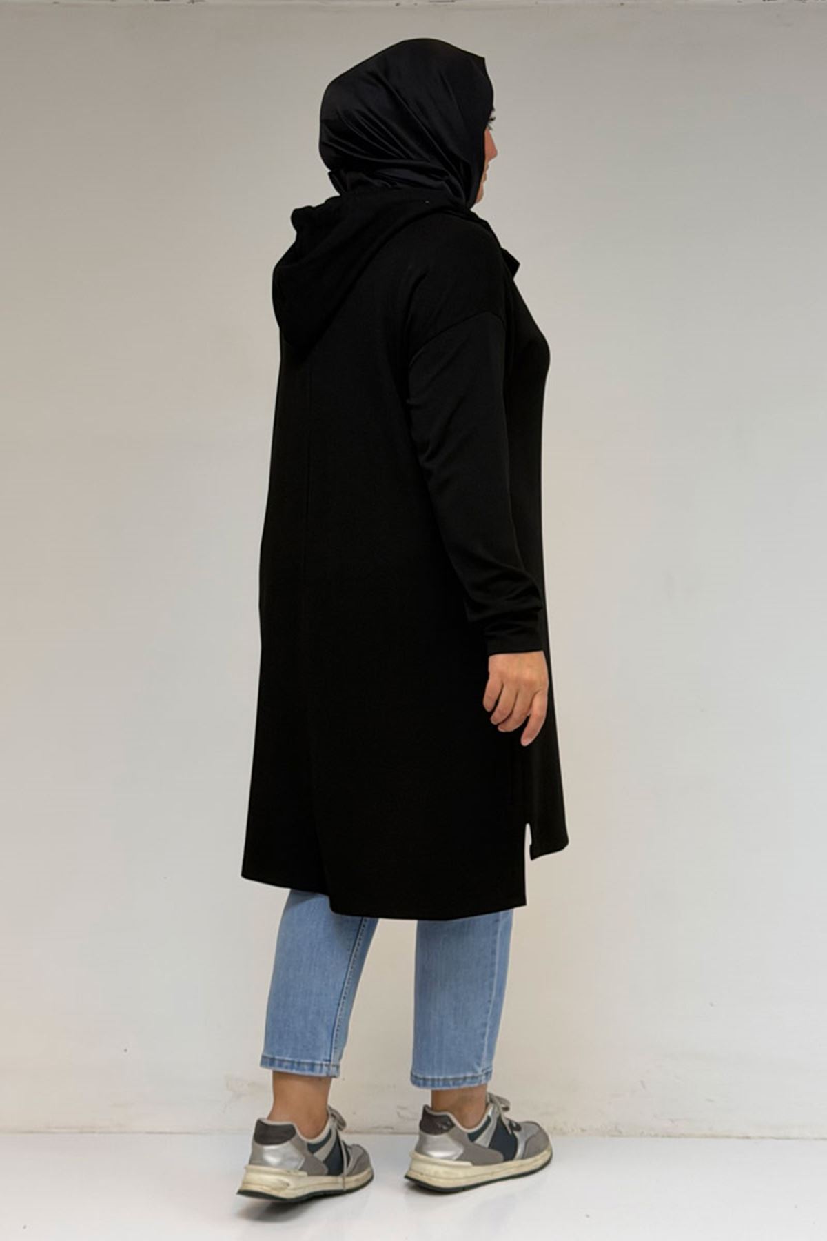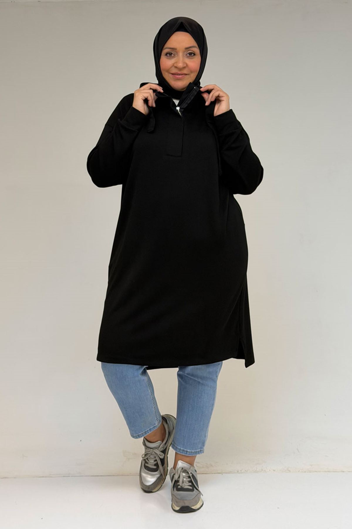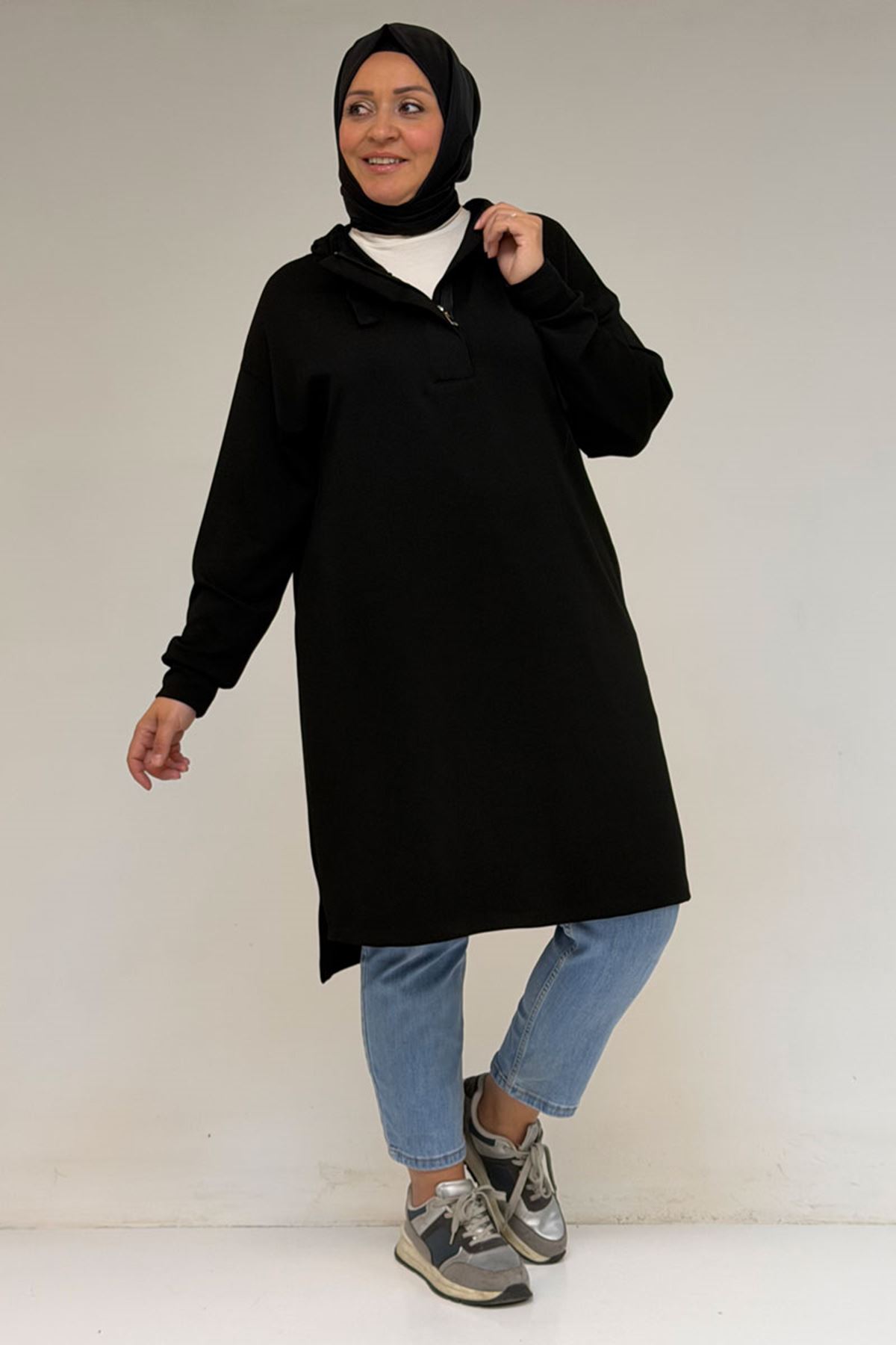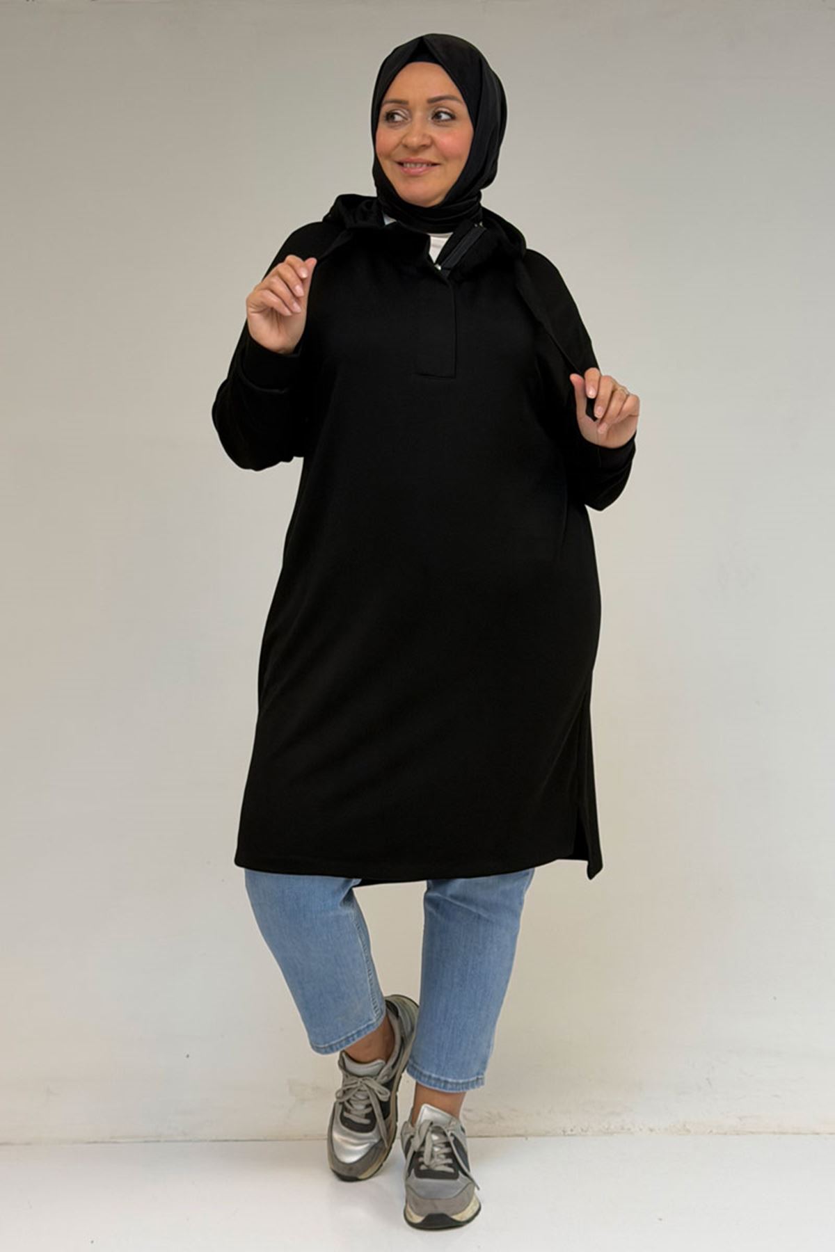 58135 Büyük Beden Kapşonlu Yarım Petlı Modal Tunik - Siyah