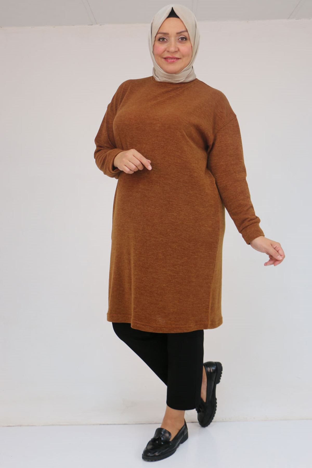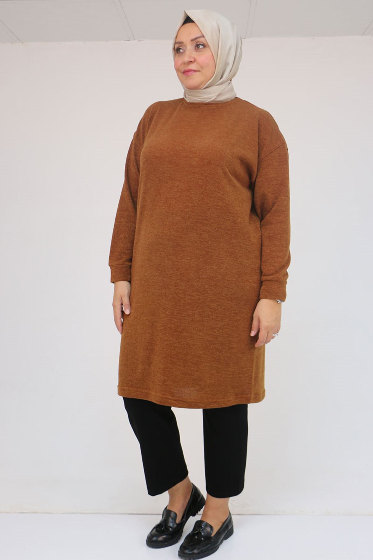 58148 Büyük Beden Düşük Kollu Mir Tunik - Taba