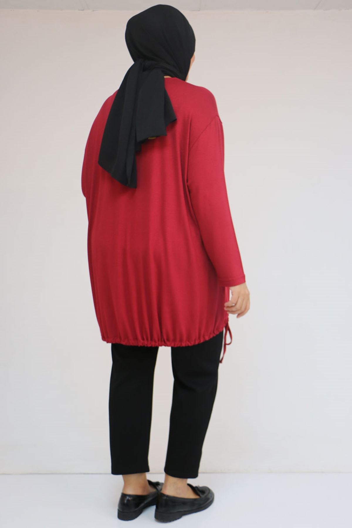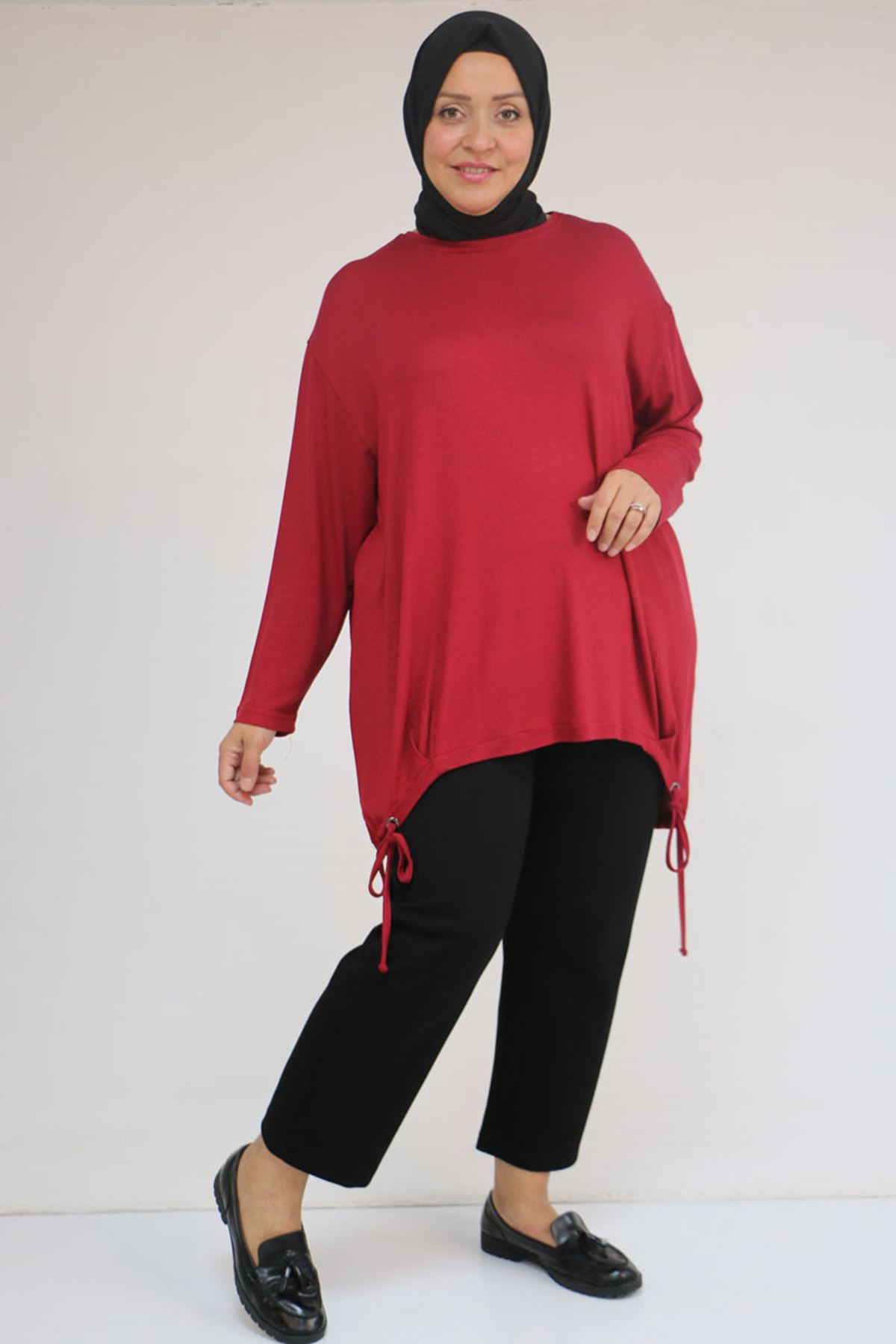 58150 Büyük Beden Kuş Gözü Bağlama Detaylı Çilek Tunik - Bordo