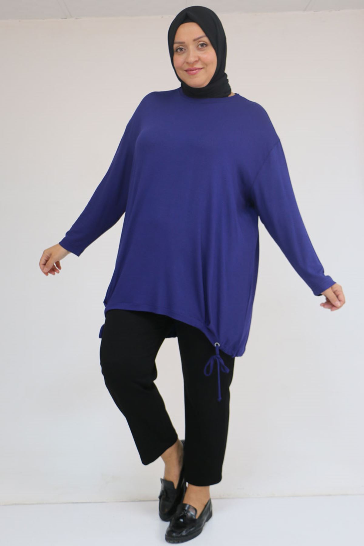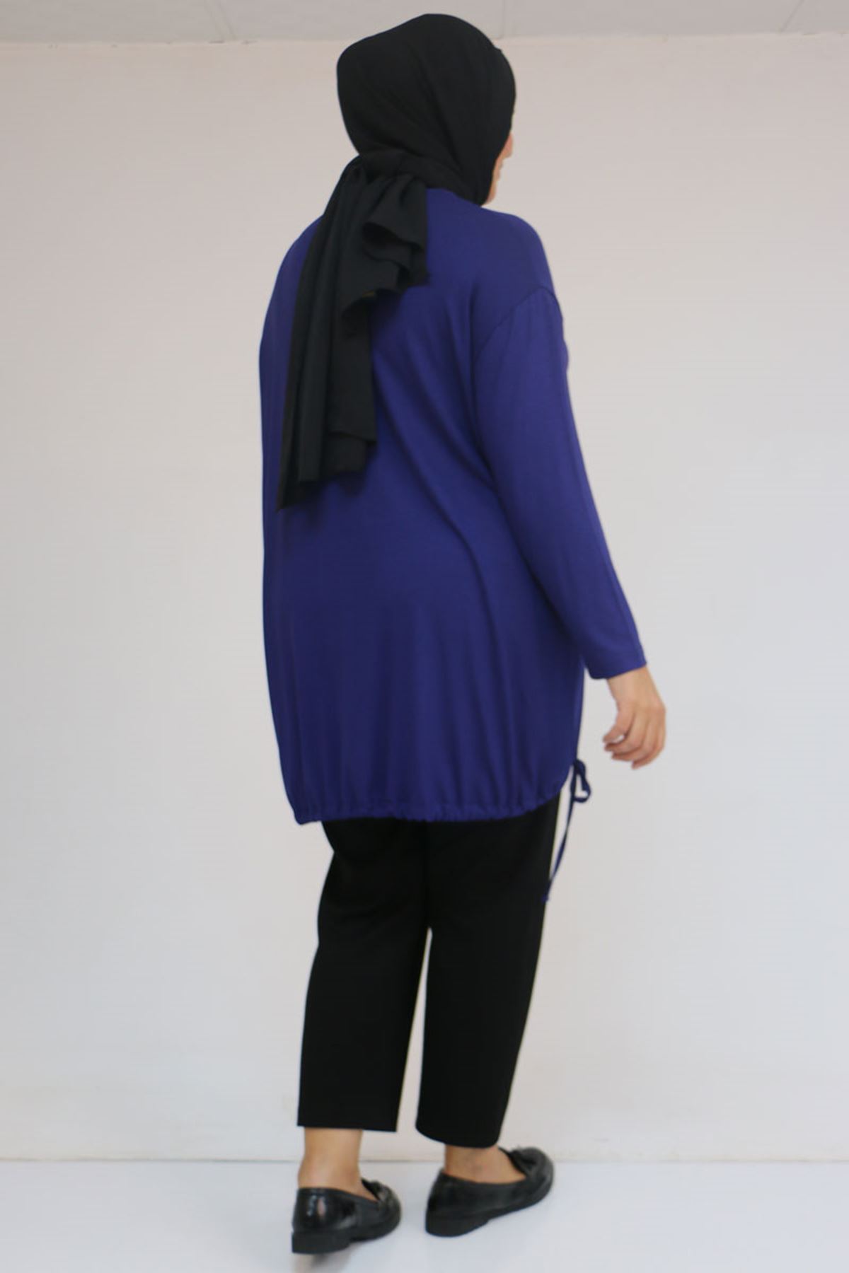 58150 Büyük Beden Kuş Gözü Bağlama Detaylı Çilek Tunik - İndigo