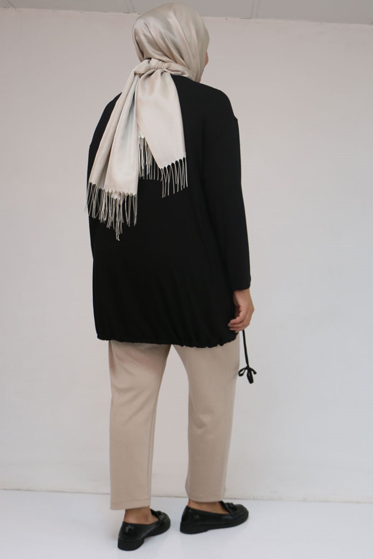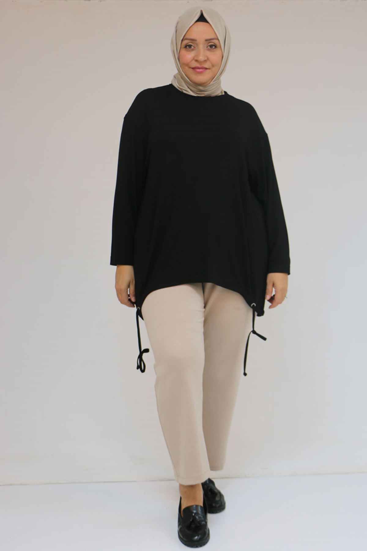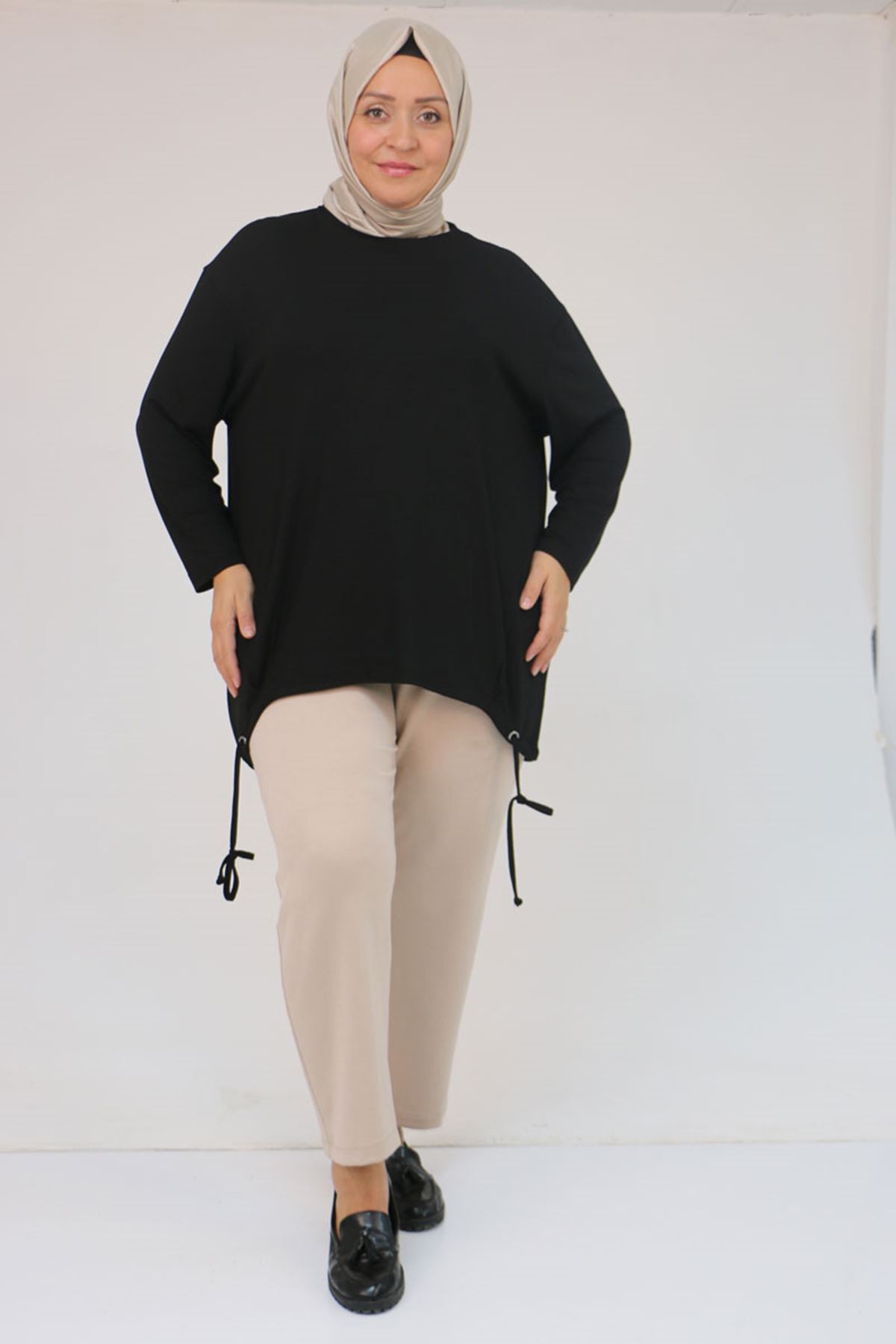 58150 Büyük Beden Kuş Gözü Bağlama Detaylı Çilek Tunik - Siyah