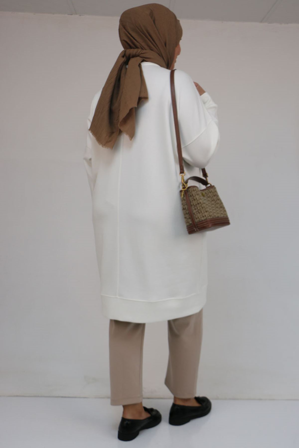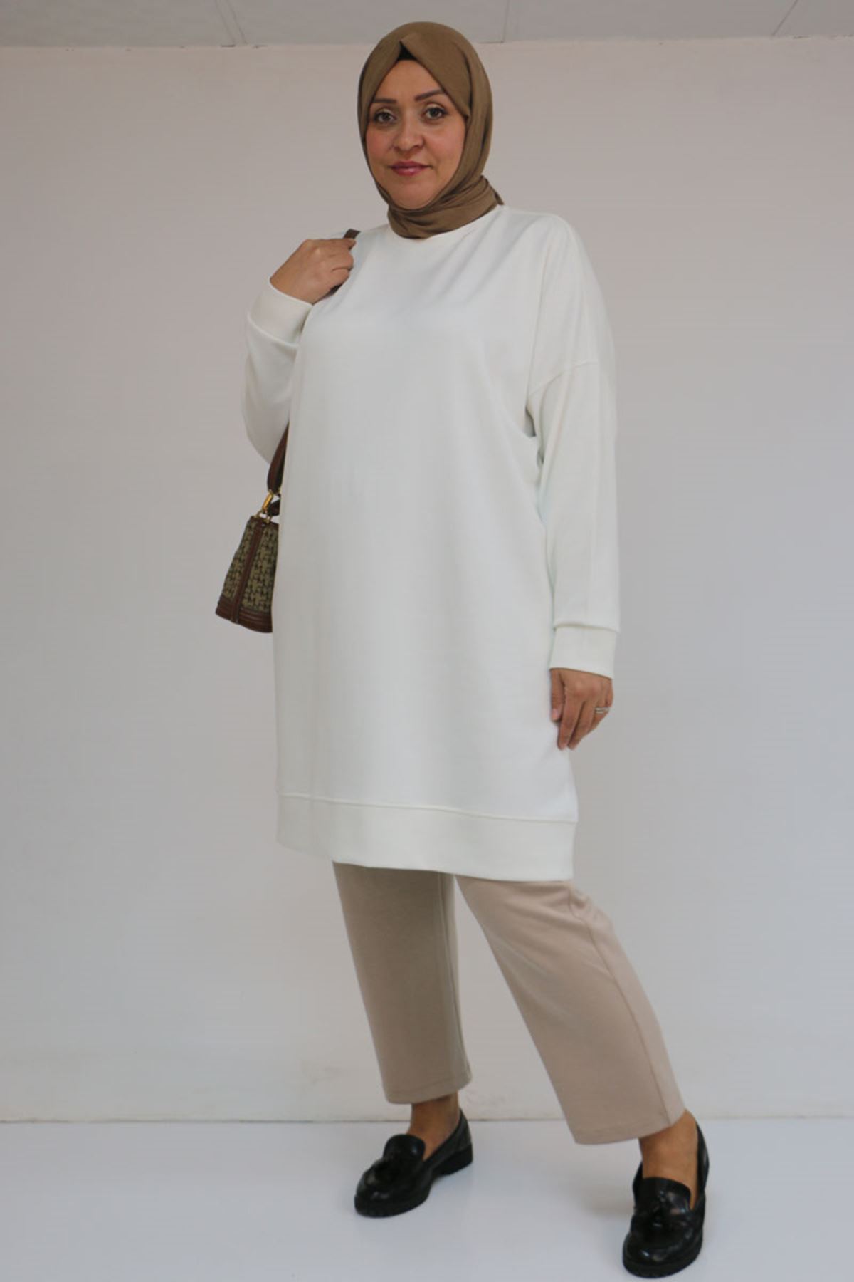 58151 Büyük Beden Kol Ve Etek Ucu Kendinden Ribanalı Modal Tunik - Ekru
