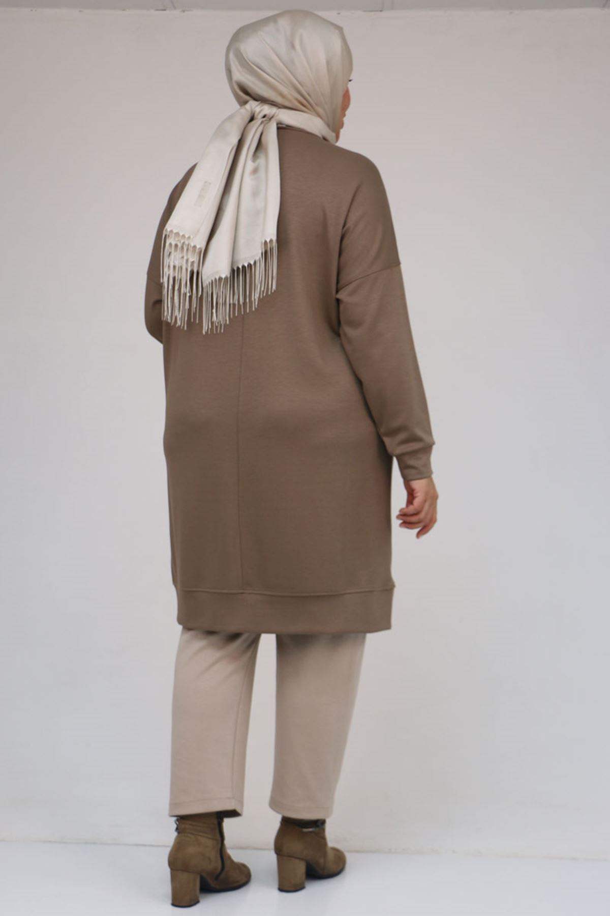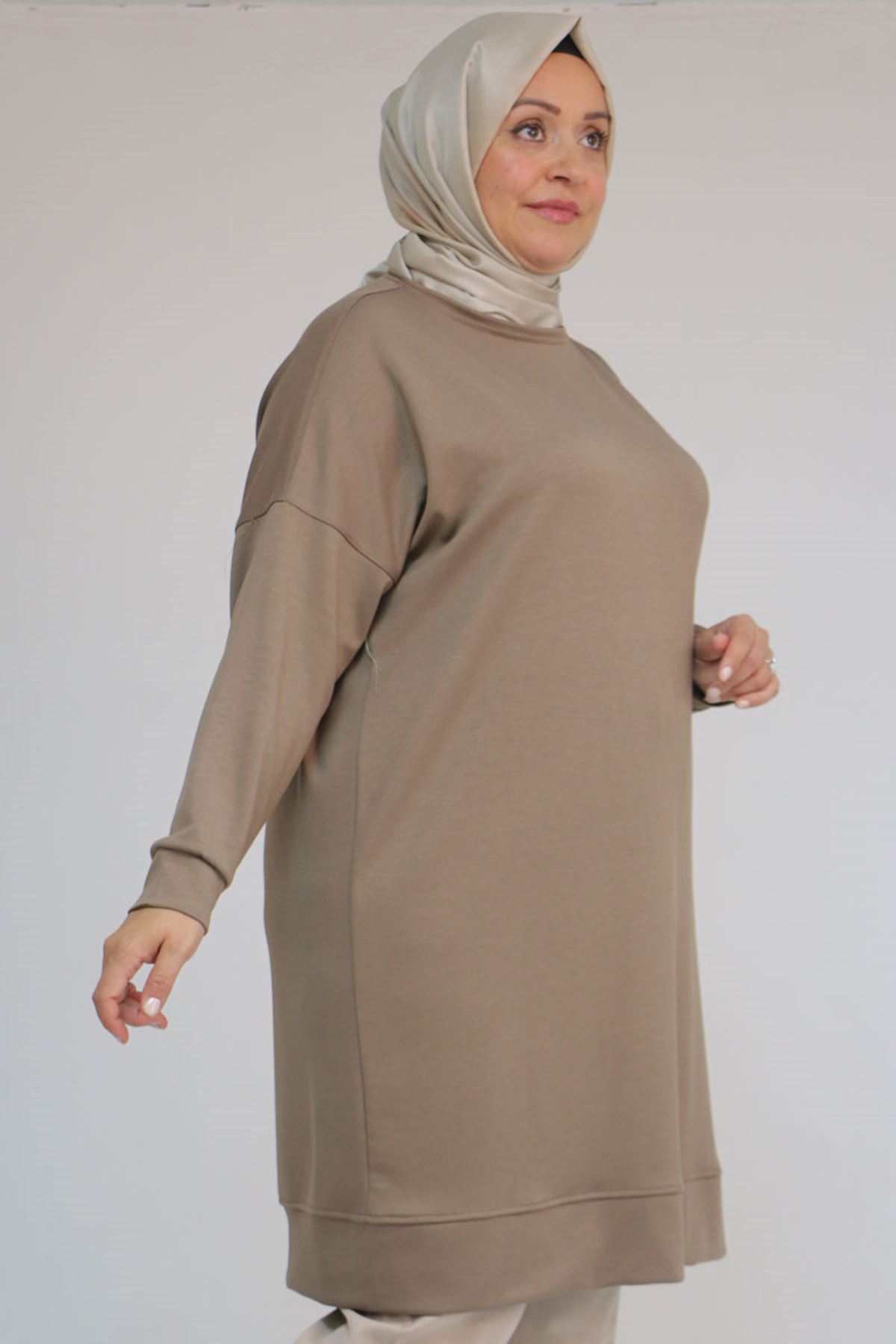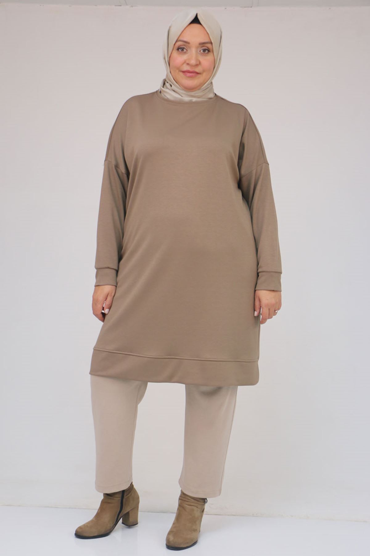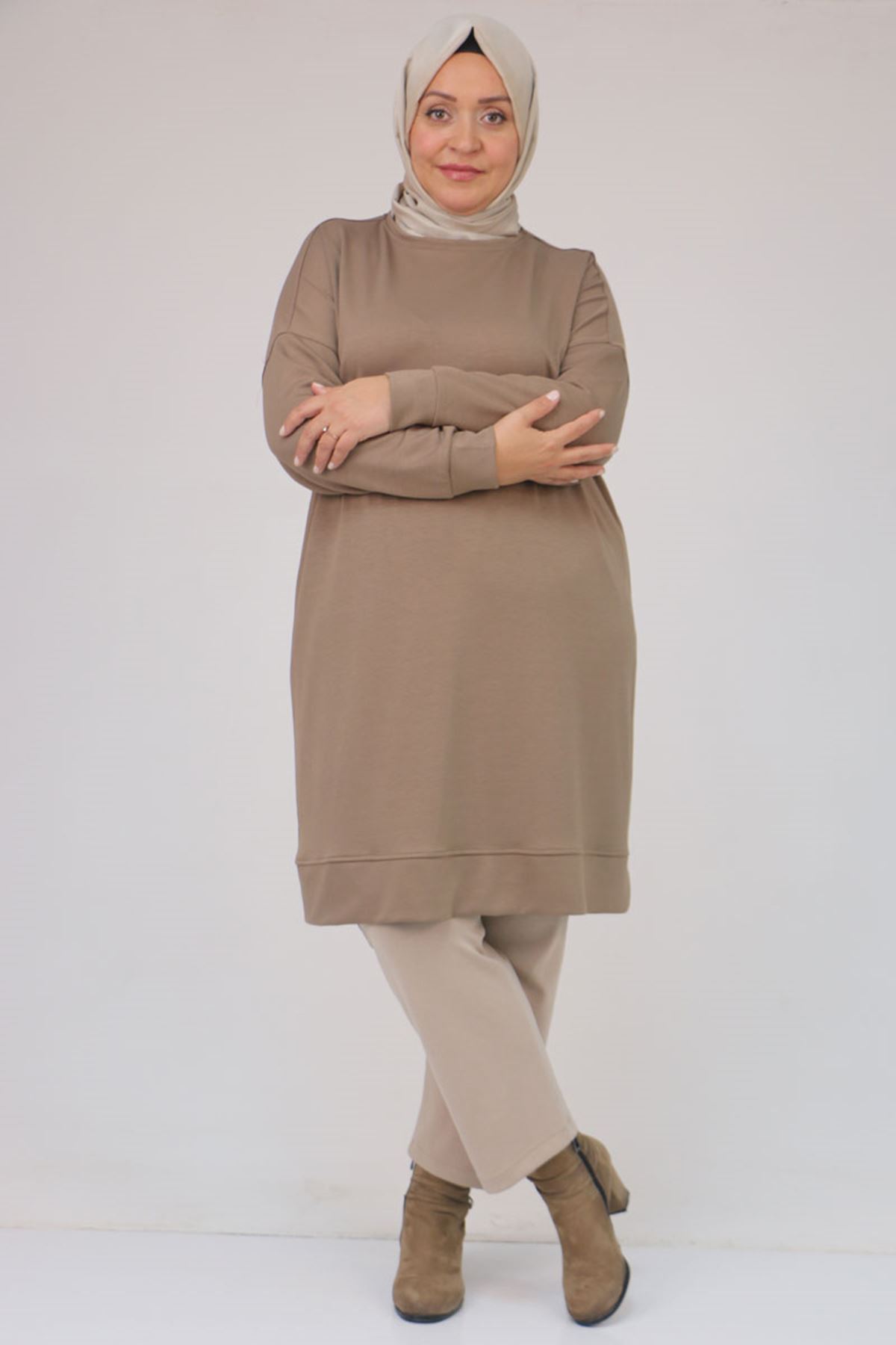 58151 Büyük Beden Kol Ve Etek Ucu Kendinden Ribanalı Modal Tunik - Vizon