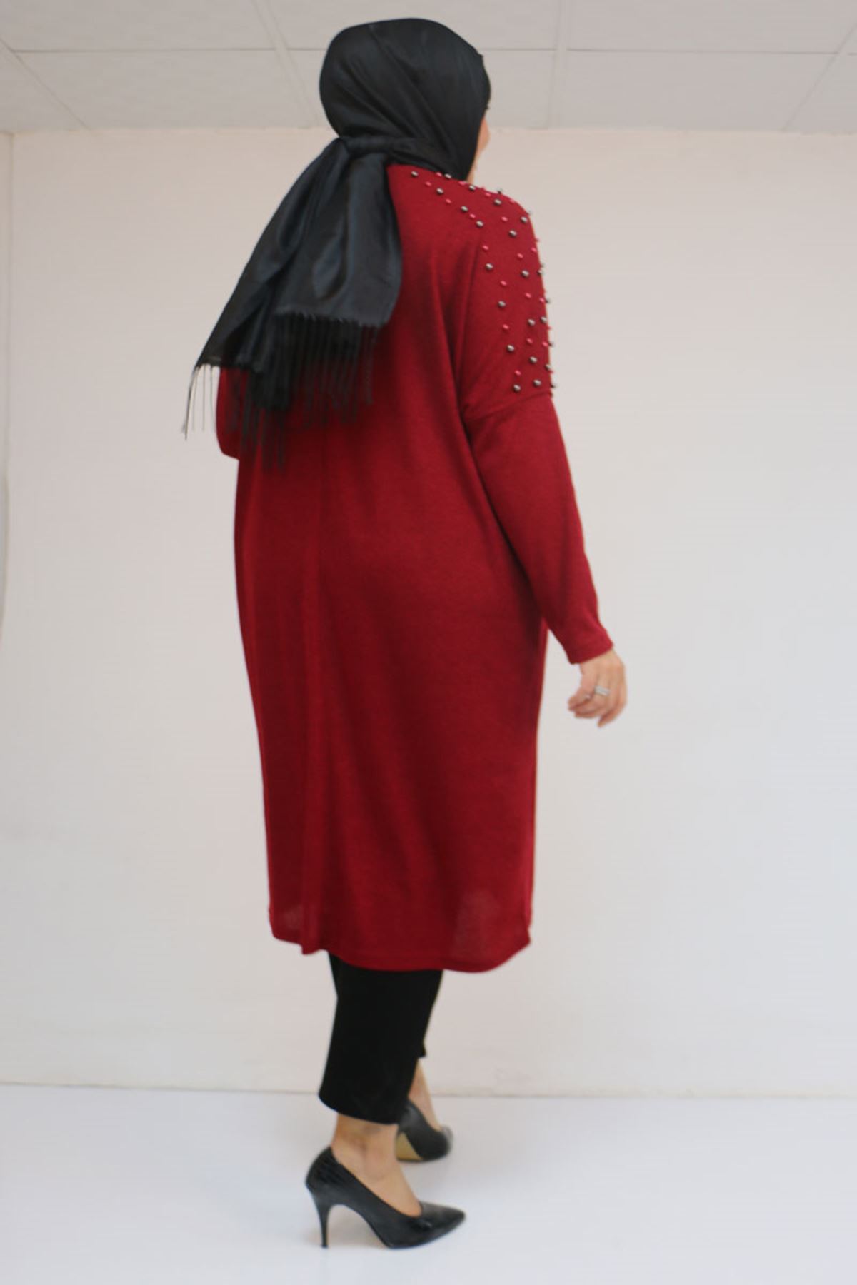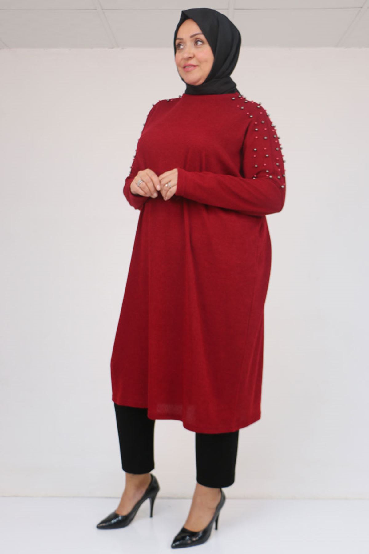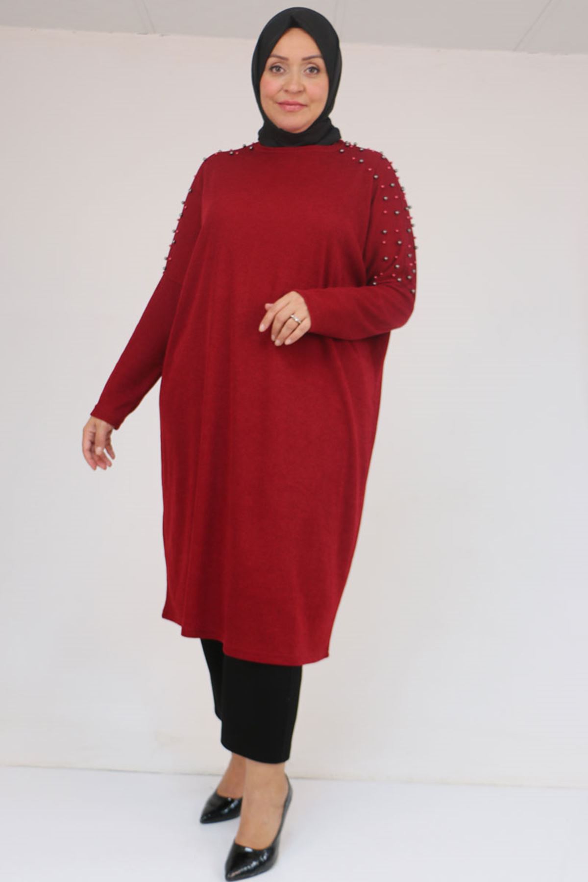 58152 Büyük Beden Düşükkol Omzu Taş Detaylı Mir Tunik - Bordo