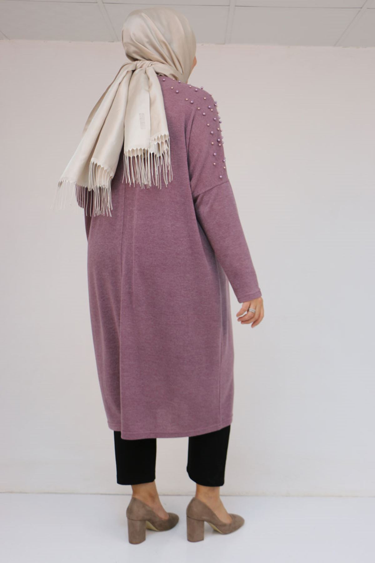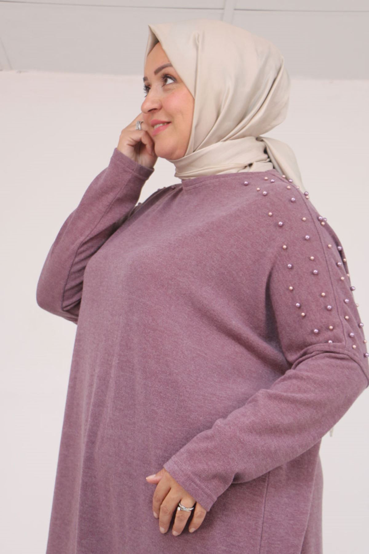 58152 Büyük Beden Düşükkol Omzu Taş Detaylı Mir Tunik - Gül Kurusu