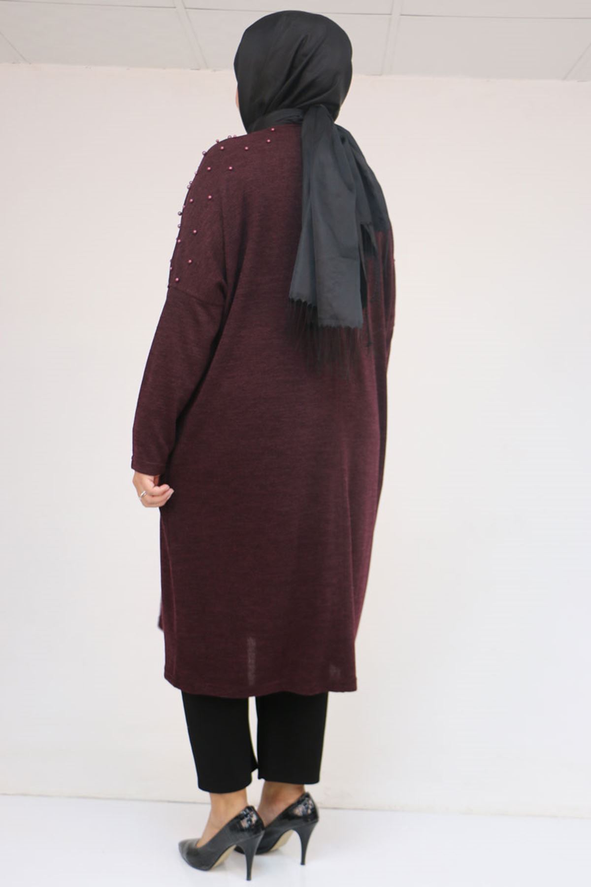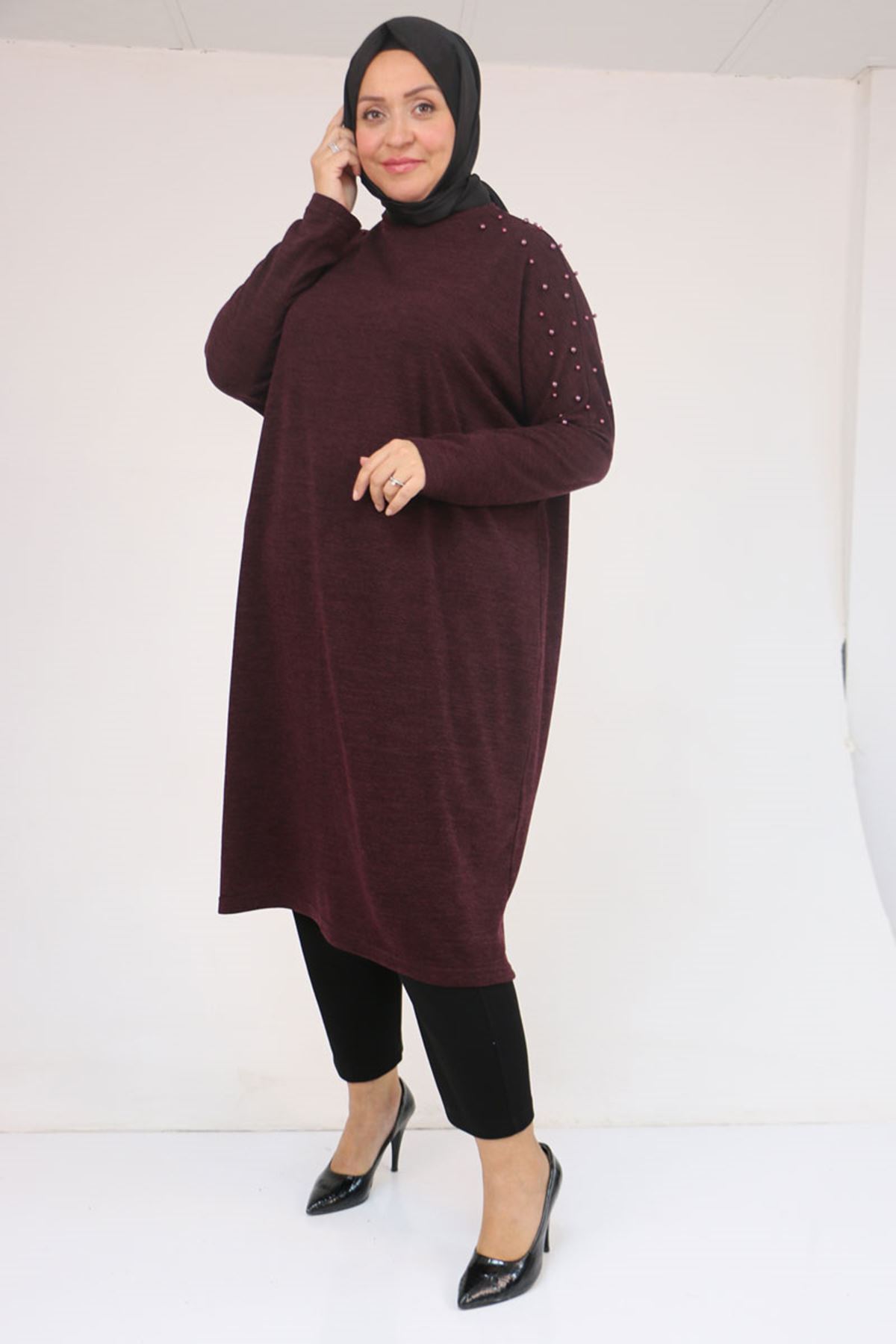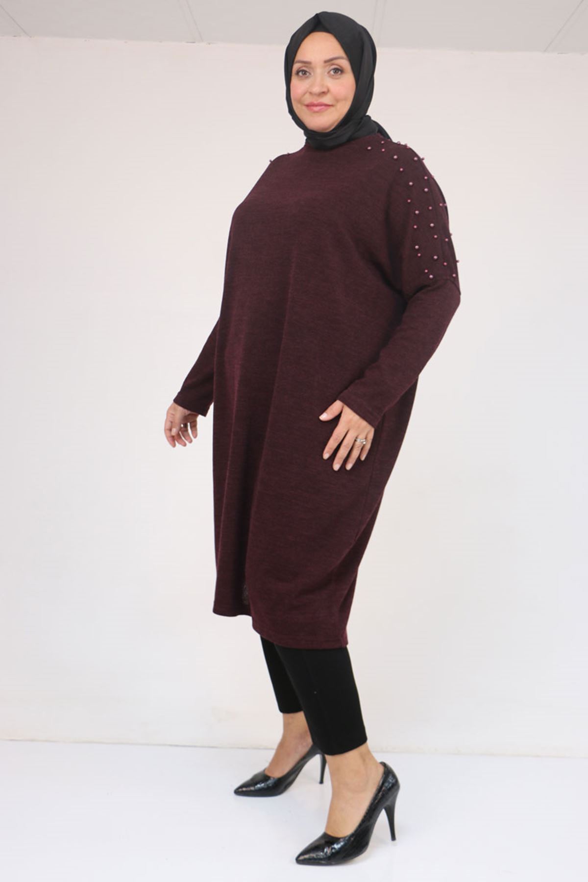 58152 Büyük Beden Düşükkol Omzu Taş Detaylı Mir Tunik - Mürdüm