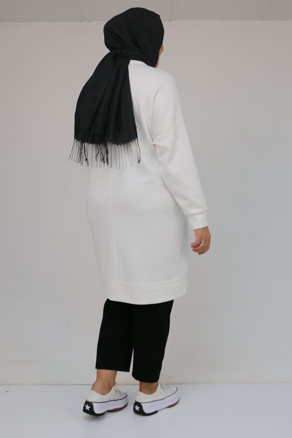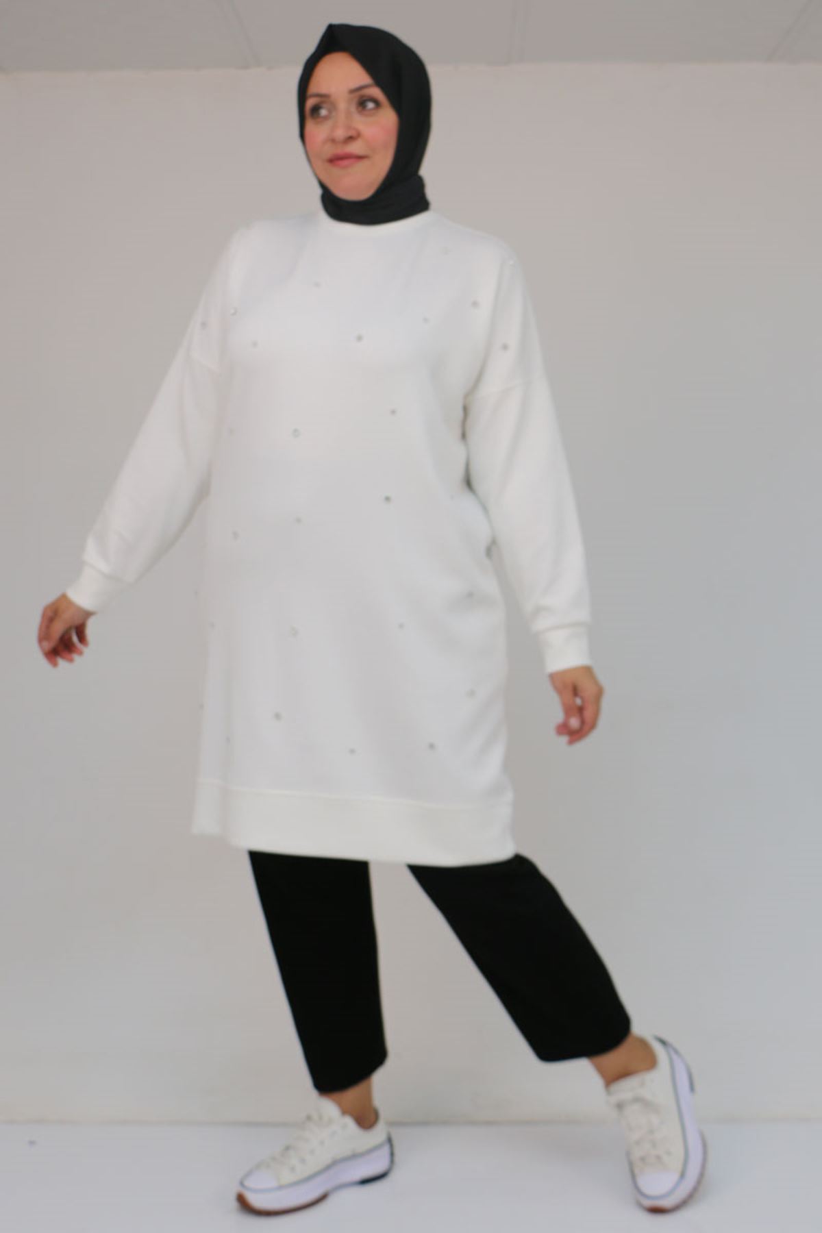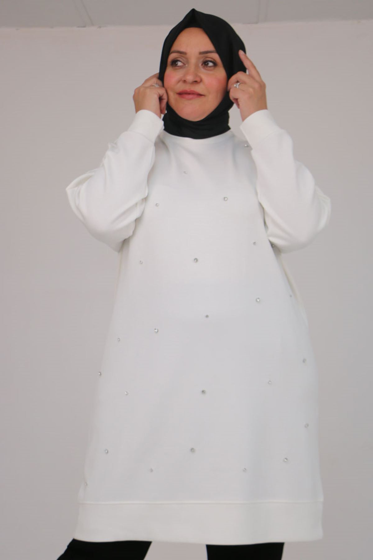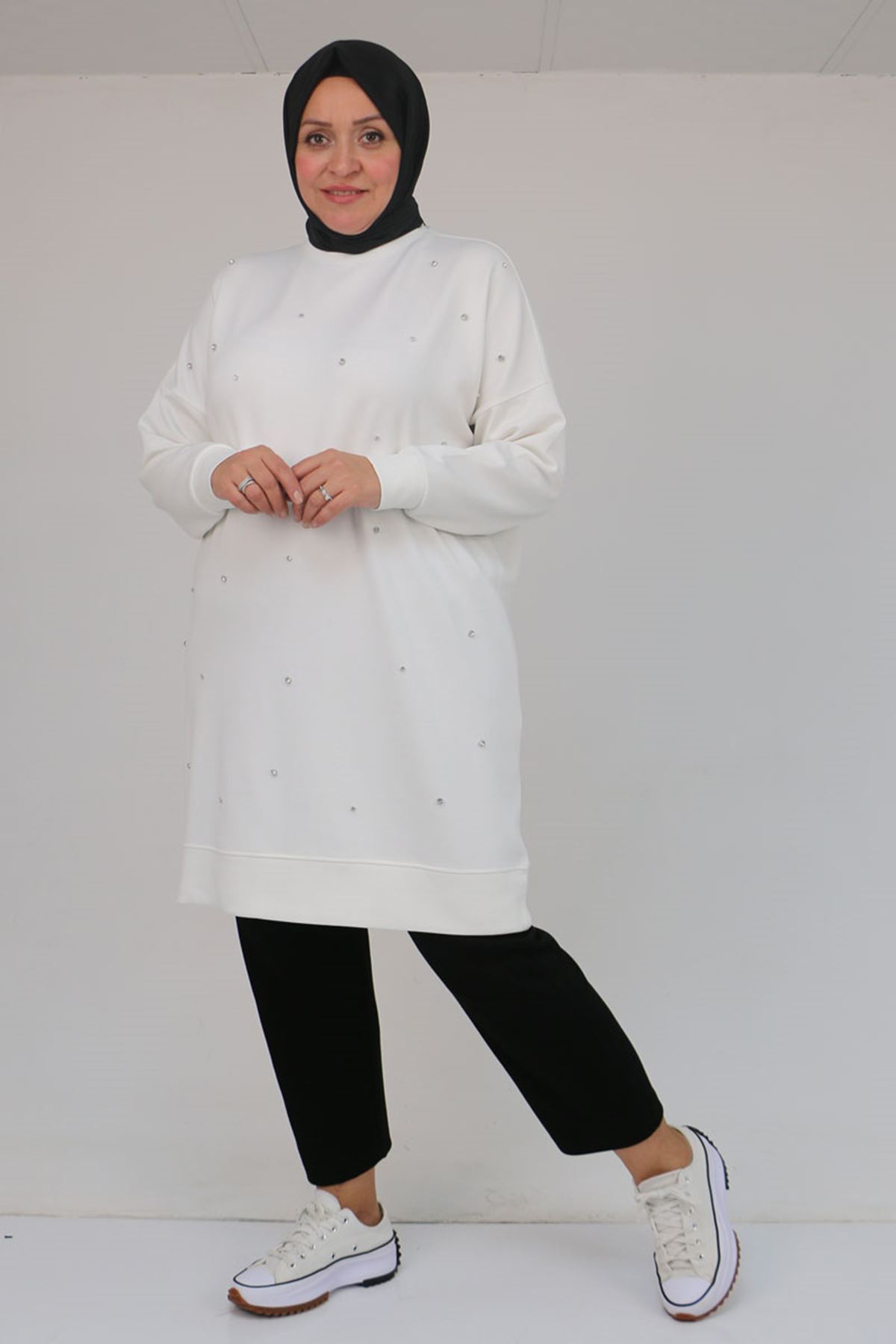 58157 Büyük Beden Beyoğlu Taş Çakmalı Modal Tunik - Ekru