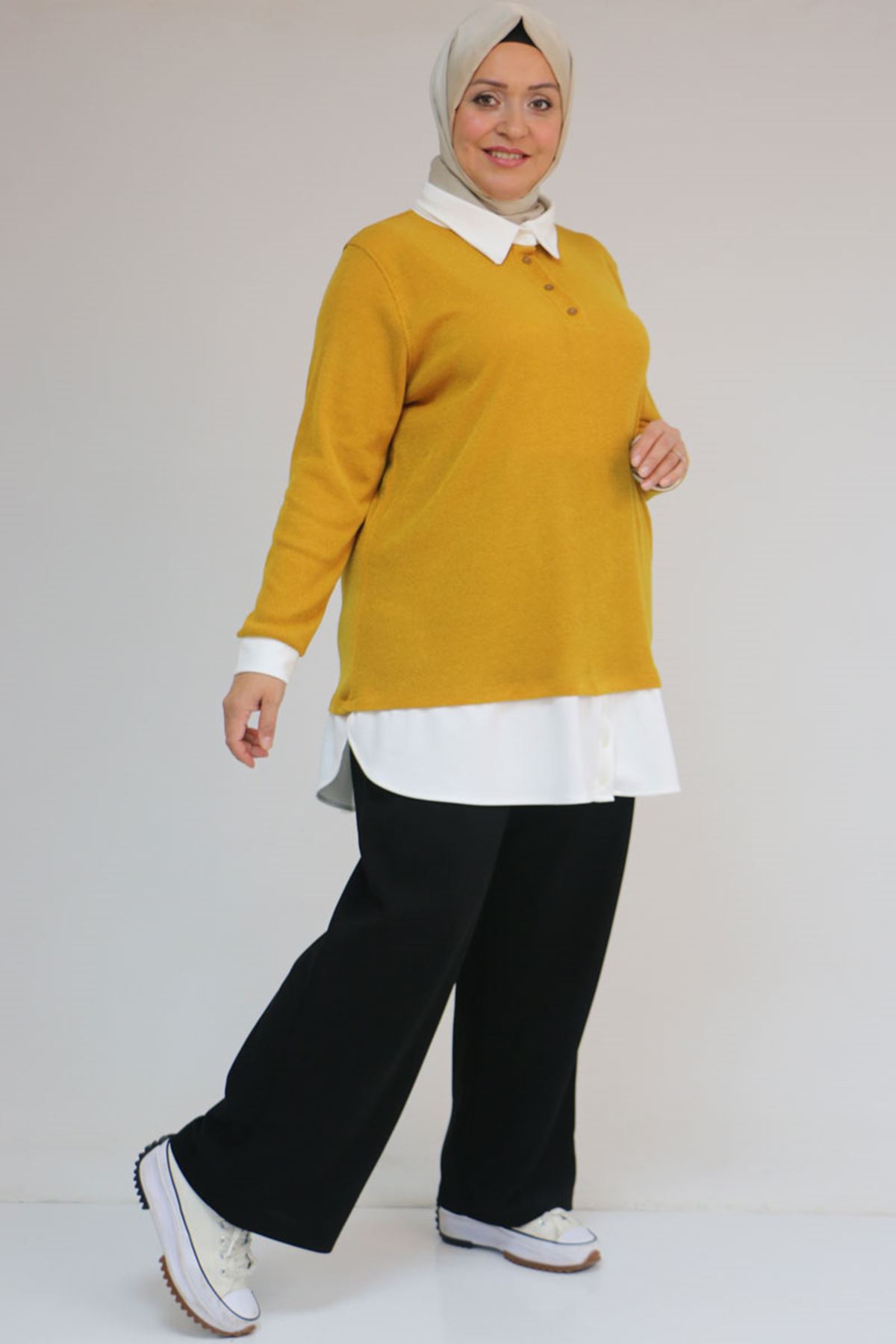 58159 Büyük Beden Kot Garnili Mir Tunik - Hardal