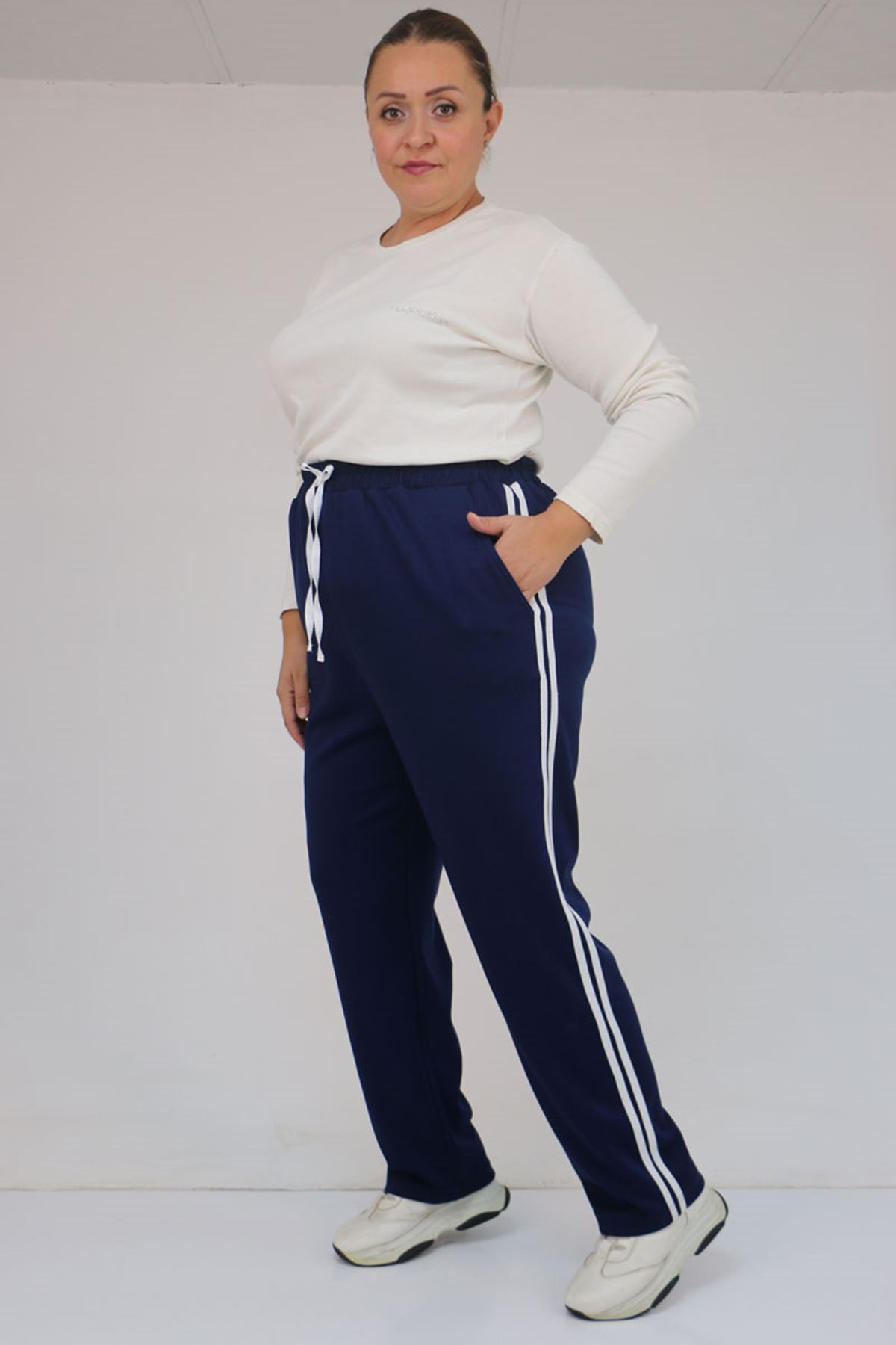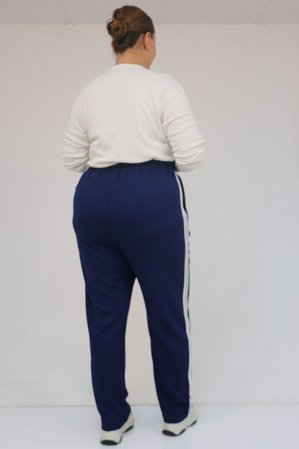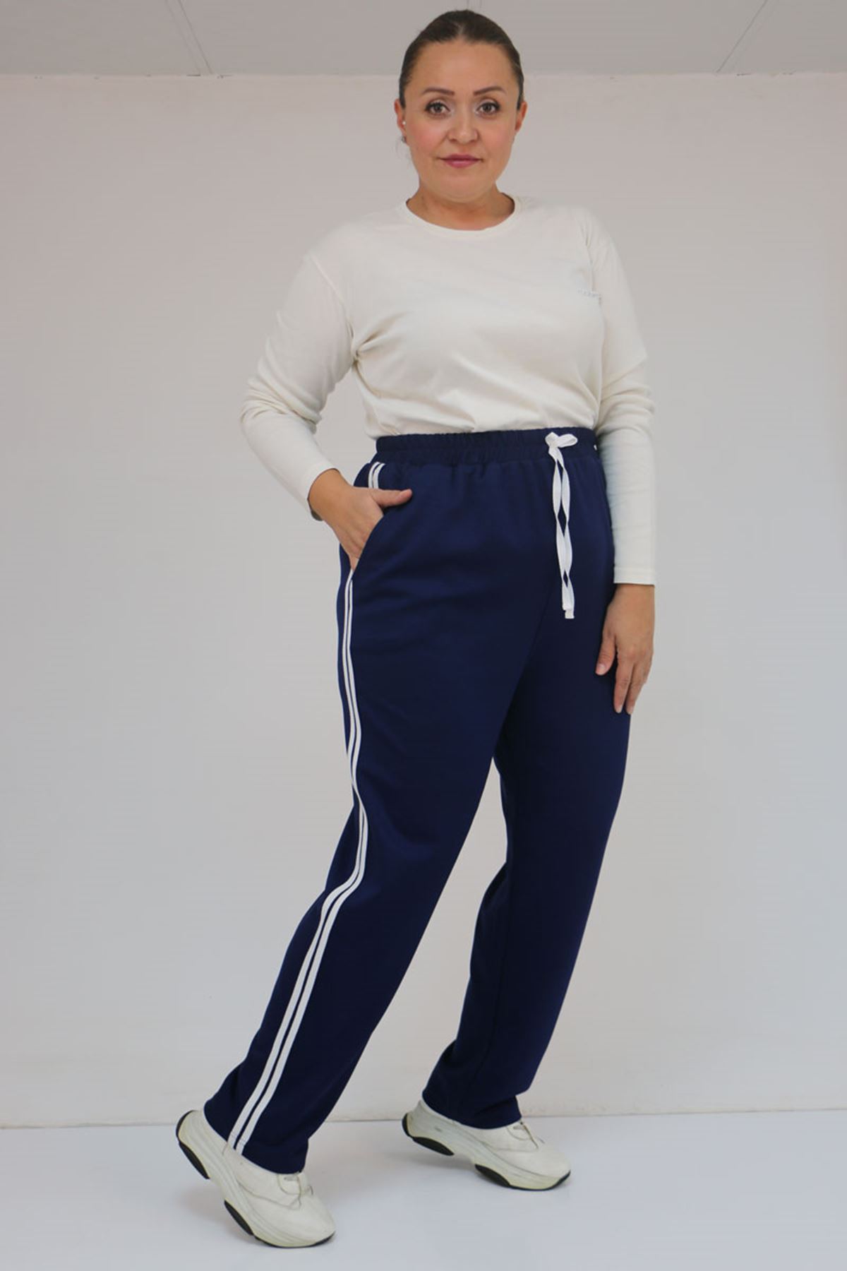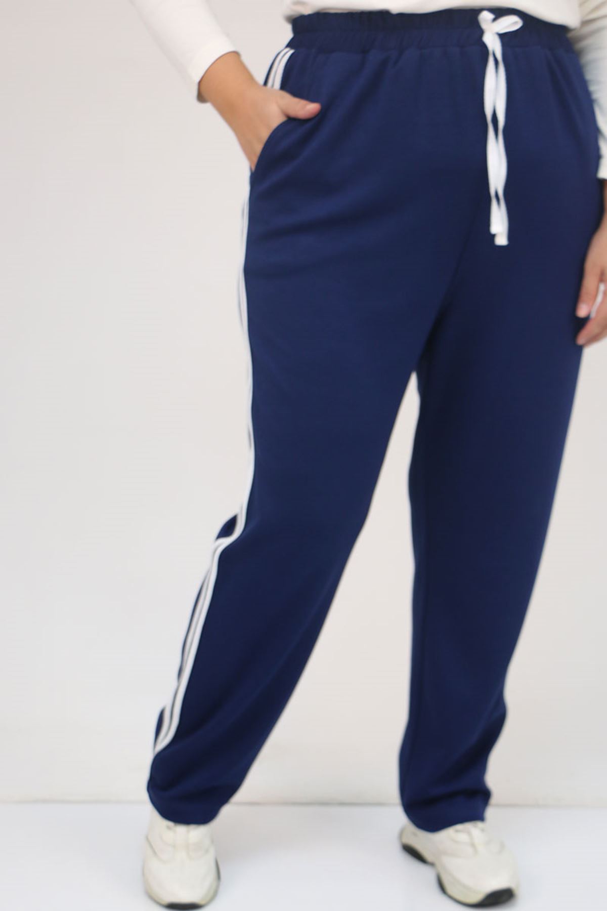 59505 Büyük Beden Yüksekbel Yanları Şeritli Modal Eşofman Altı - İndigo