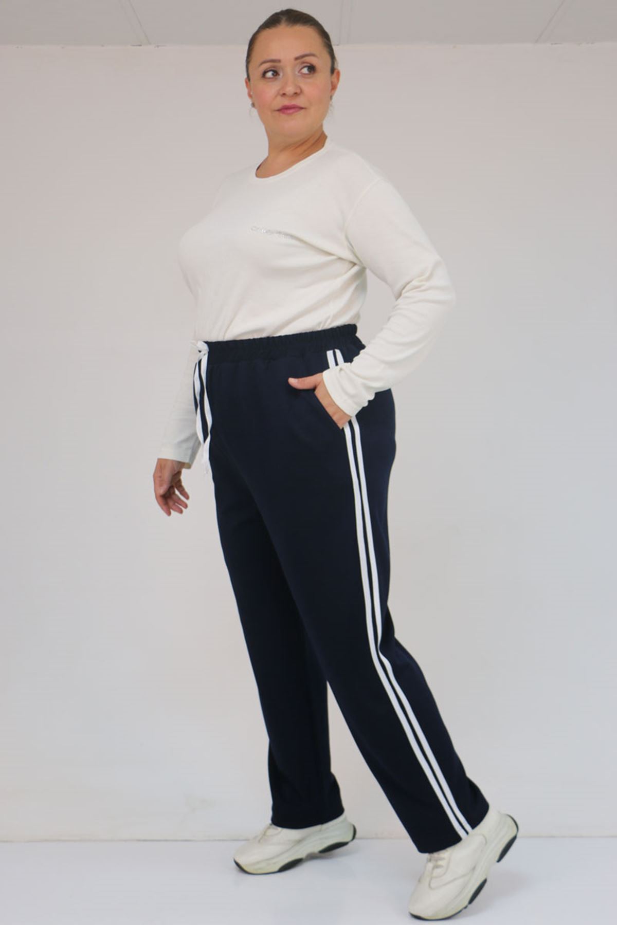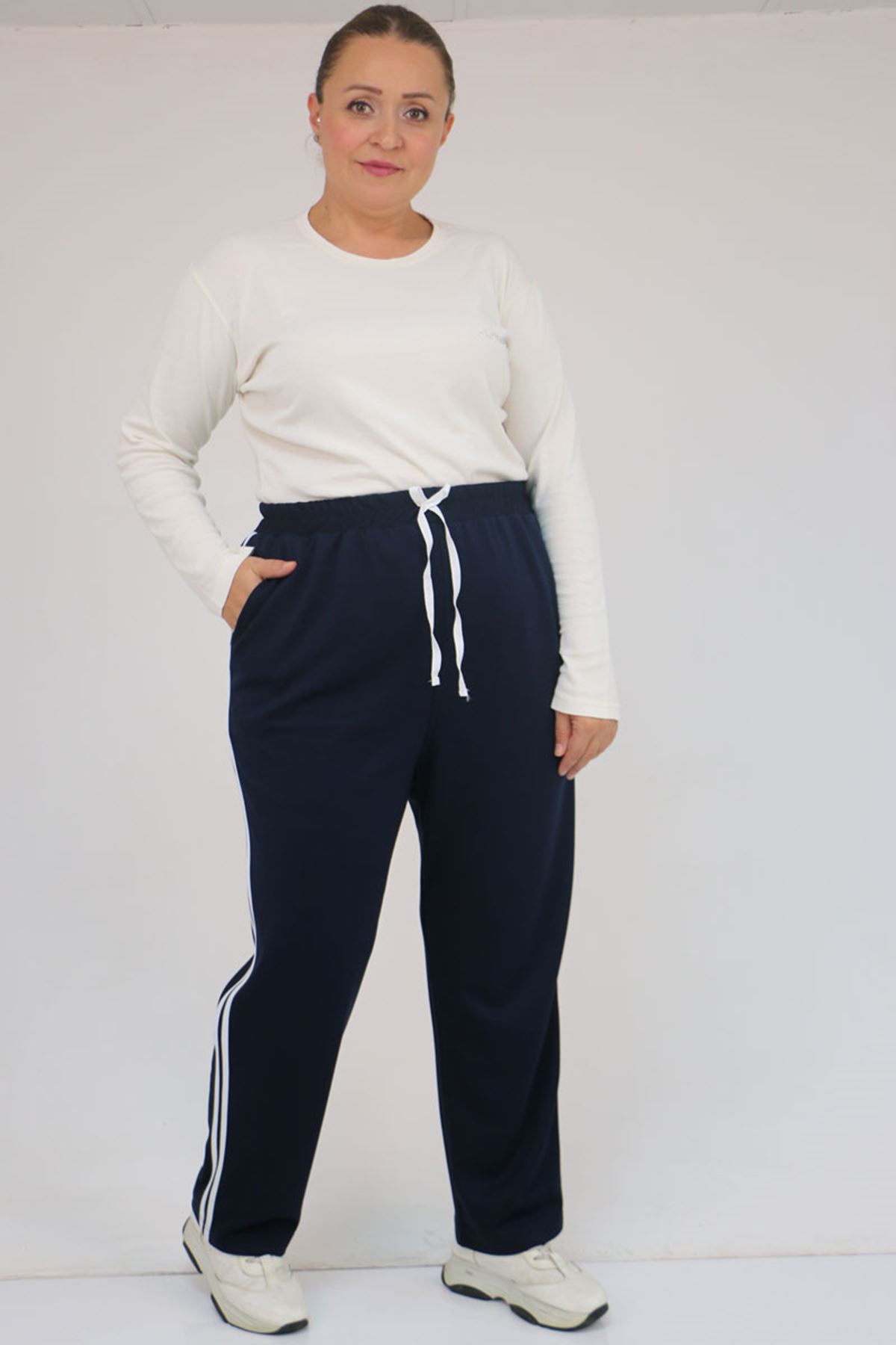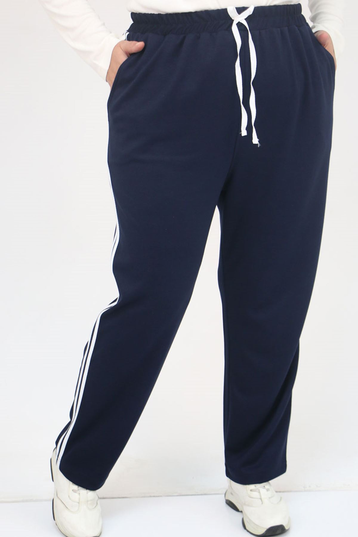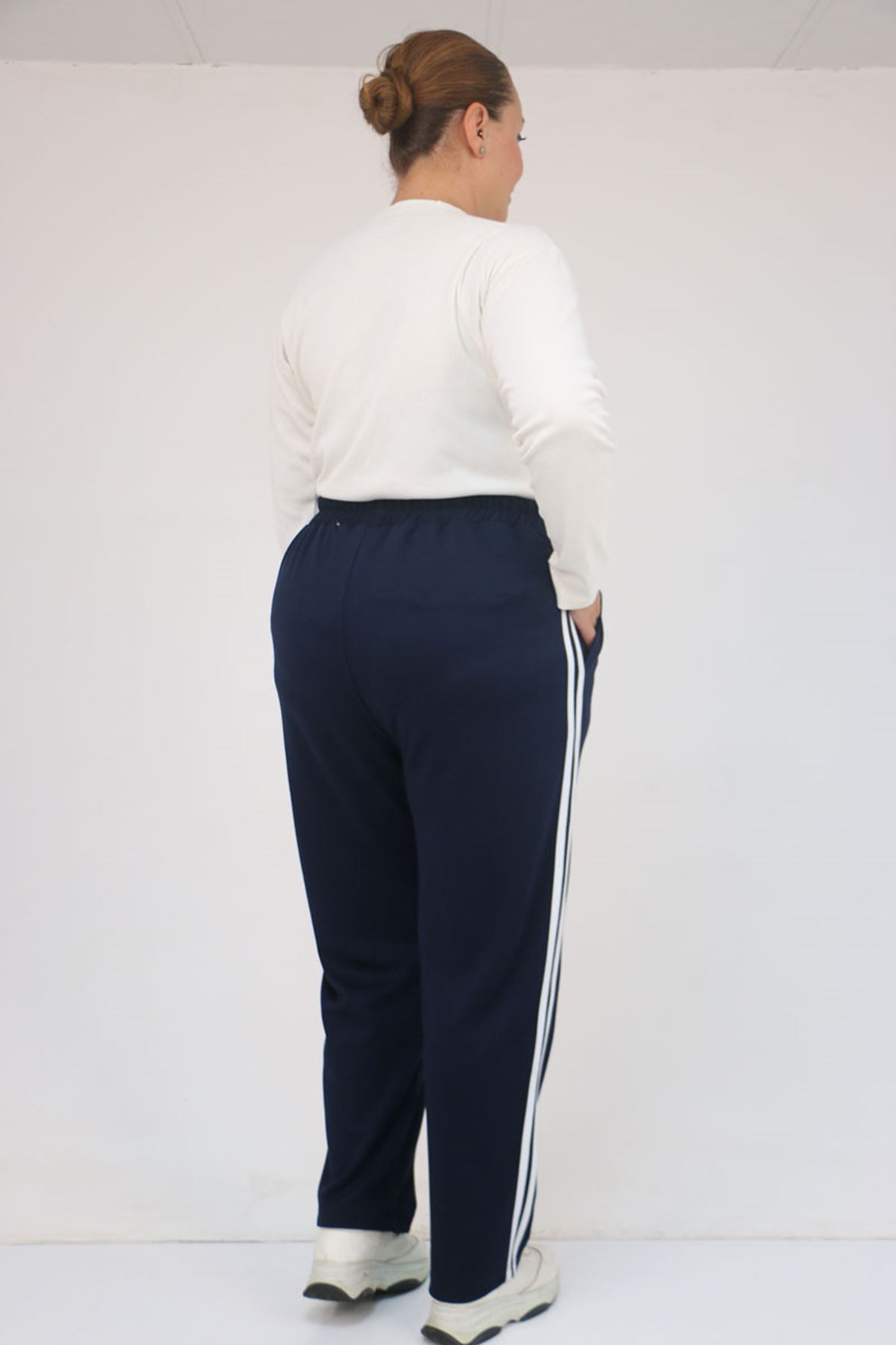59505 Büyük Beden Yüksekbel Yanları Şeritli Modal Eşofman Altı - Lacivert