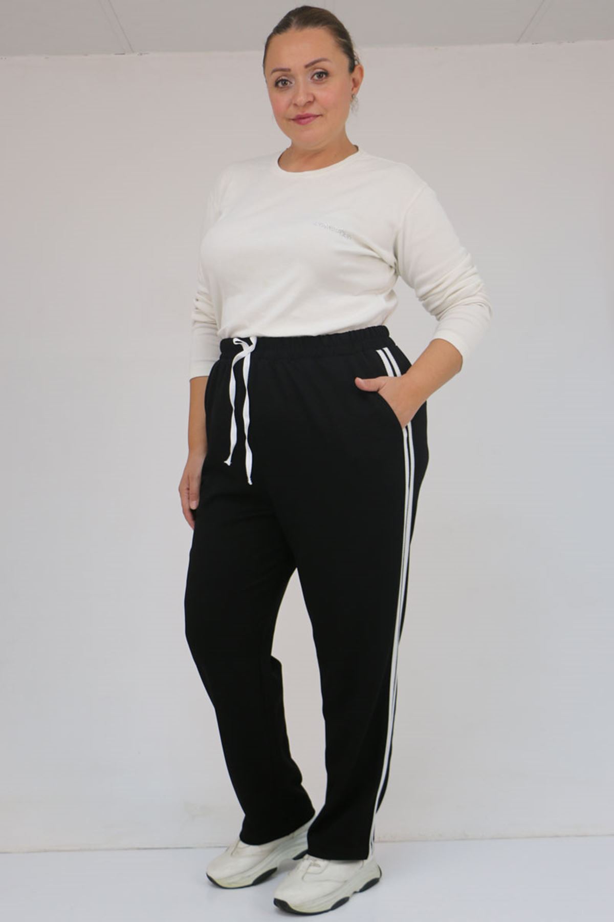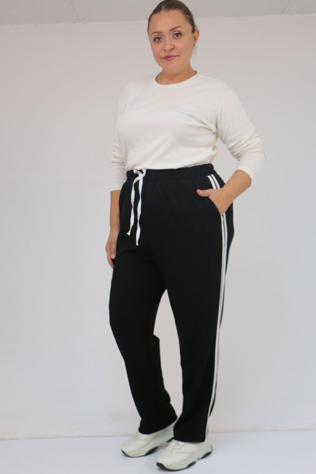 59505 Büyük Beden Yüksekbel Yanları Şeritli Modal Eşofman Altı - Siyah