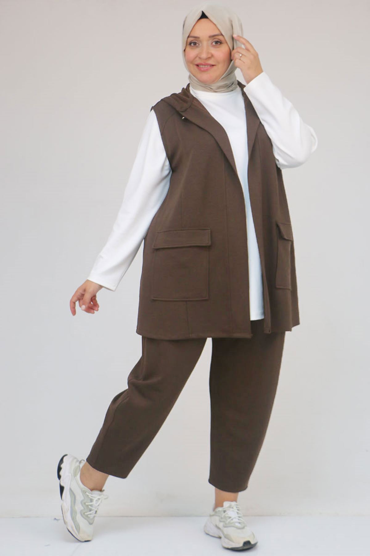 D-57305 Büyük Beden Modal Yeleği Cepli Üçlü Takım - Kahve