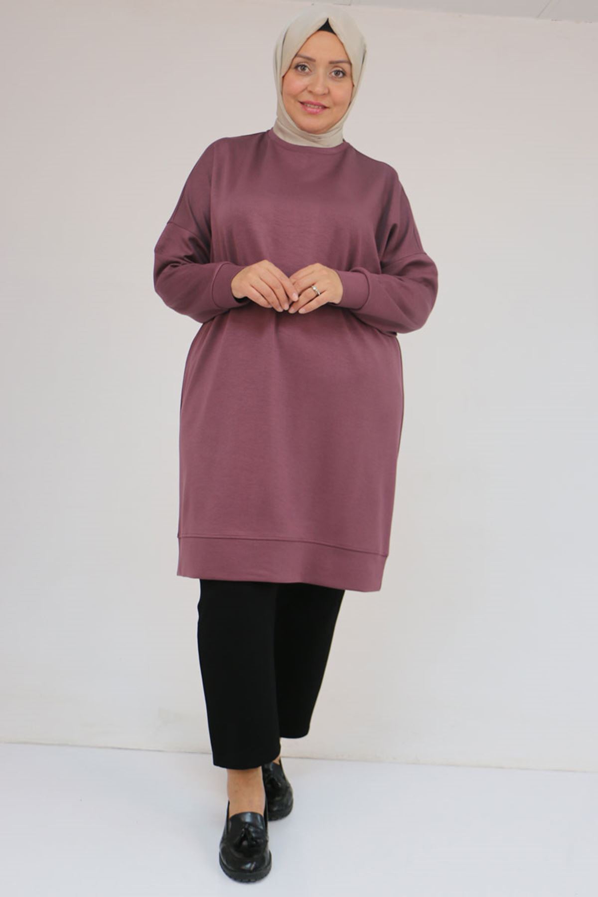 D-58151 Büyük Beden Kol Ve Etek Ucu Kendinden Ribanalı Modal Tunik - Gül Kurusu