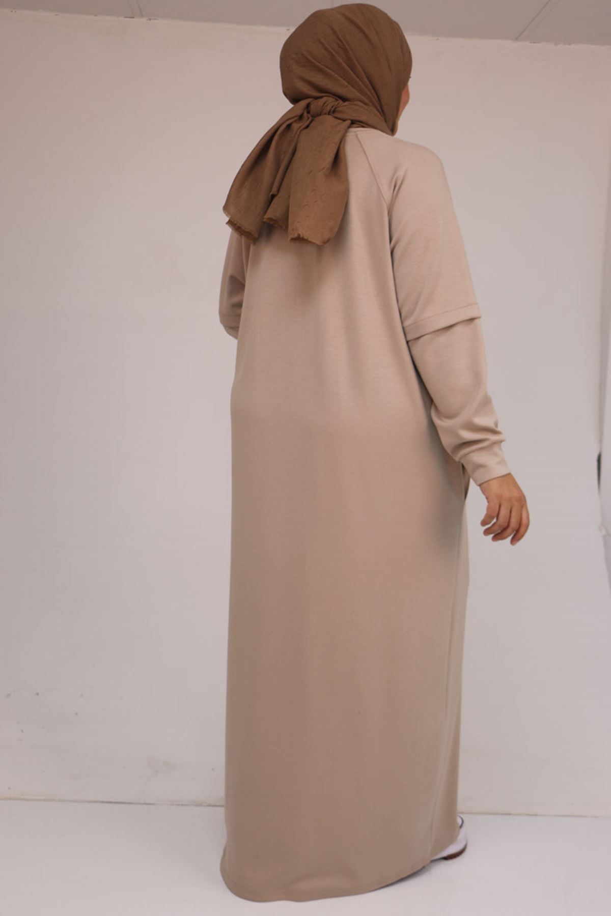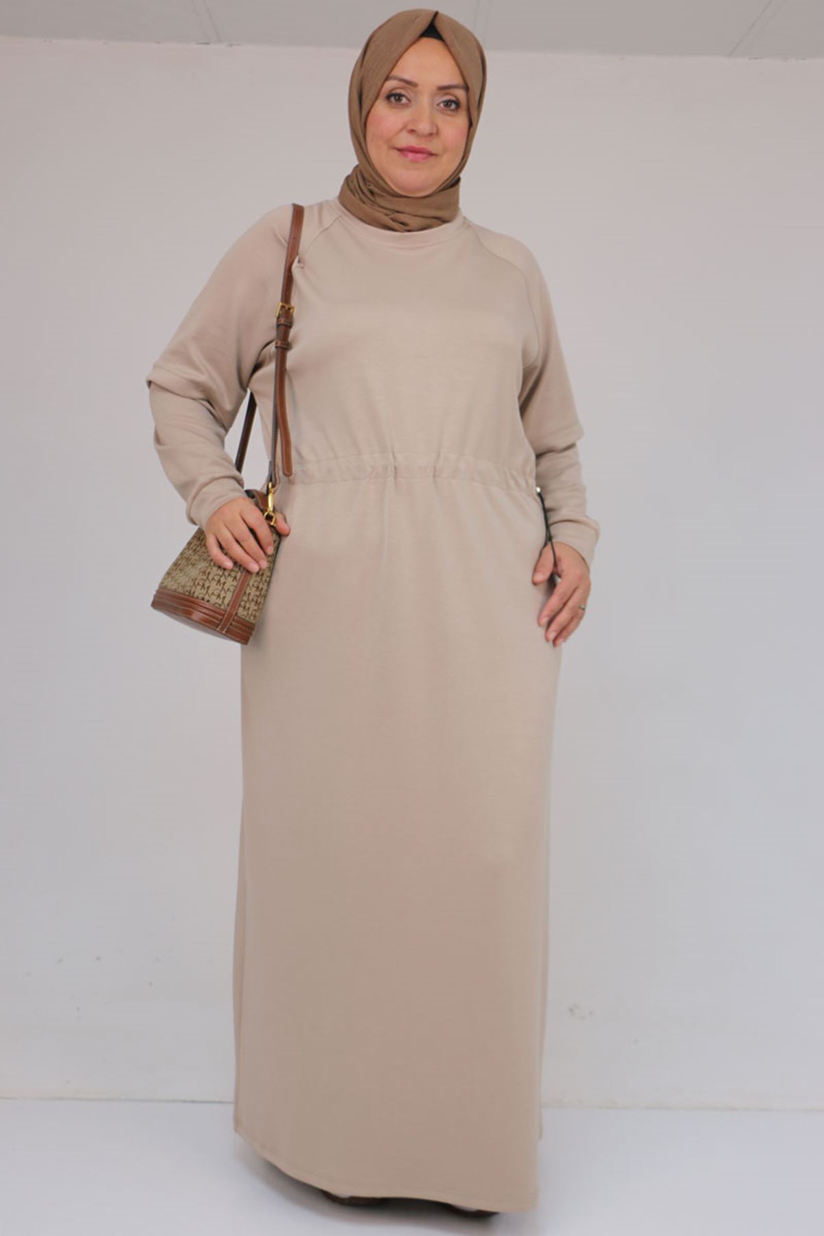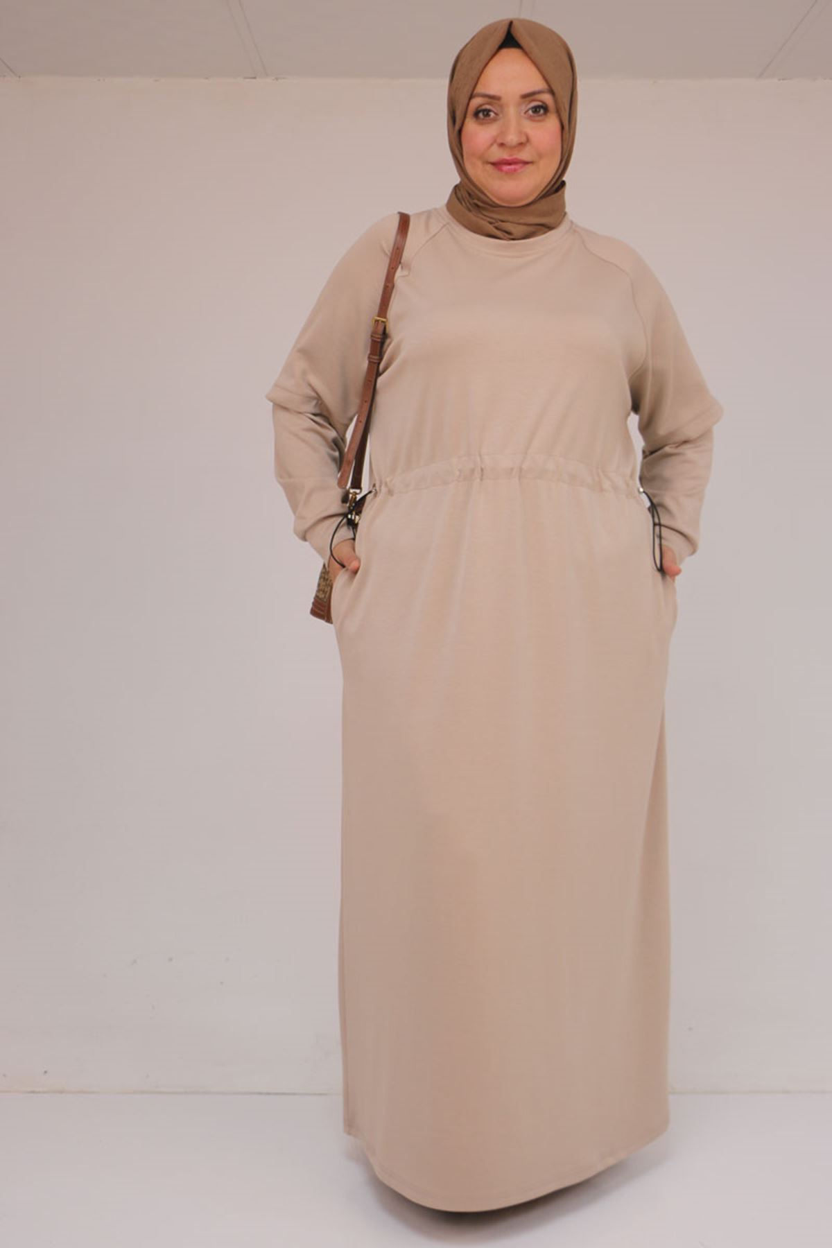 42032 Büyük Beden Beli Lastikli Modal Elbise - Bej