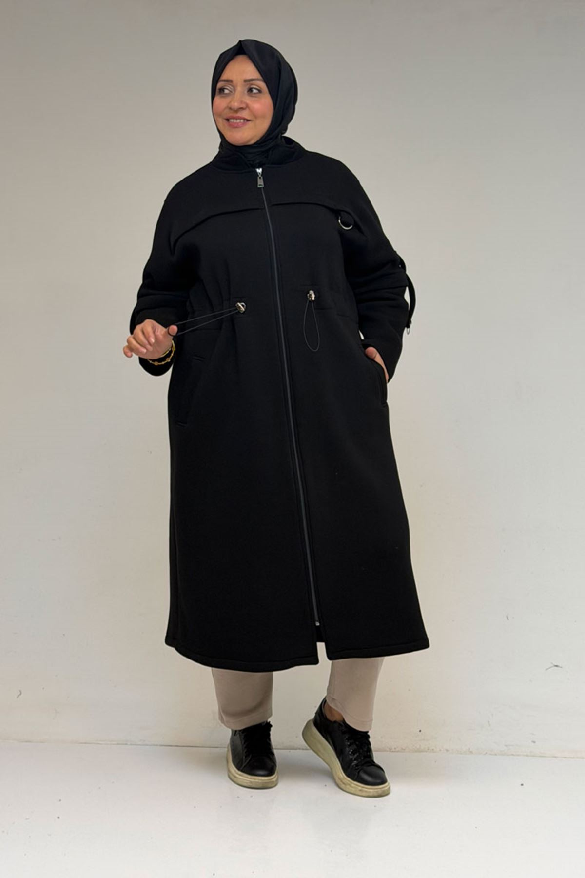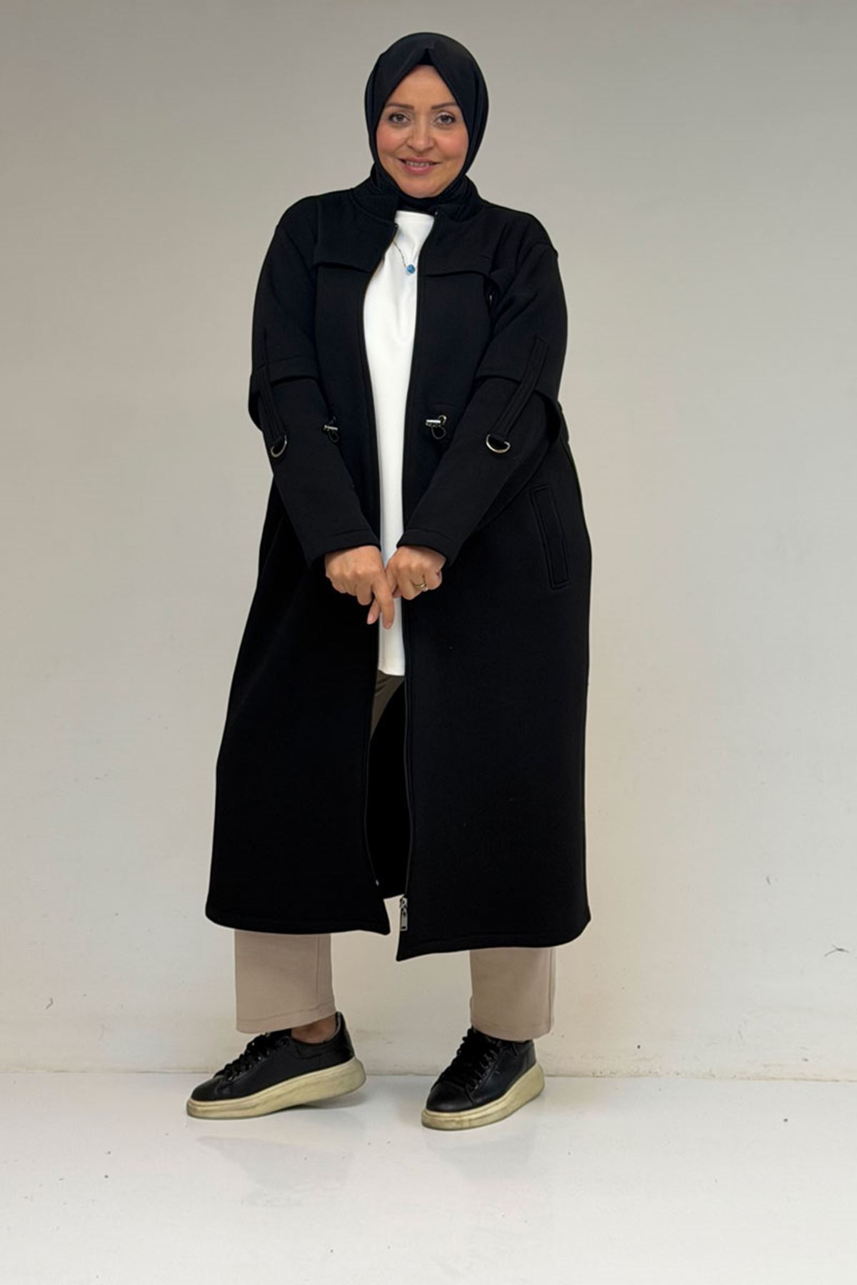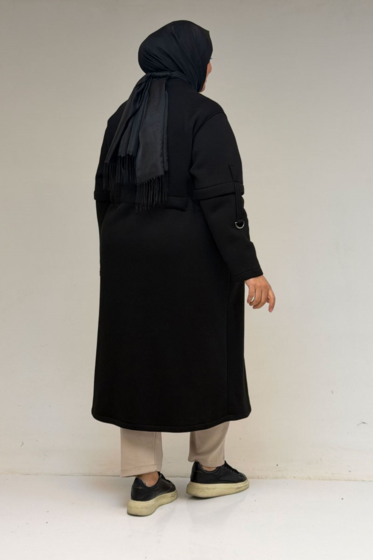43065 Büyük Beden Hakim Yaka Önden Fermuarlı Üç İplik Kap - Siyah