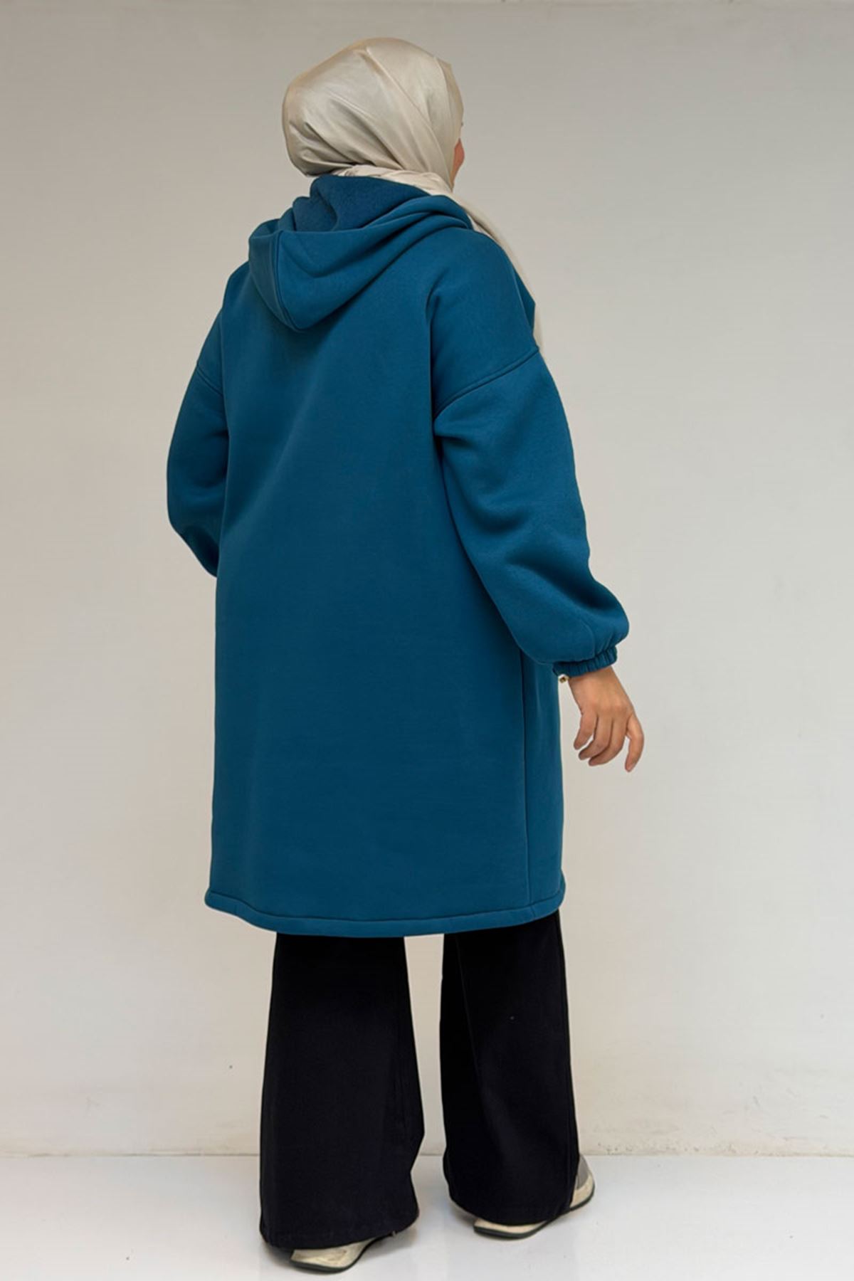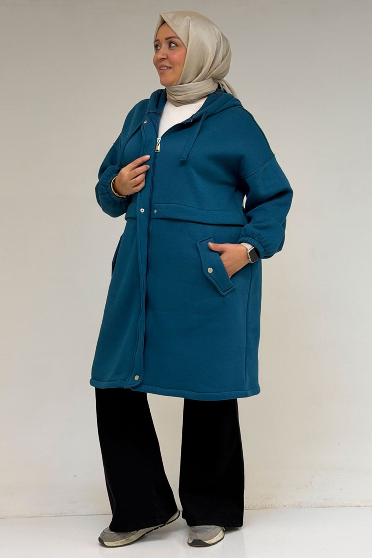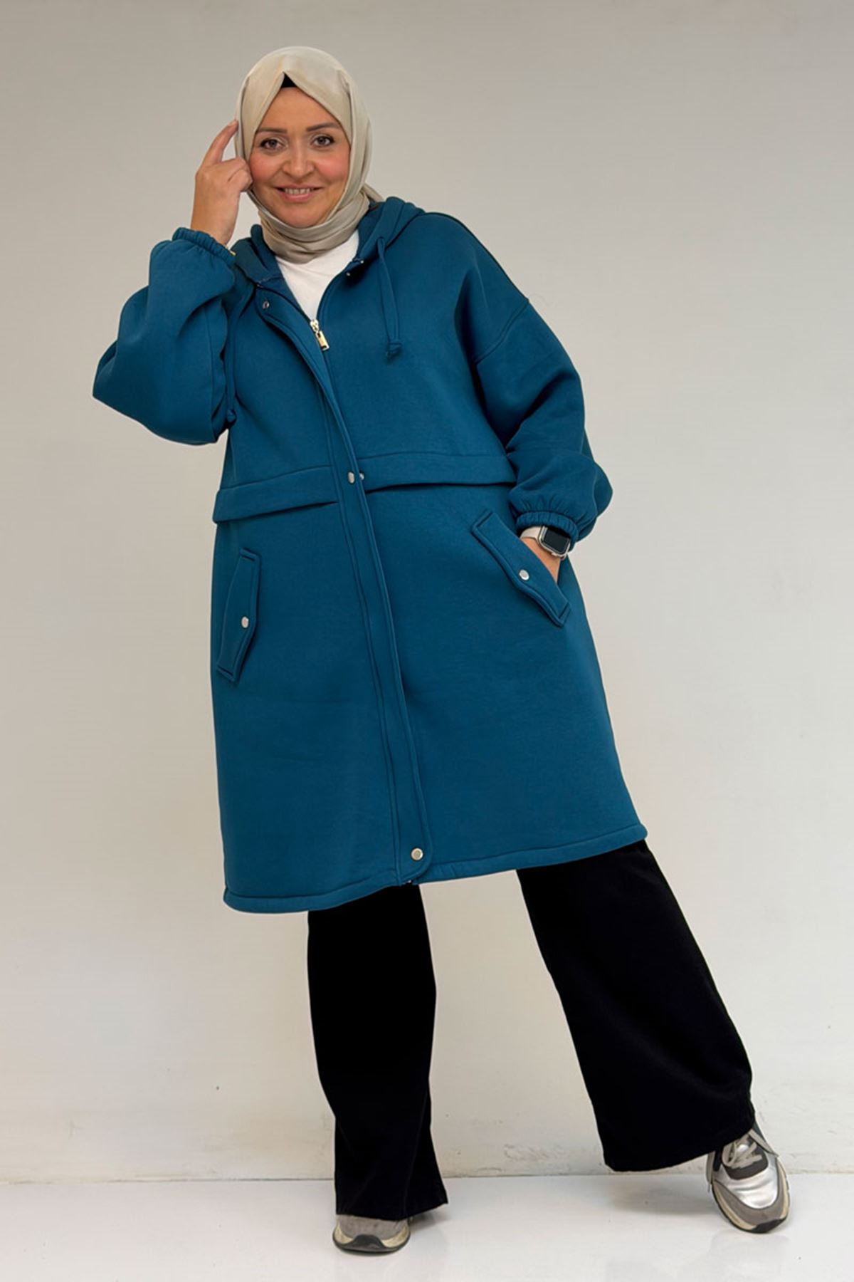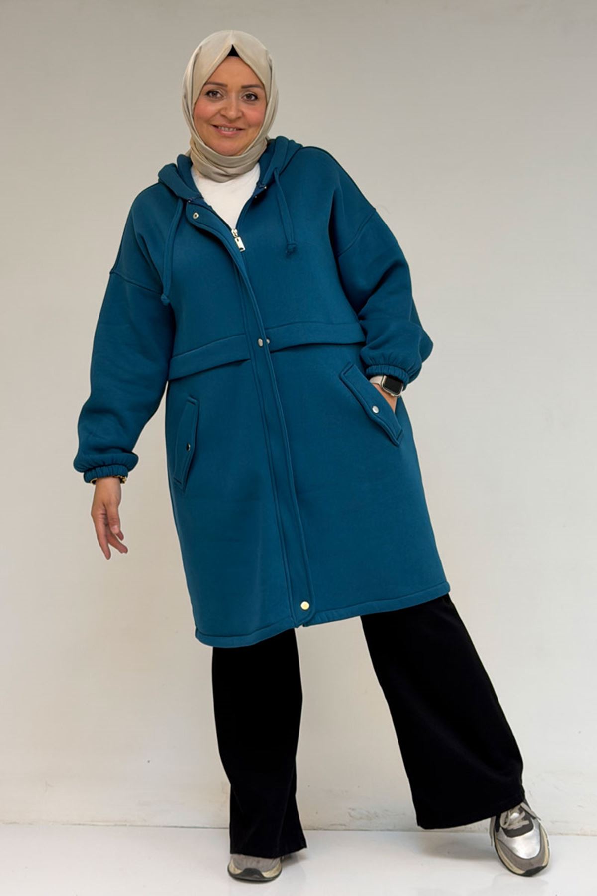 43076 Büyük Beden Cepli Kapşonlu Üç İplik Kap - Petrol