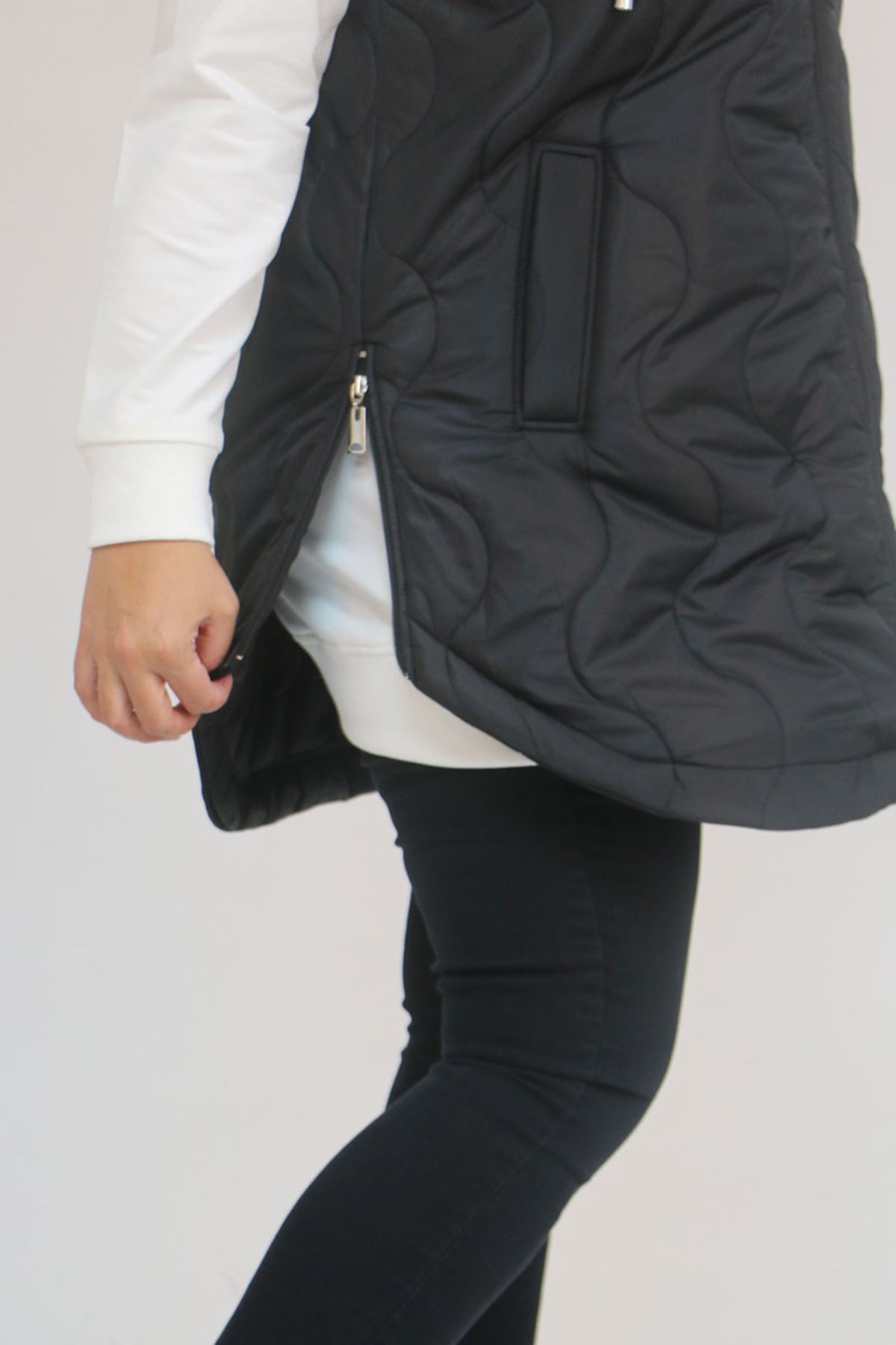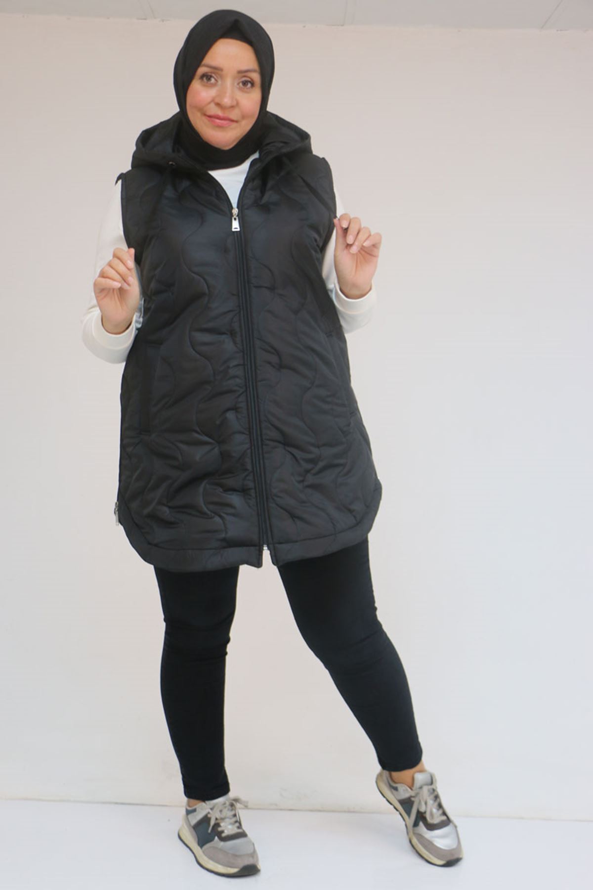 44007 Büyük Beden Yanı Yırtaçlı Oval Kesim Kapitone Yelek - Siyah