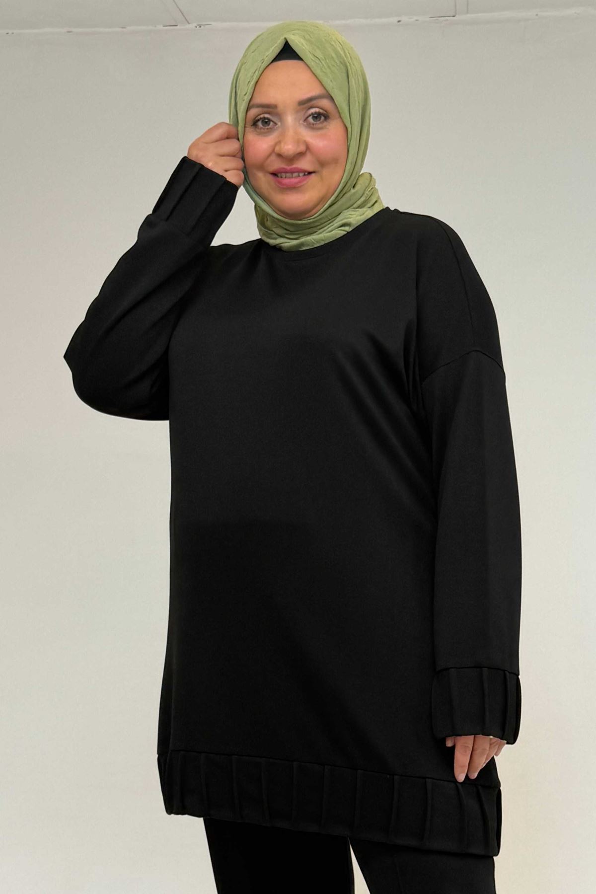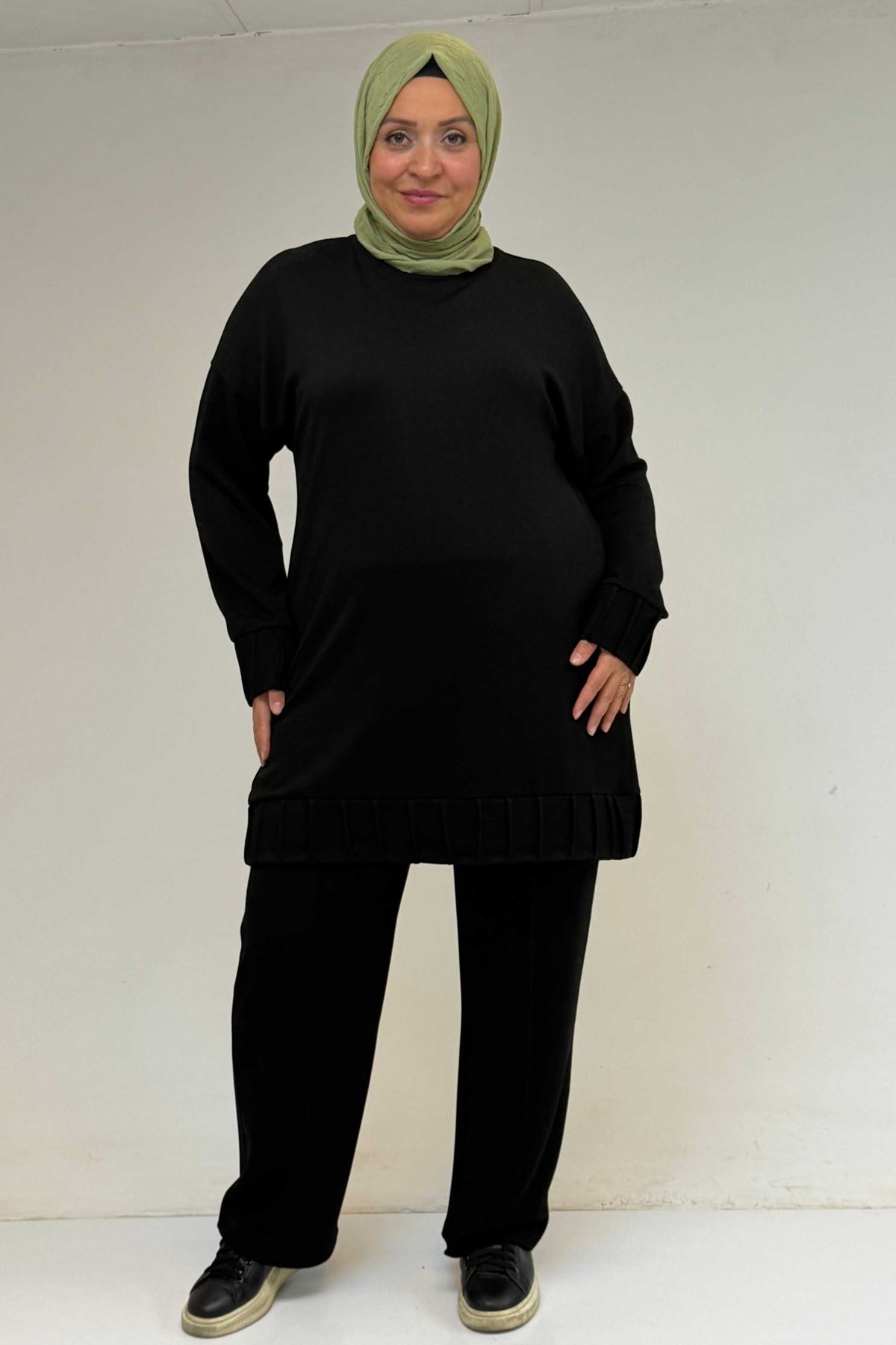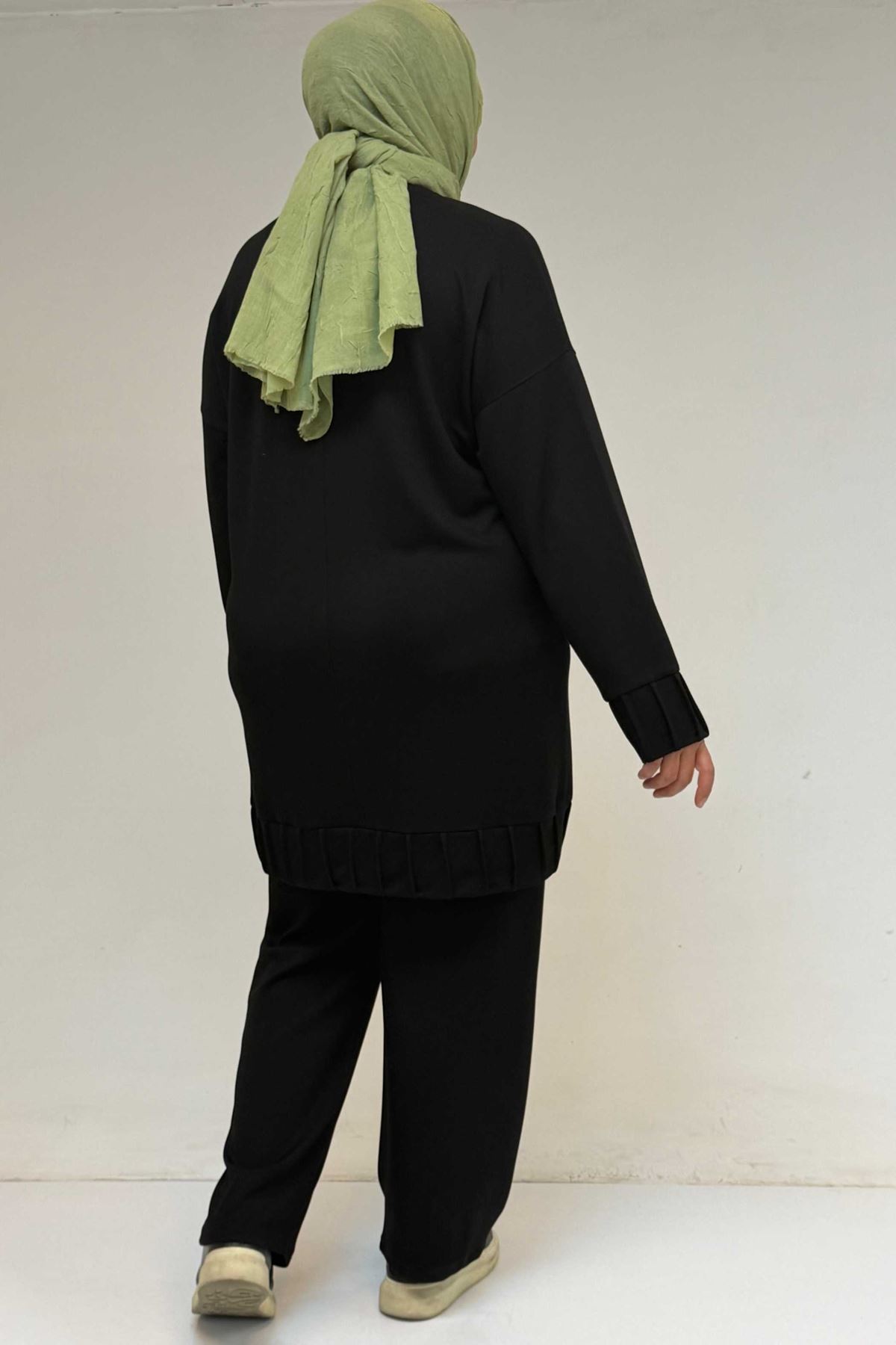 47069 Büyük Beden Çıma Detaylı Modal Pantolonlu Takım - Siyah