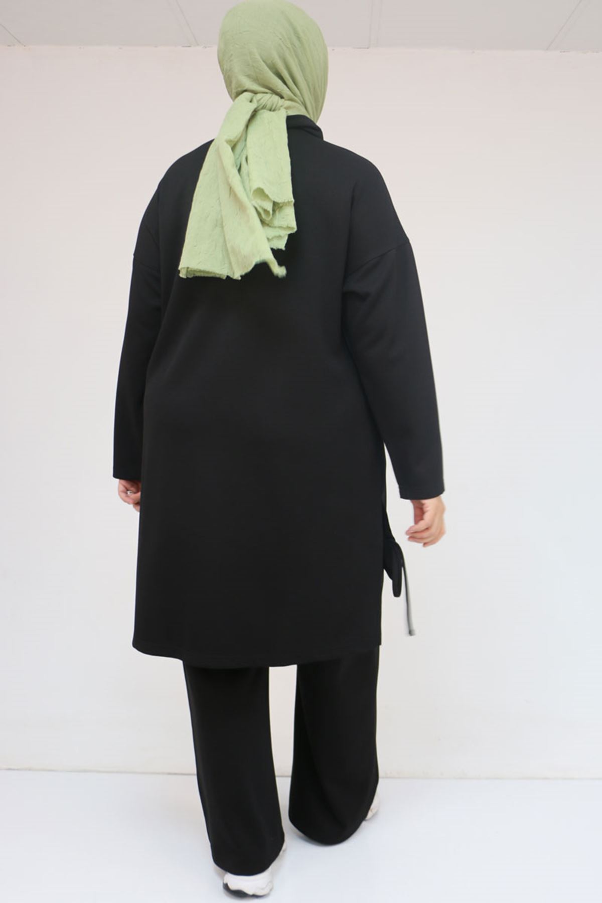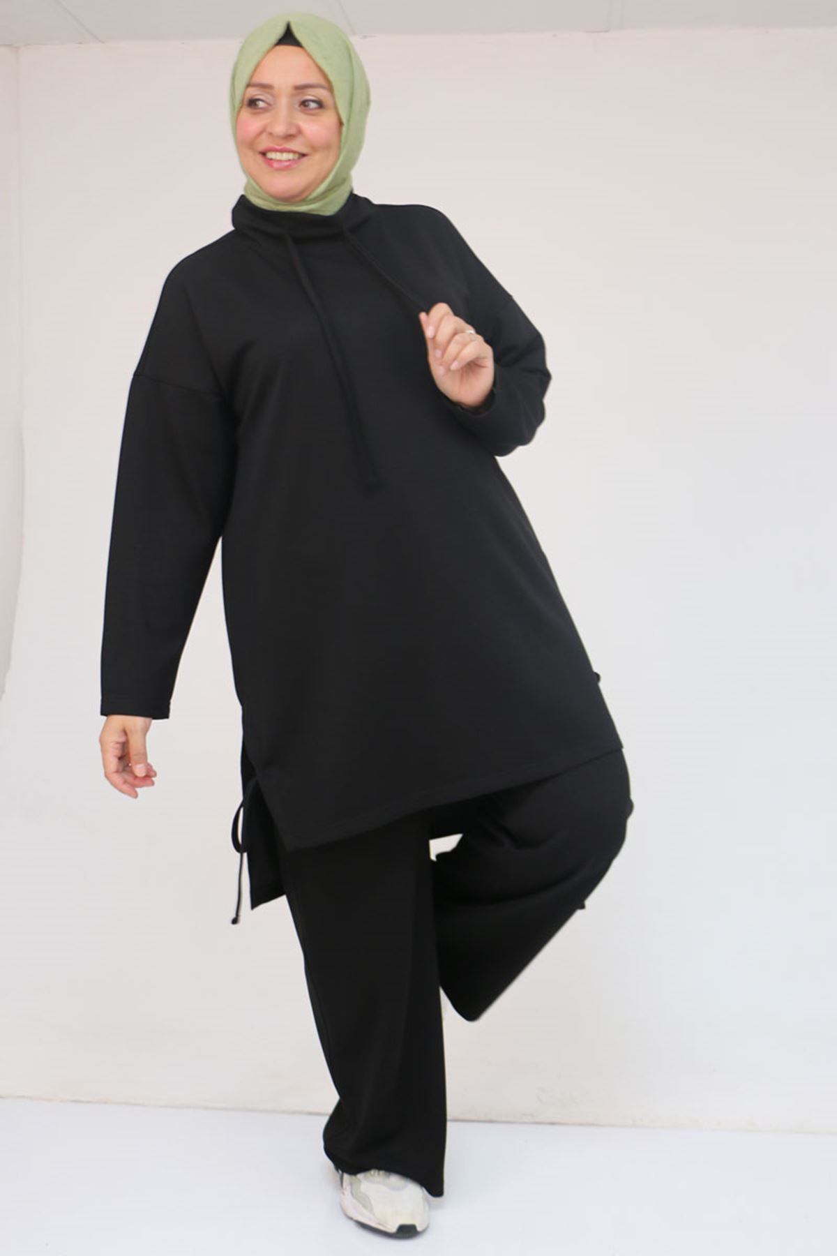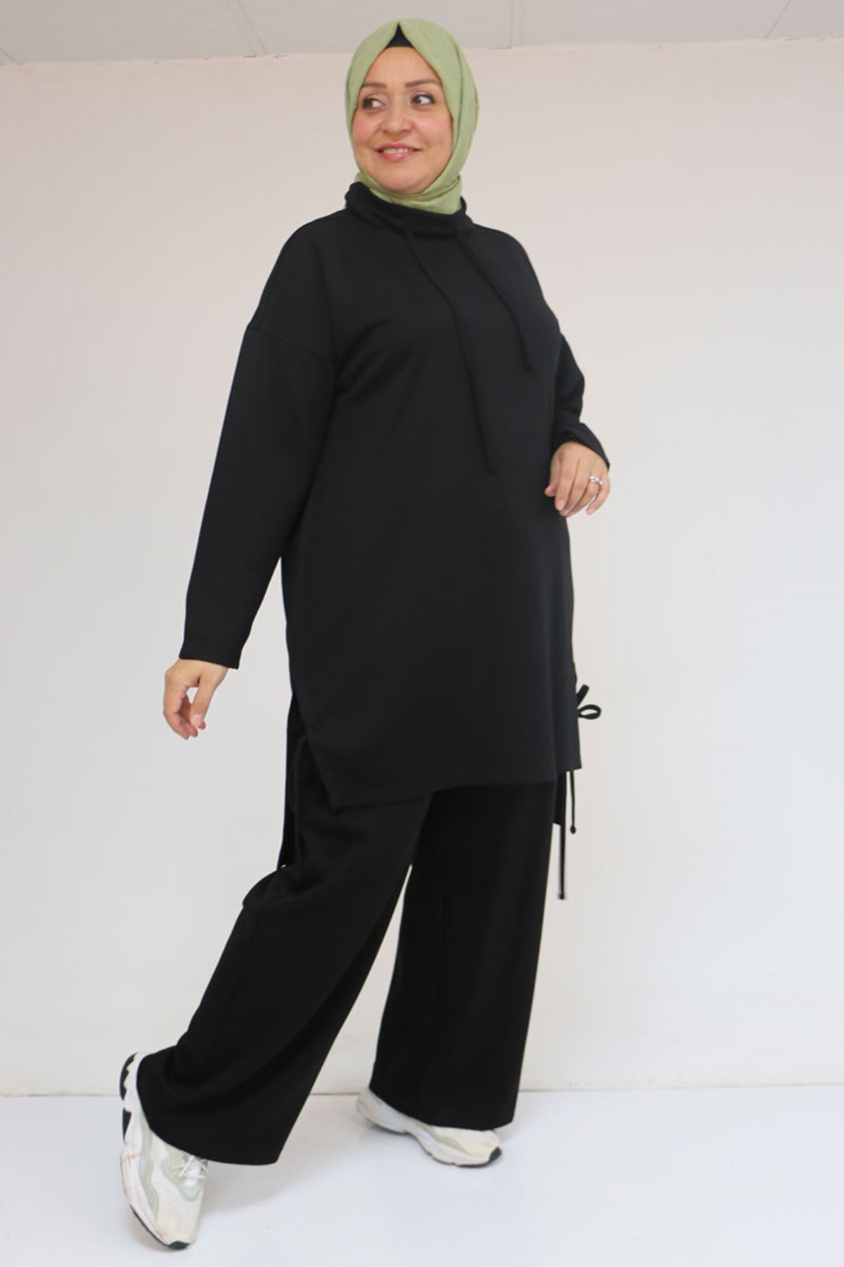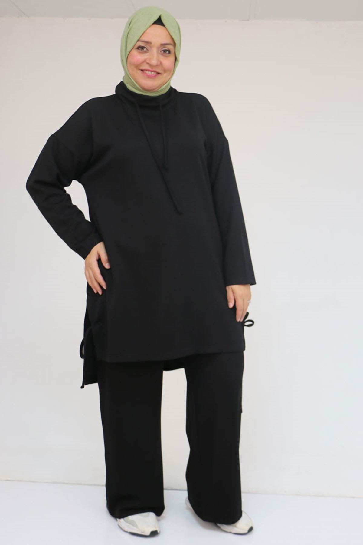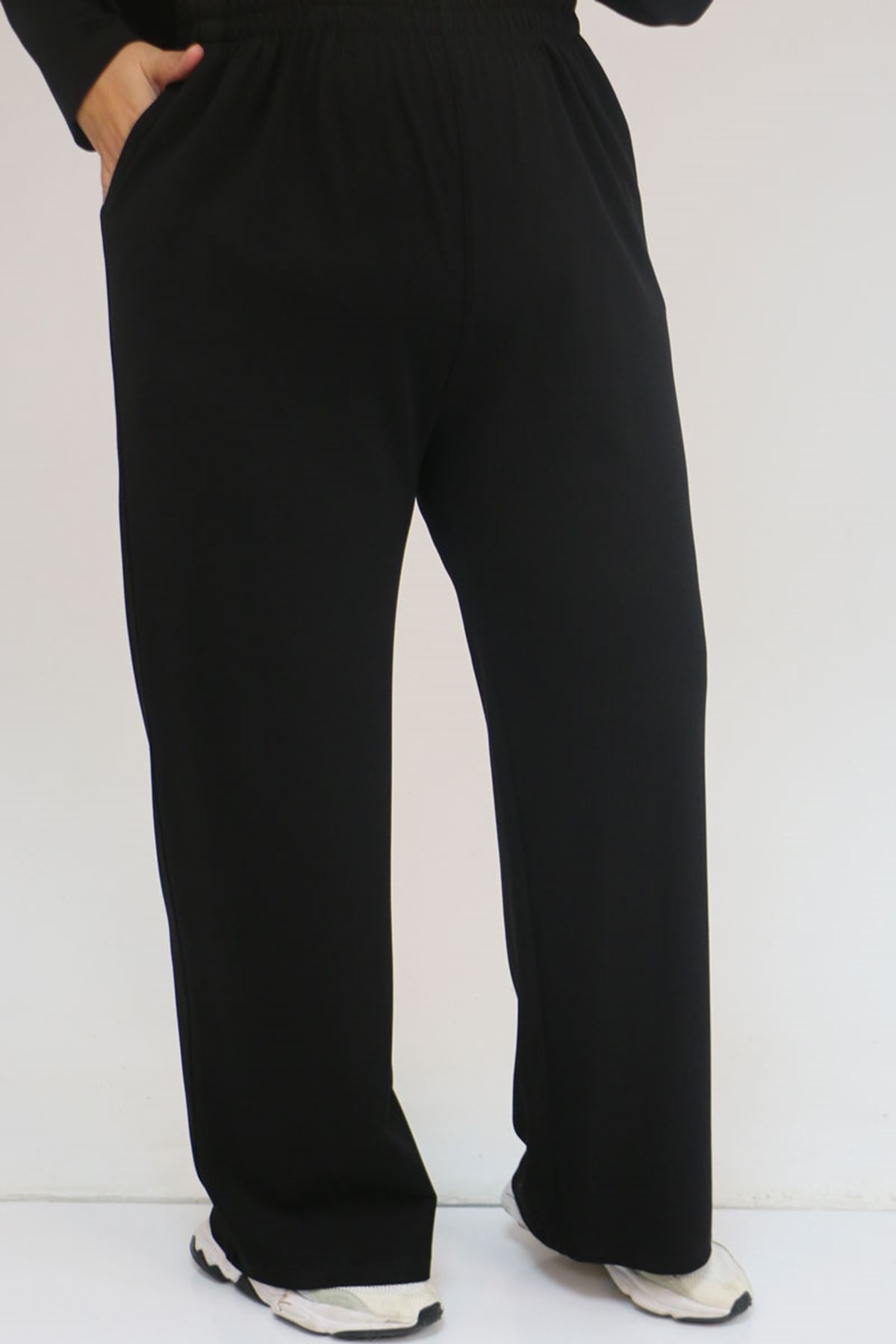 47094 Büyük Beden Boğazlı Yaka Pantolonlu Modal Takım - Siyah