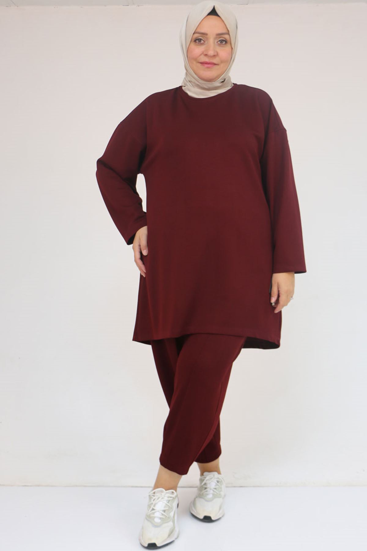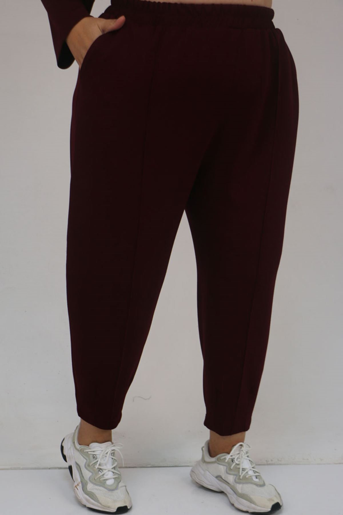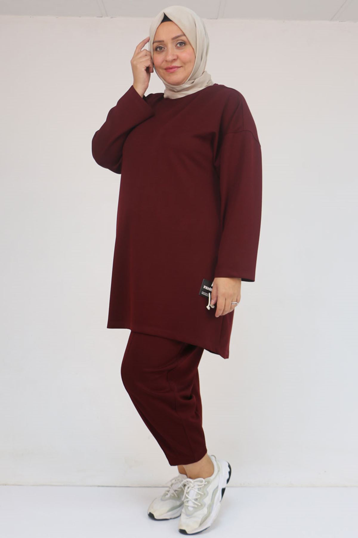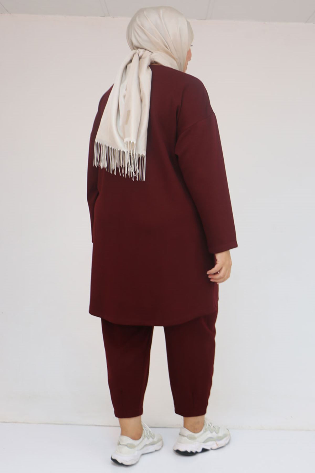 47095 Büyük Beden Yan Tarafı Arma Detaylı Modal Pantolonlu Takım - Bordo