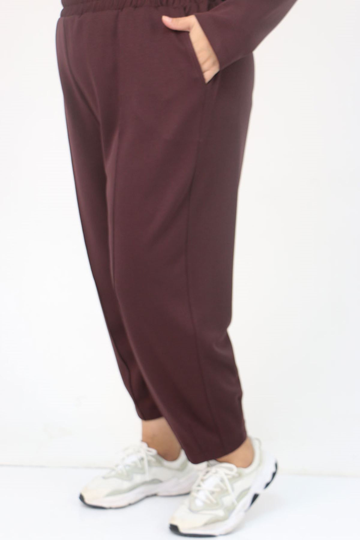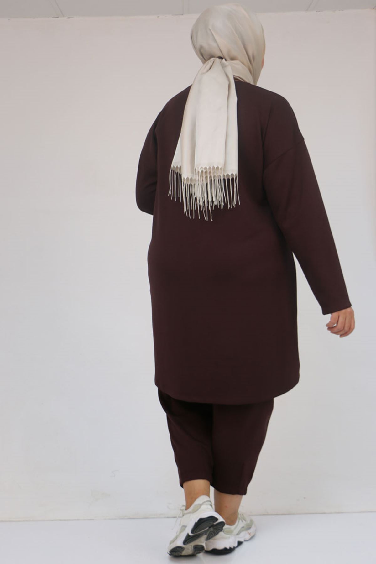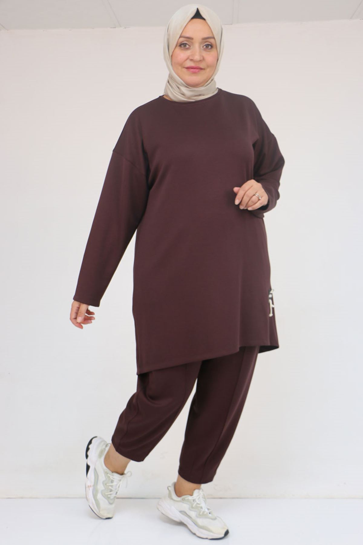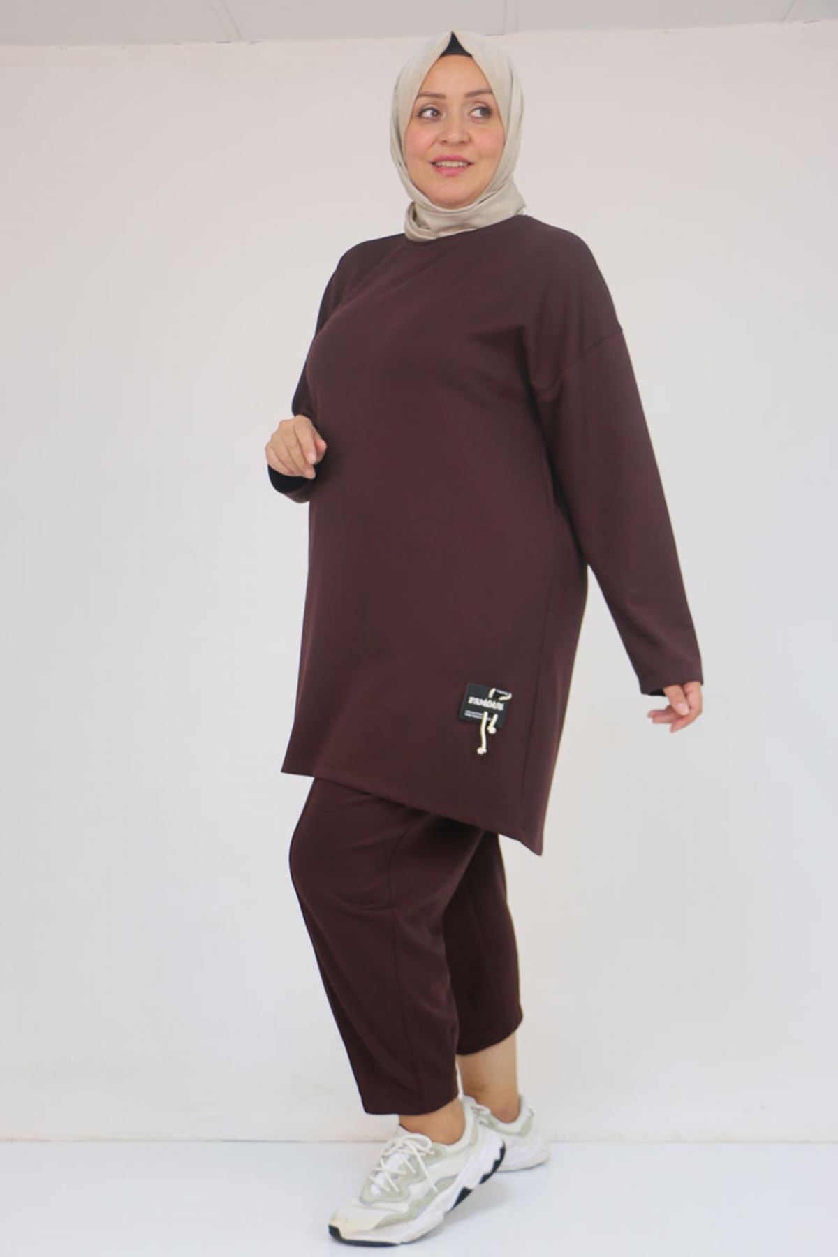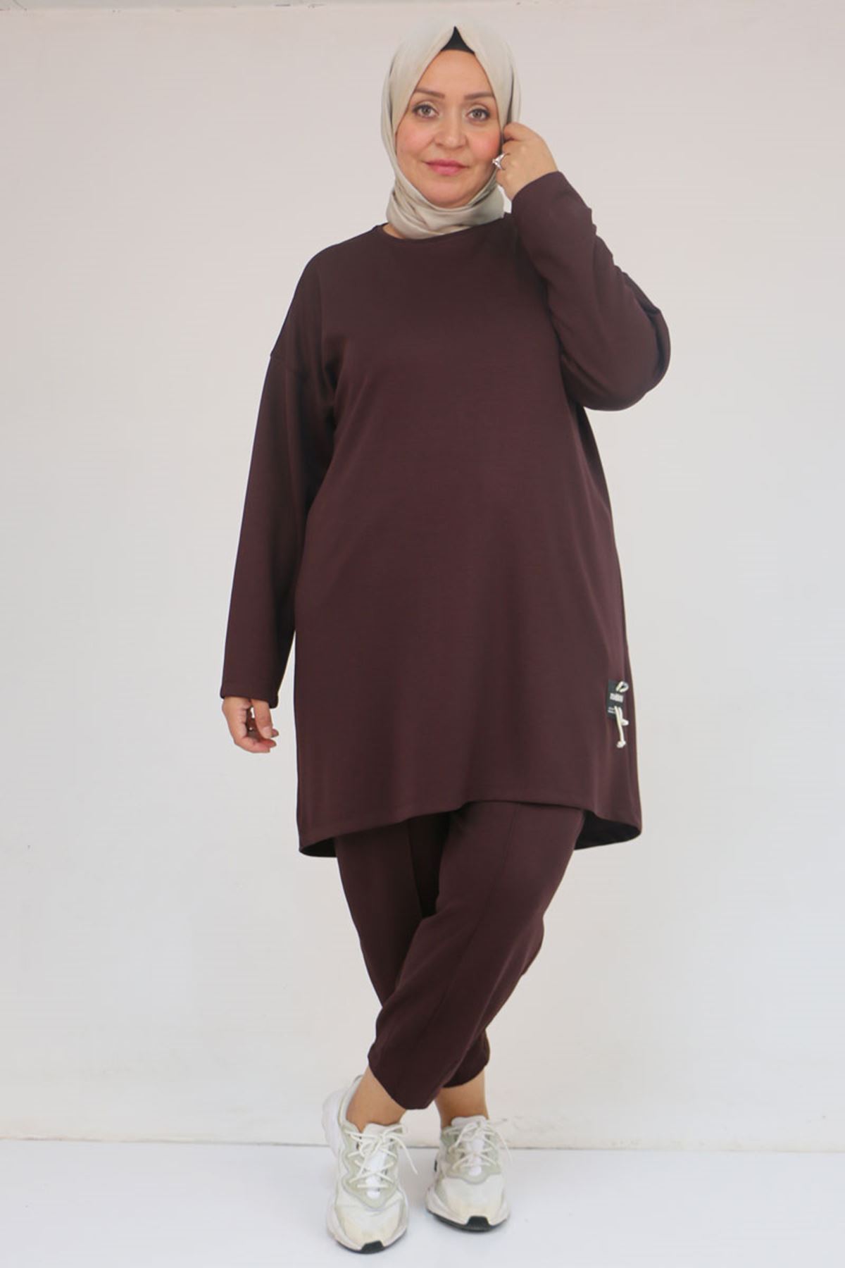 47095 Büyük Beden Yan Tarafı Arma Detaylı Modal Pantolonlu Takım - Kahve