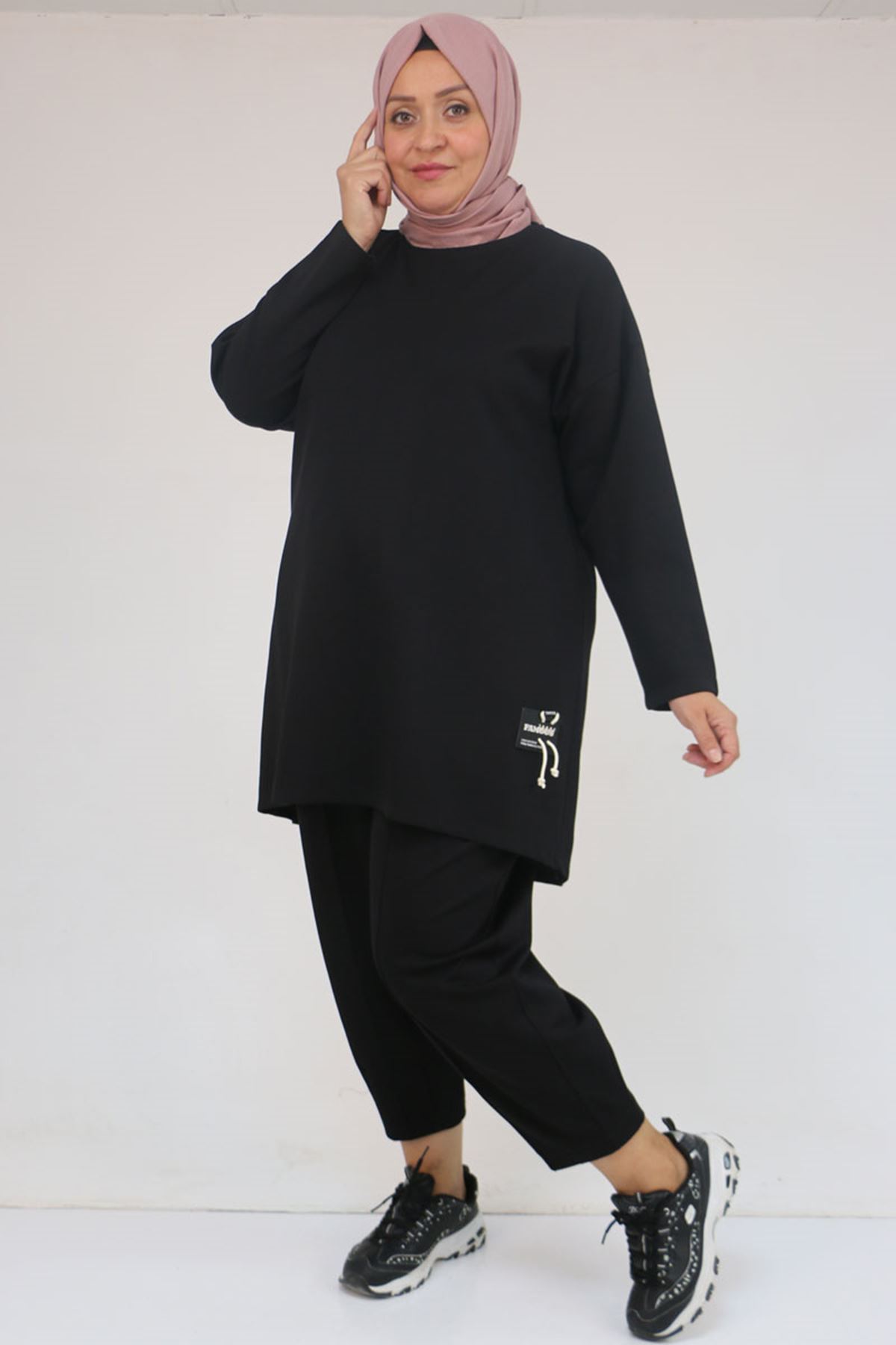 47095 Büyük Beden Yan Tarafı Arma Detaylı Modal Pantolonlu Takım - Siyah