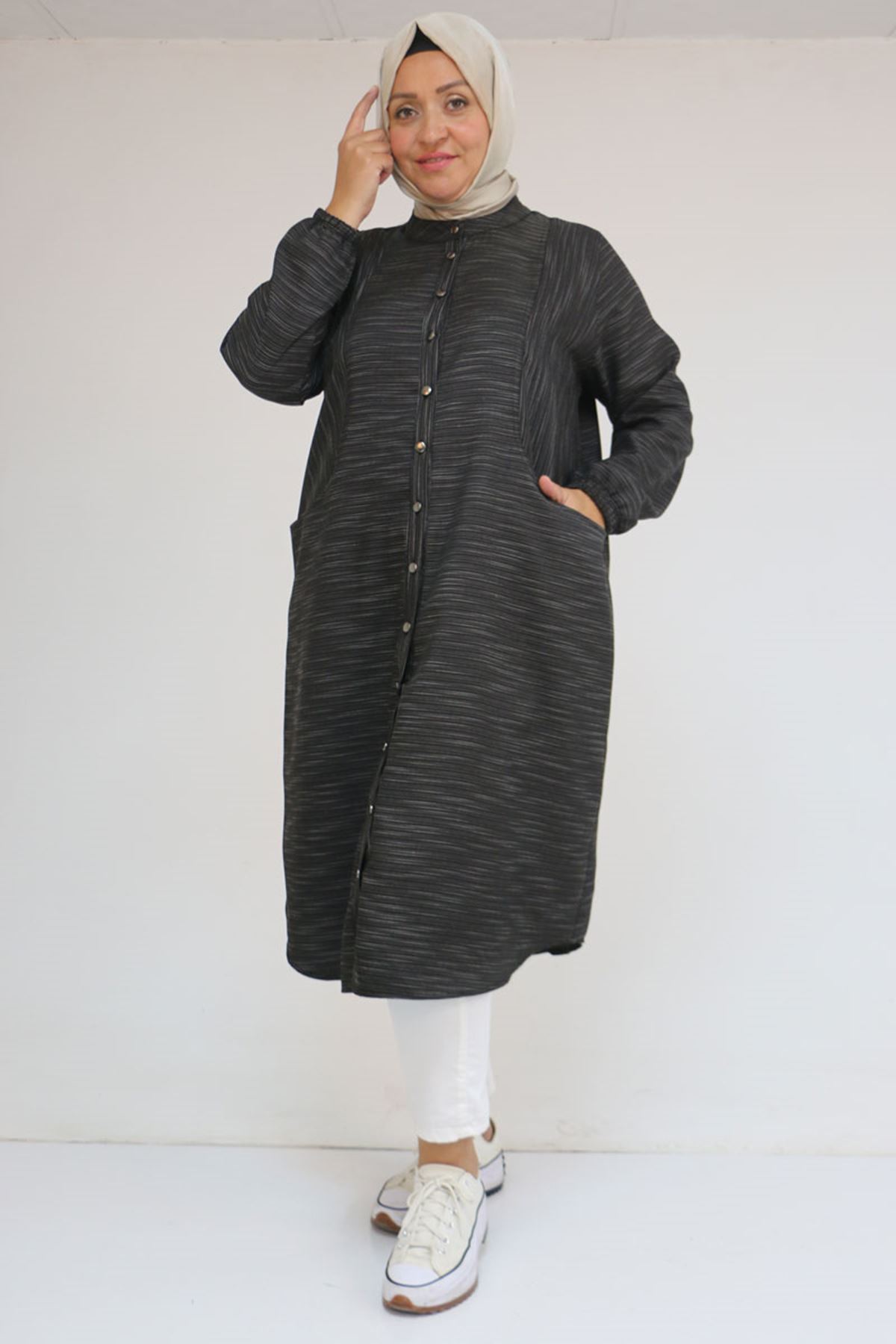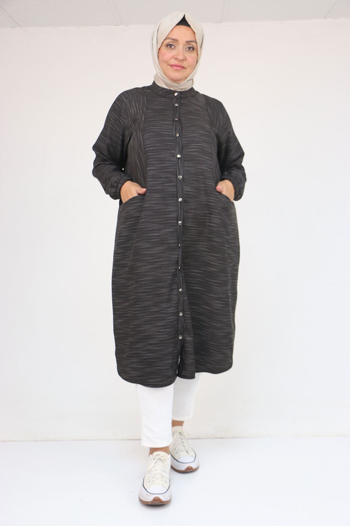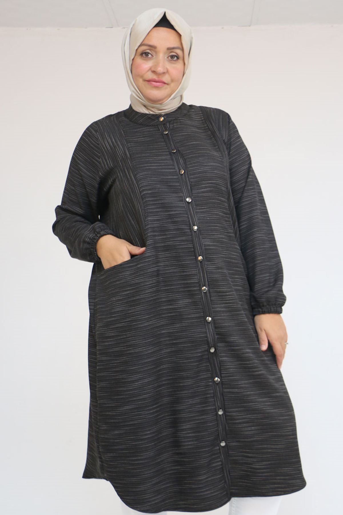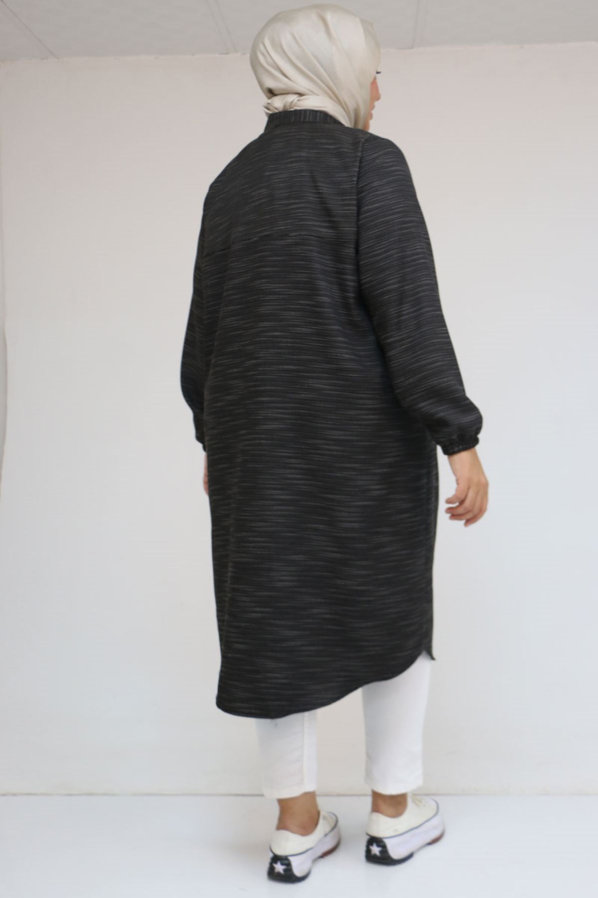 48072 Büyük Beden Kolları Lastikli Tunik - Siyah Kırçıllı