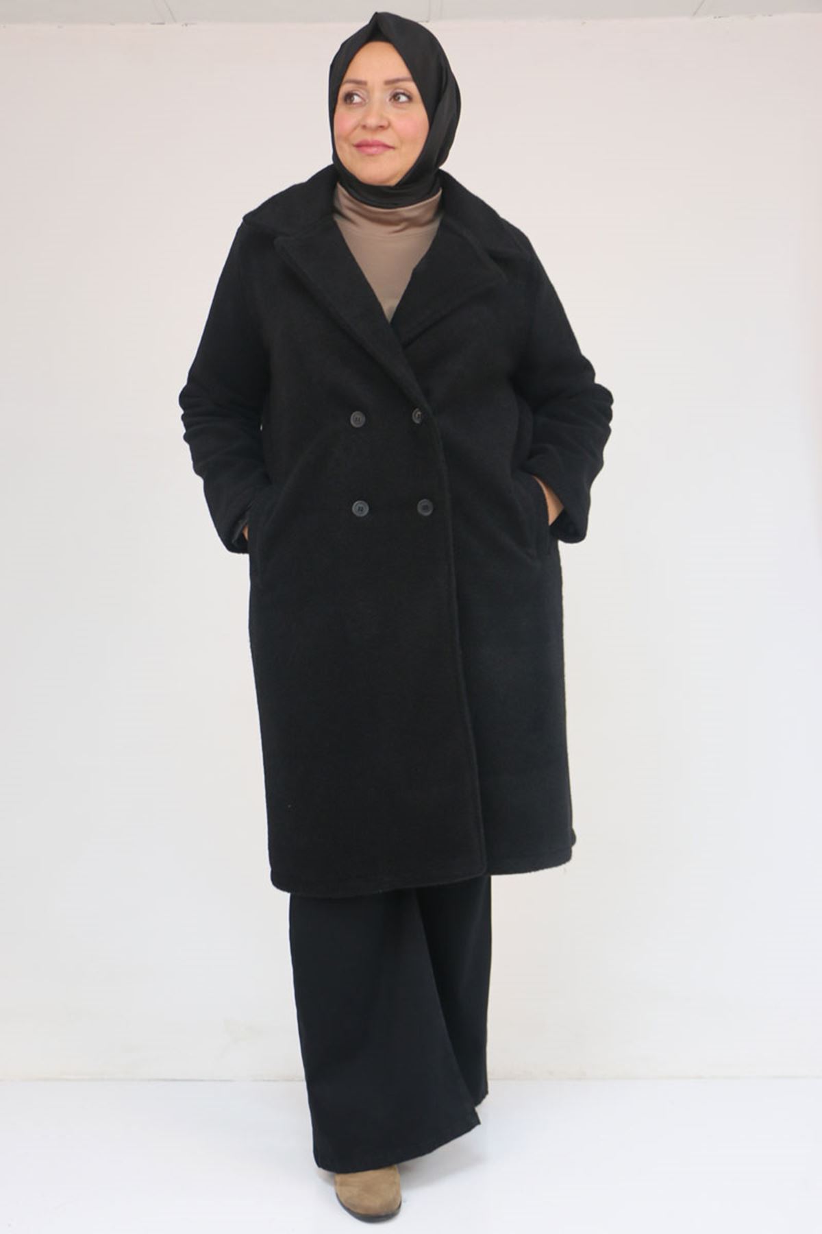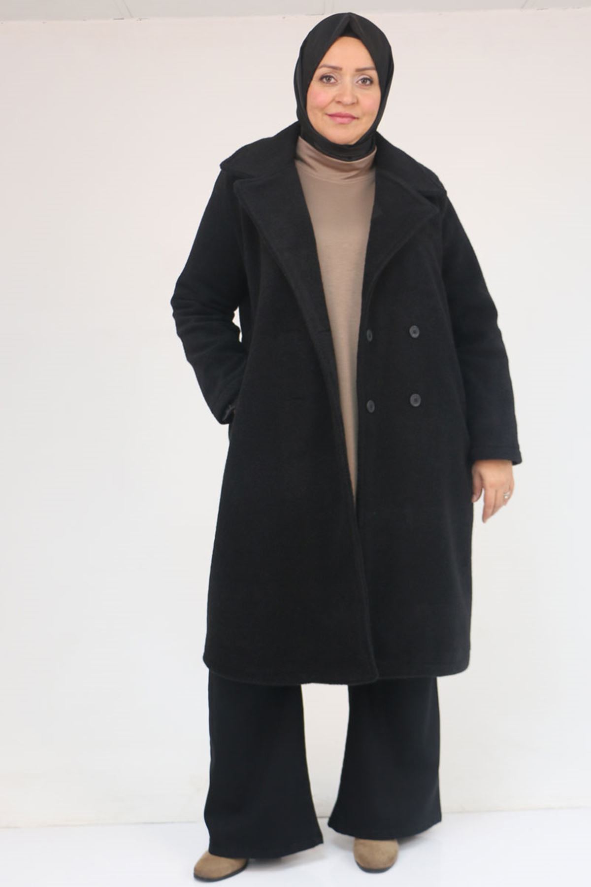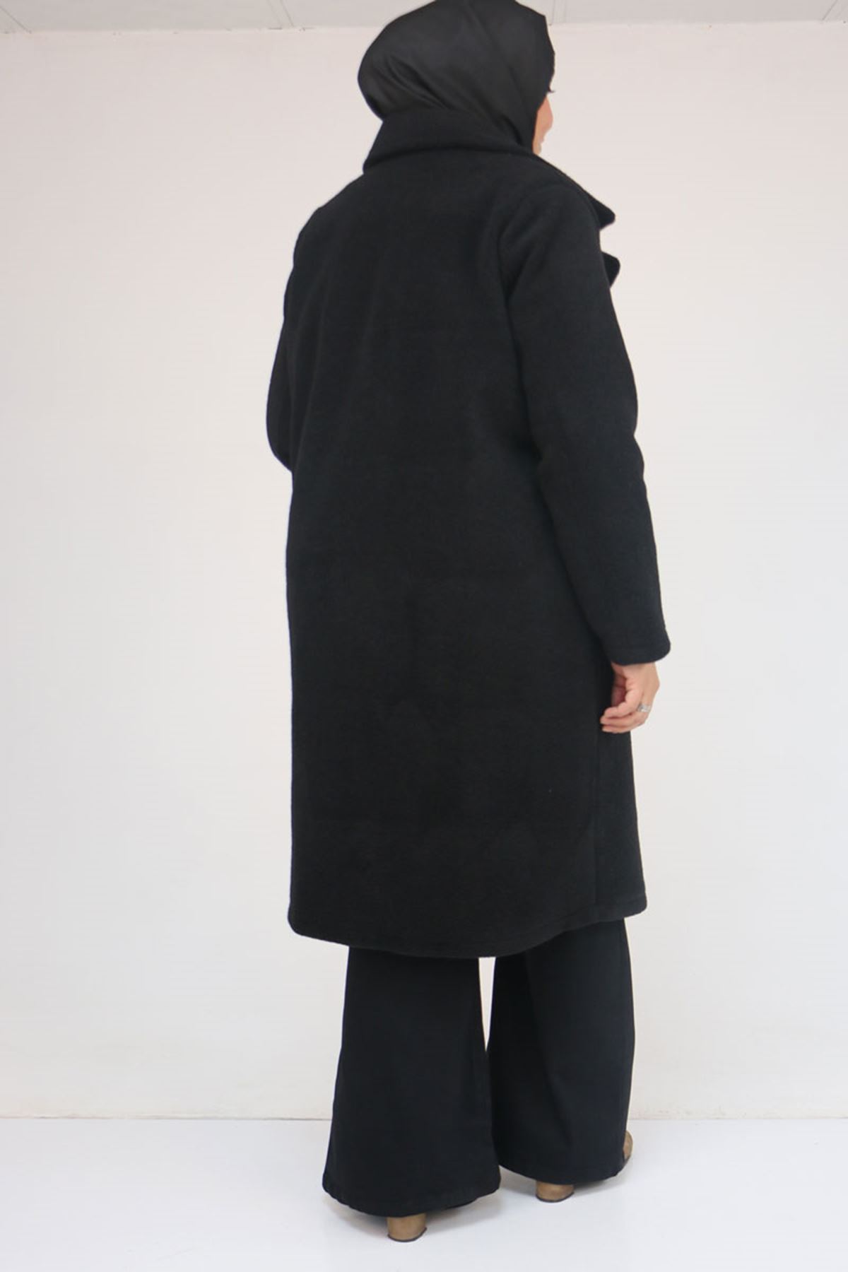 33059 Büyük Beden Düğme Detaylı Keçe Kaban - Siyah