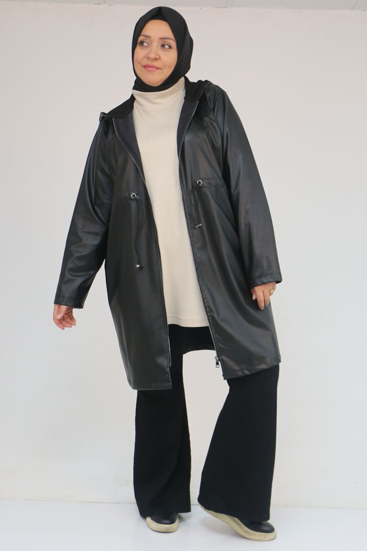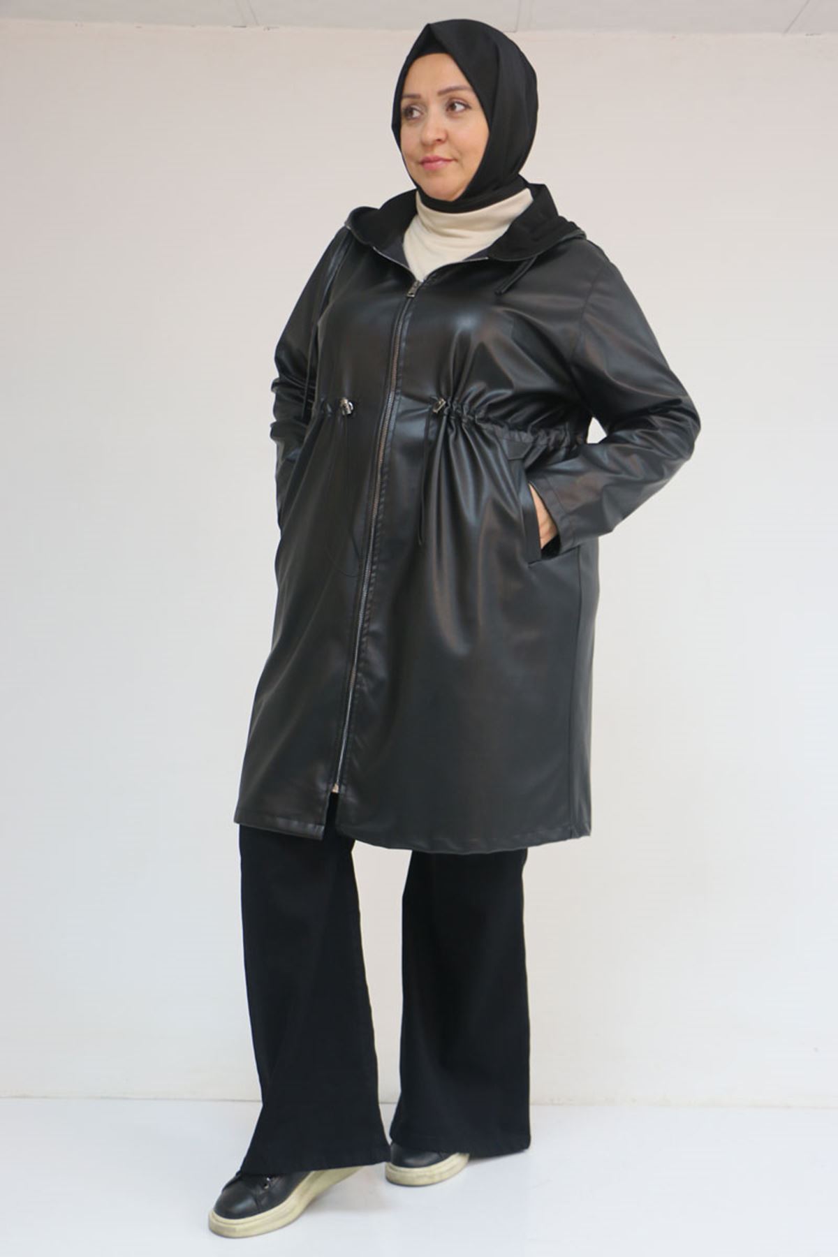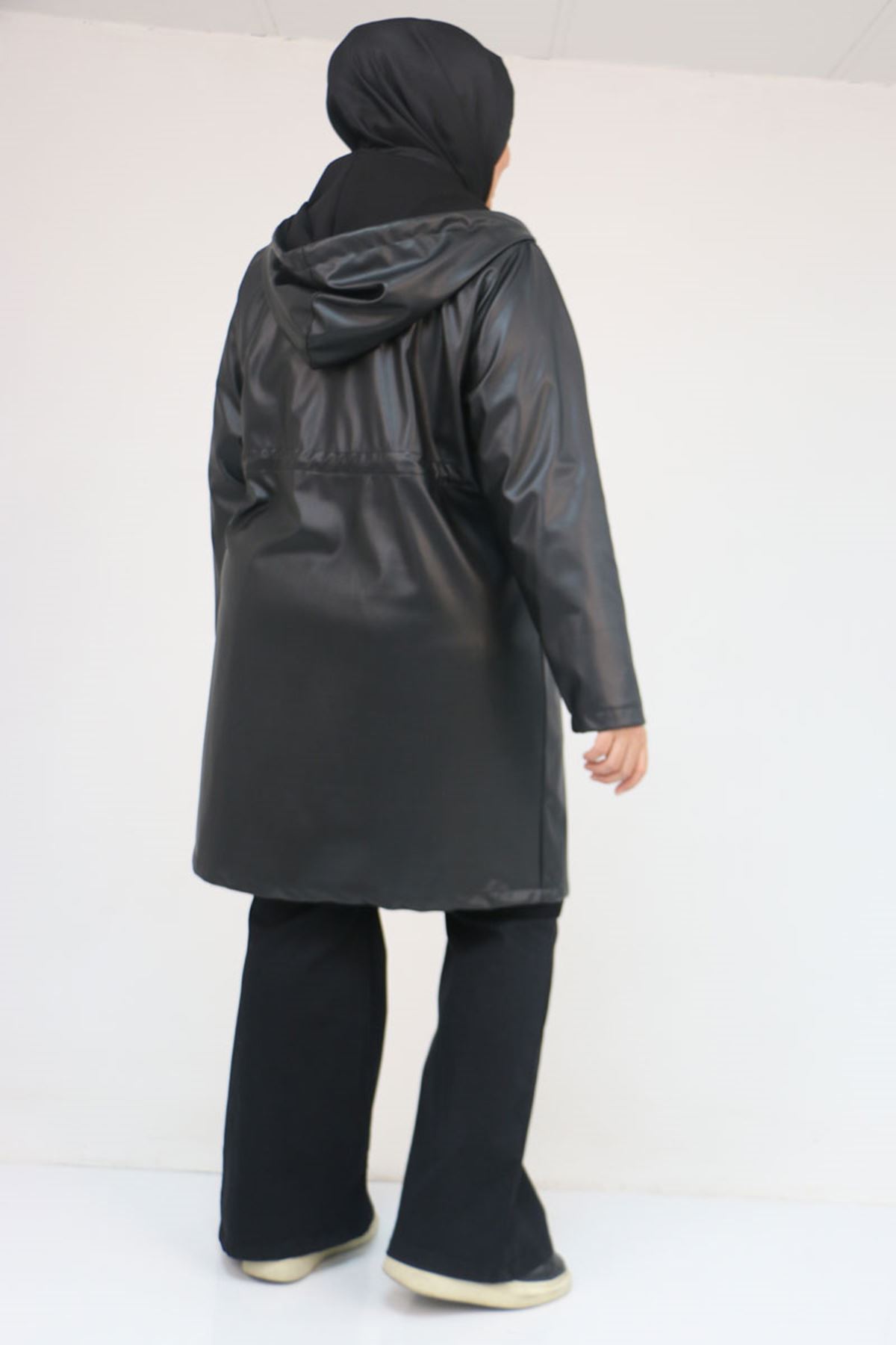 53055 Büyük Beden Bebe Lastik Detaylı Zara Deri Trençkot - Siyah