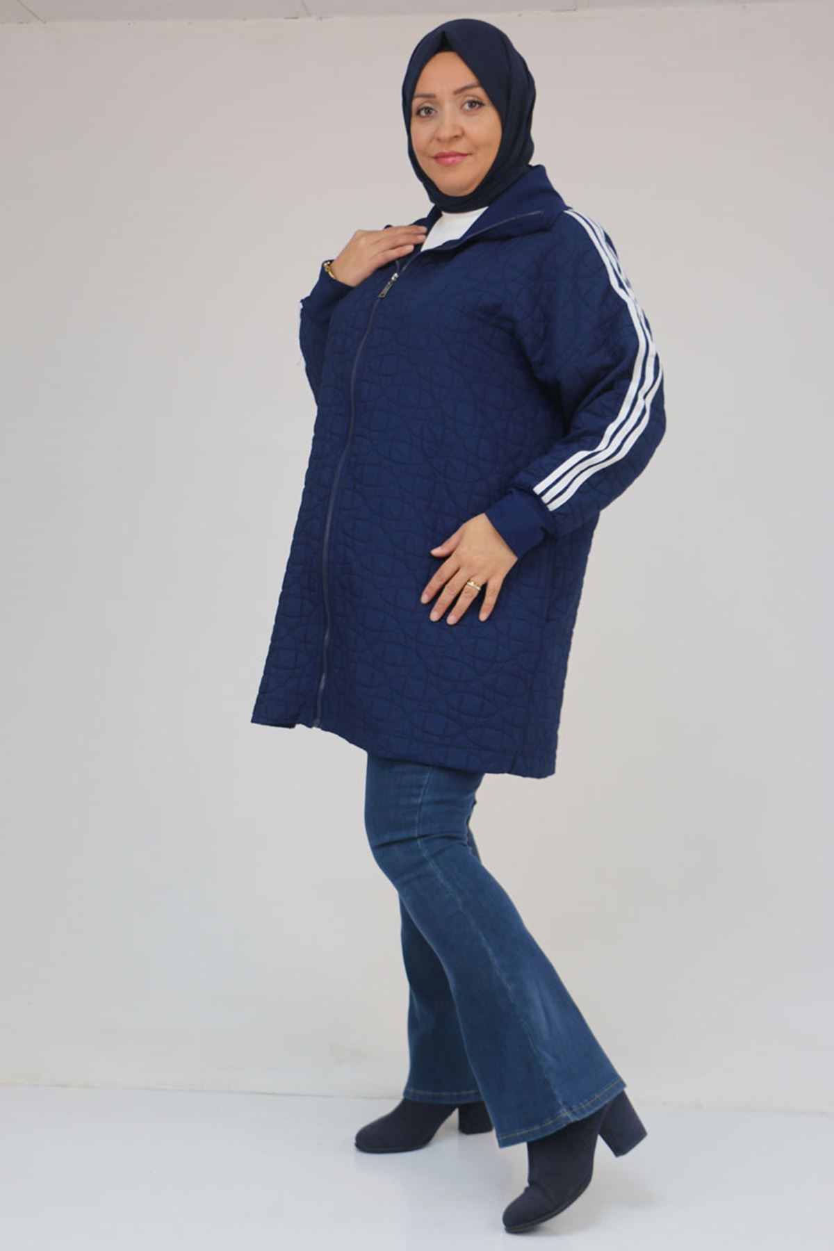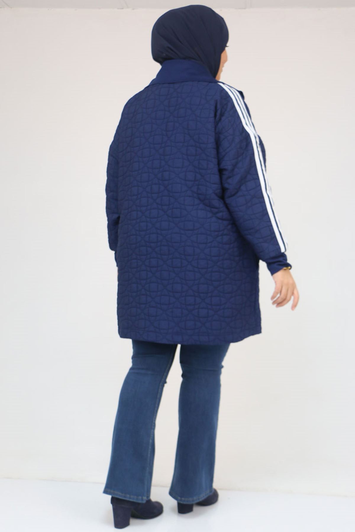 53060 Büyük Beden Omuzdan Şeritli Kapitone Fermuarlı Ceket - İndigo-Beyaz